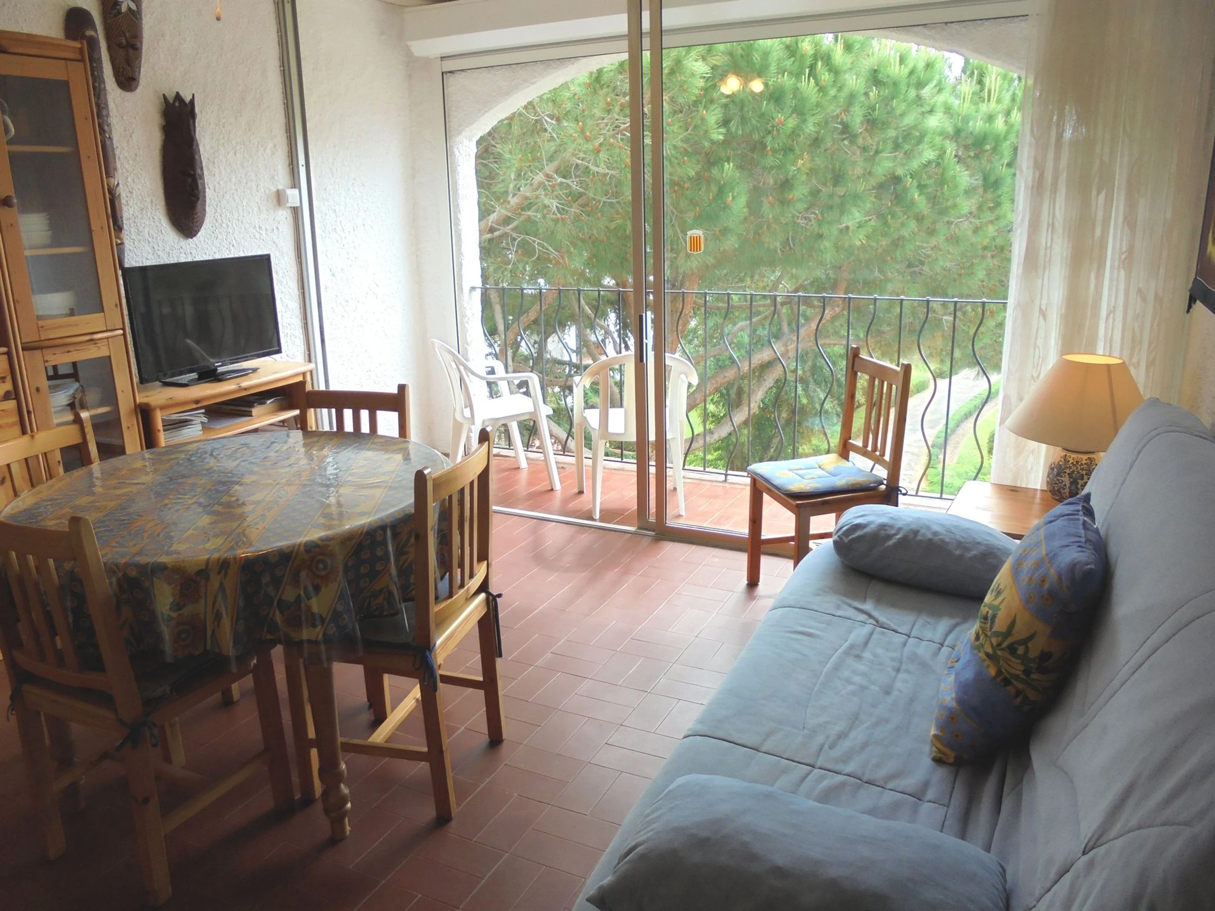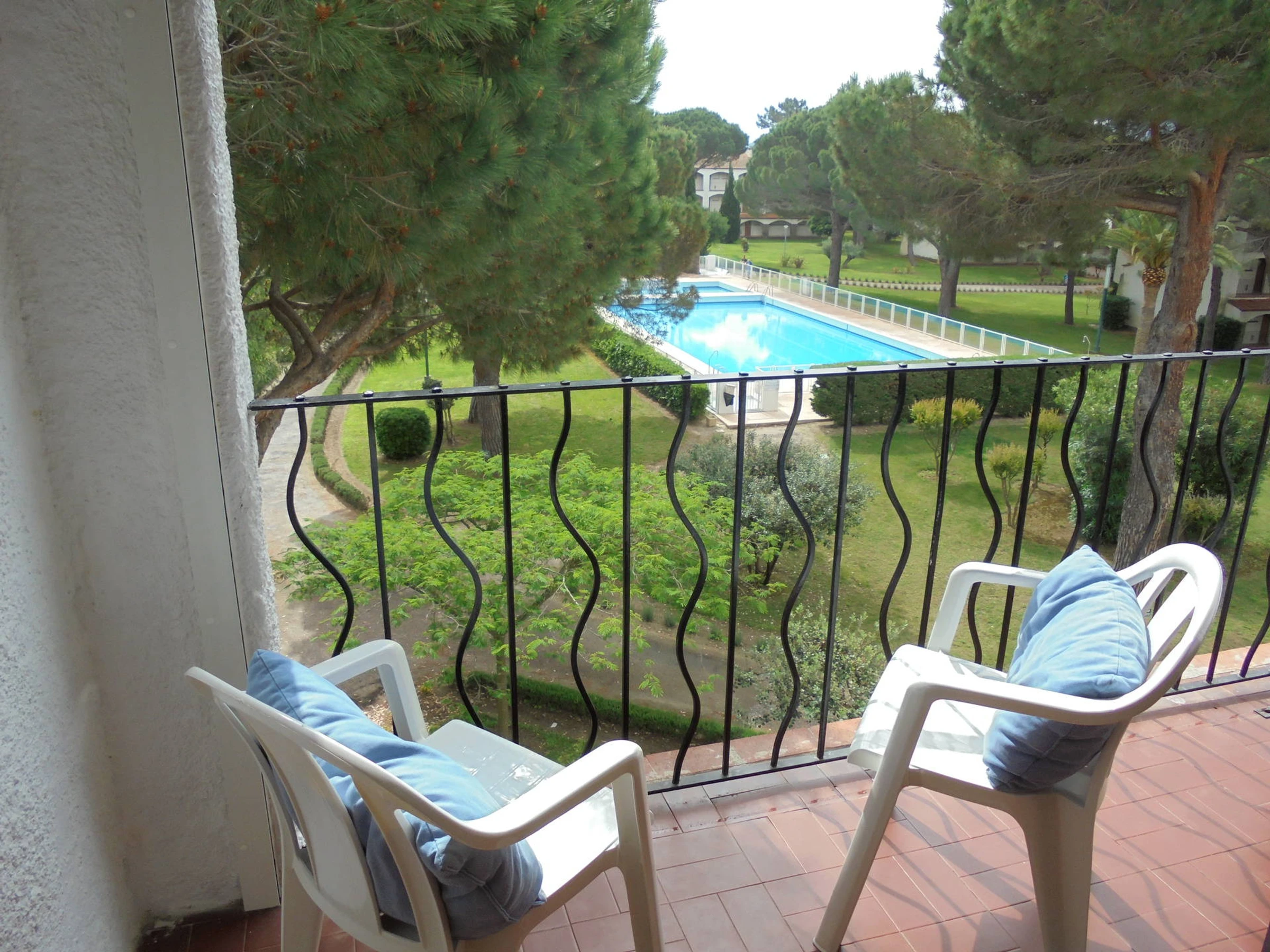 SALÓN: 1 sofá cama doble, TV, balcón frente a la piscina