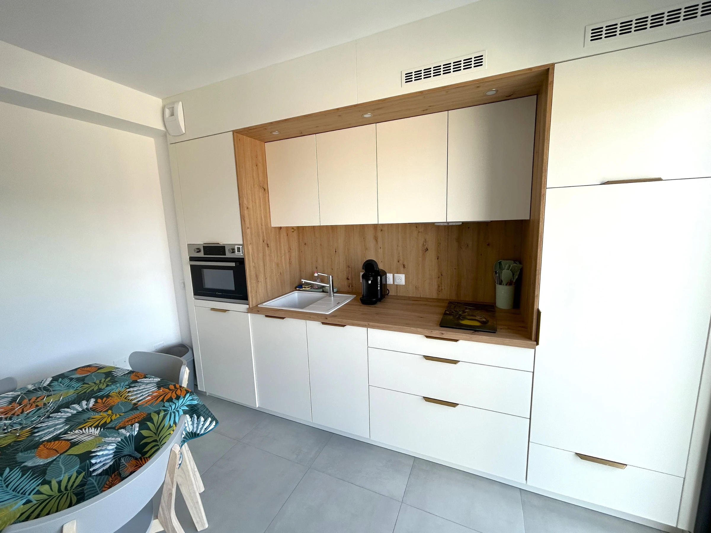 Cuenta con un salón con cocina americana totalmente equipada: frigorífico/congelador, 2 placas de inducción, microondas/horno combinado, lavadora y lavavajillas.