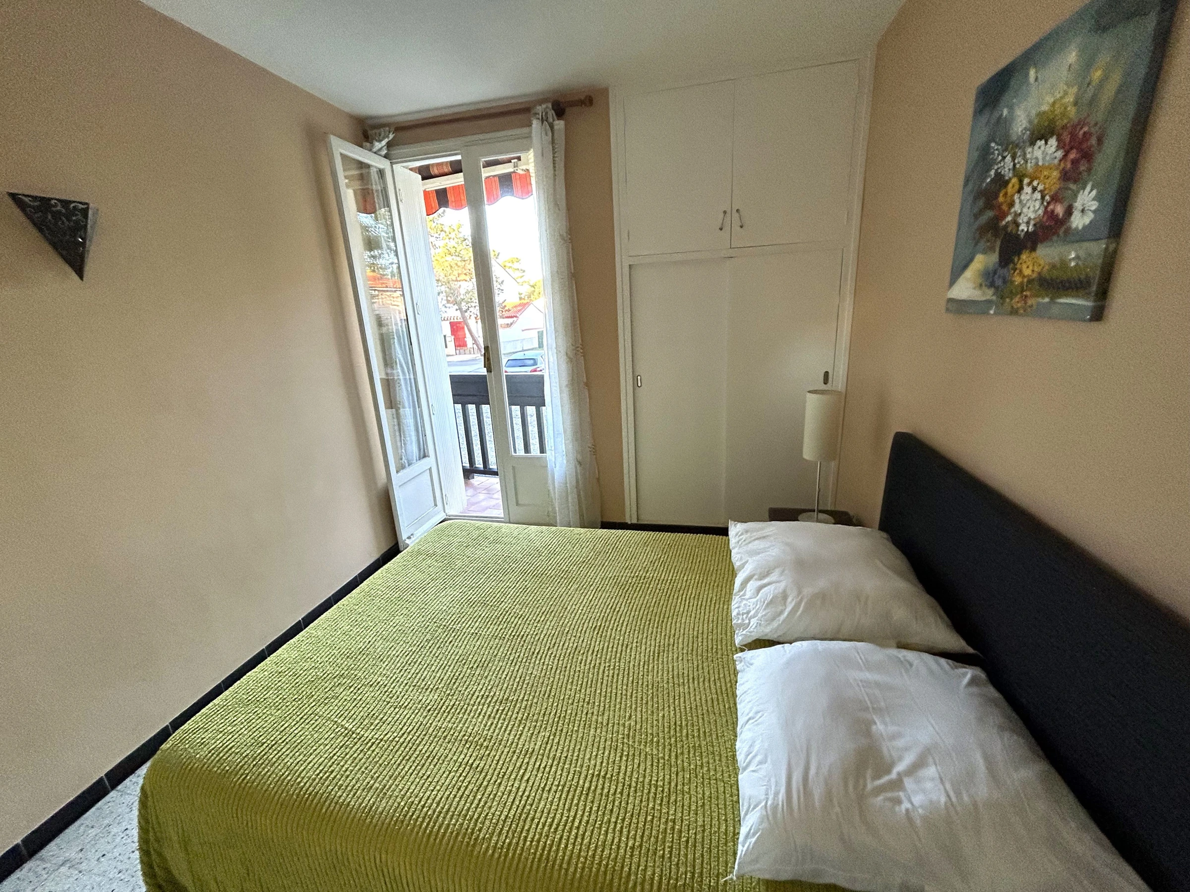 El apartamento se encuentra en la primera planta de una residencia cerca de la playa. Tiene capacidad para cuatro personas: un sofá cama doble en el salón y una cama doble en el dormitorio. Está equipado con nevera, dos placas eléctricas, microondas, lavadora y televisión. También cuenta con un balcón de 4 m² con orientación oeste (con toldo) y aparcamiento comunitario disponible a los pies del edificio.