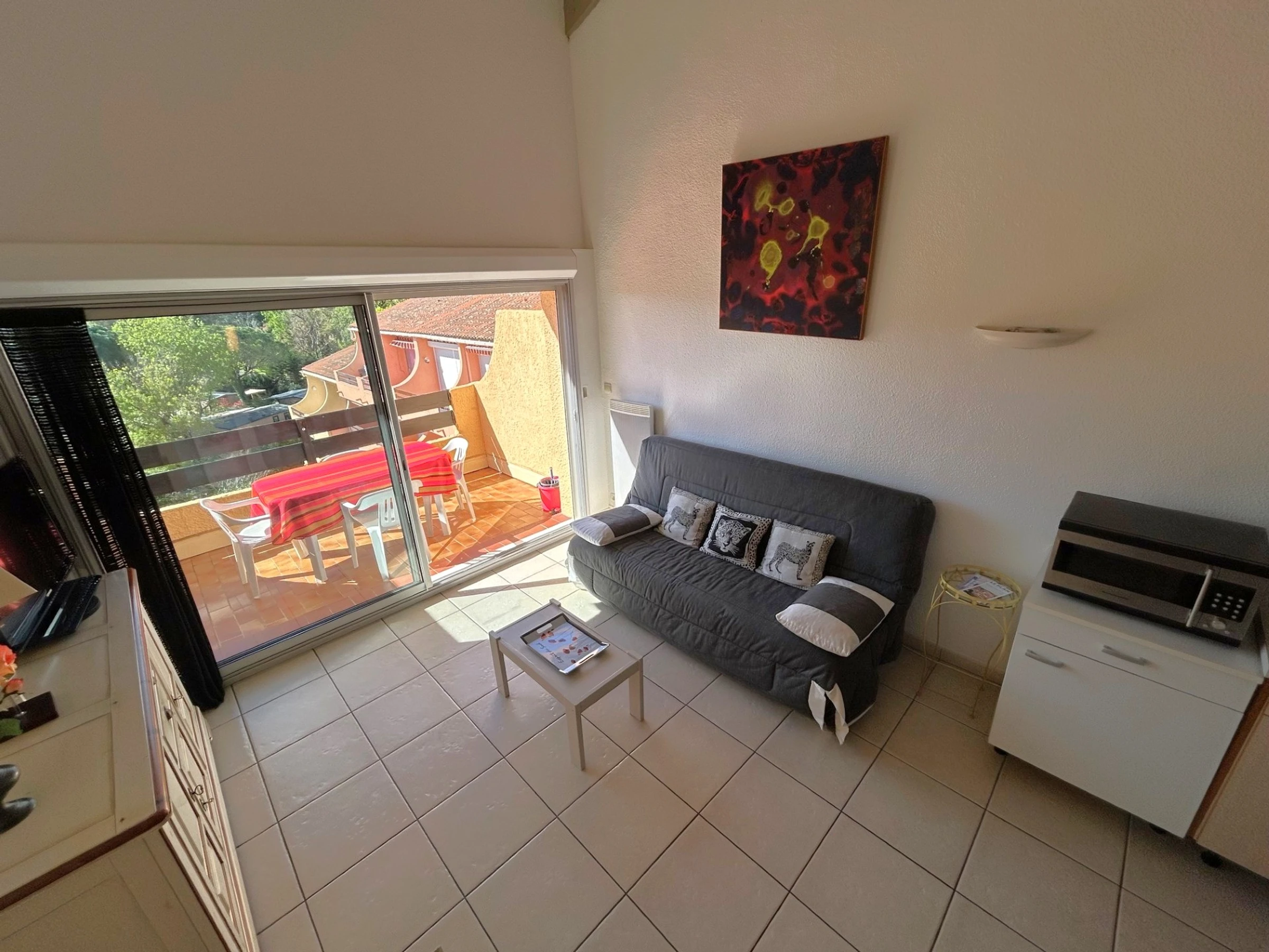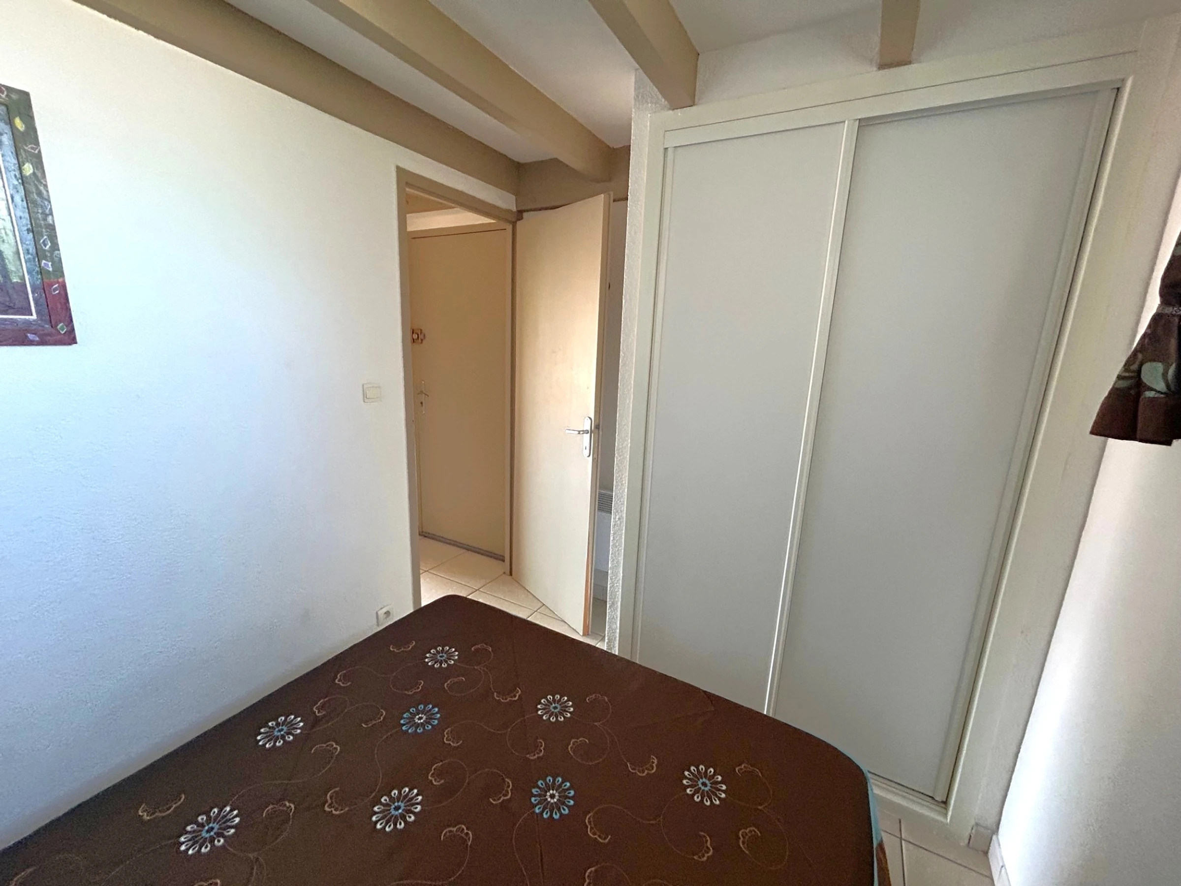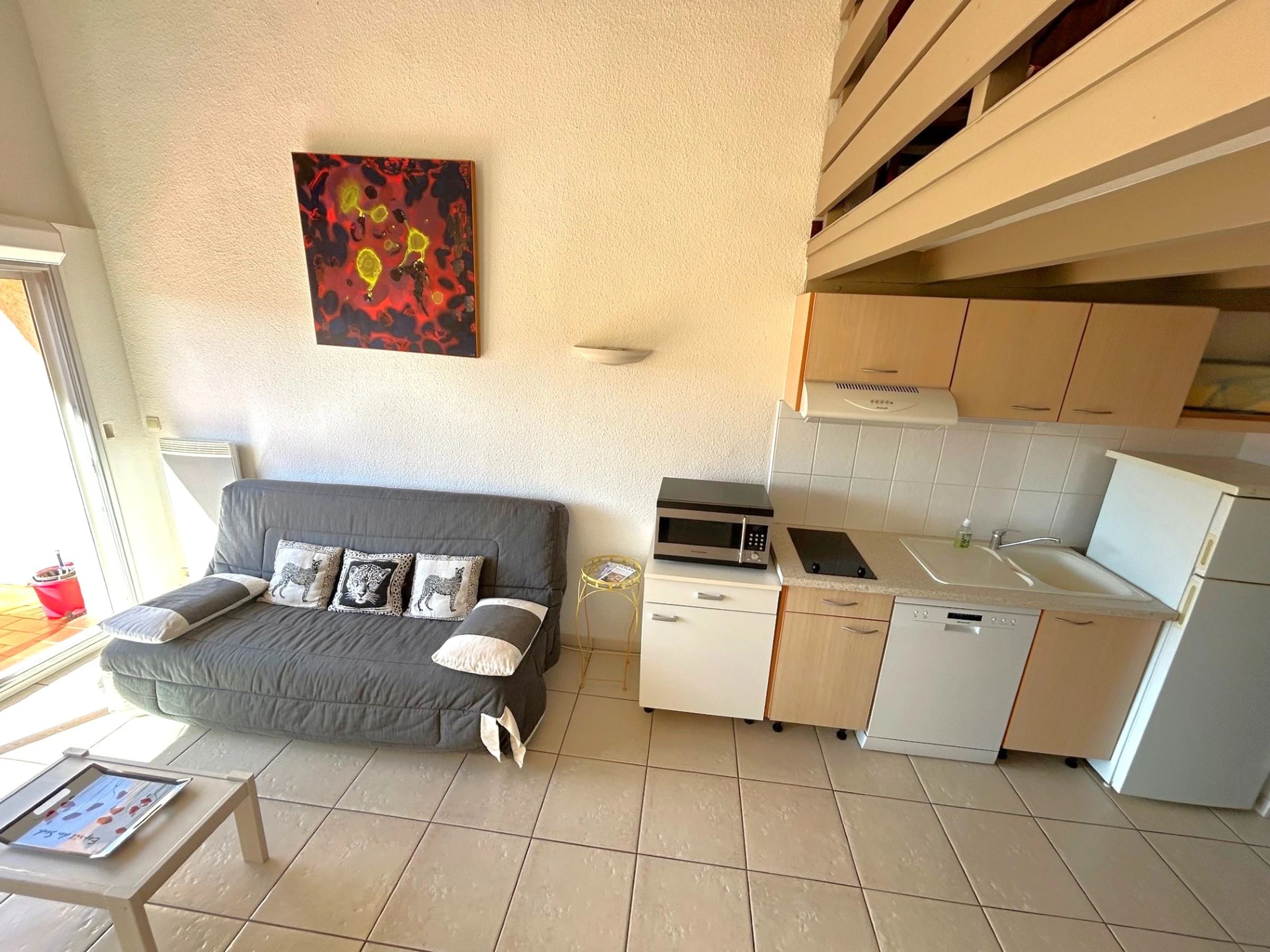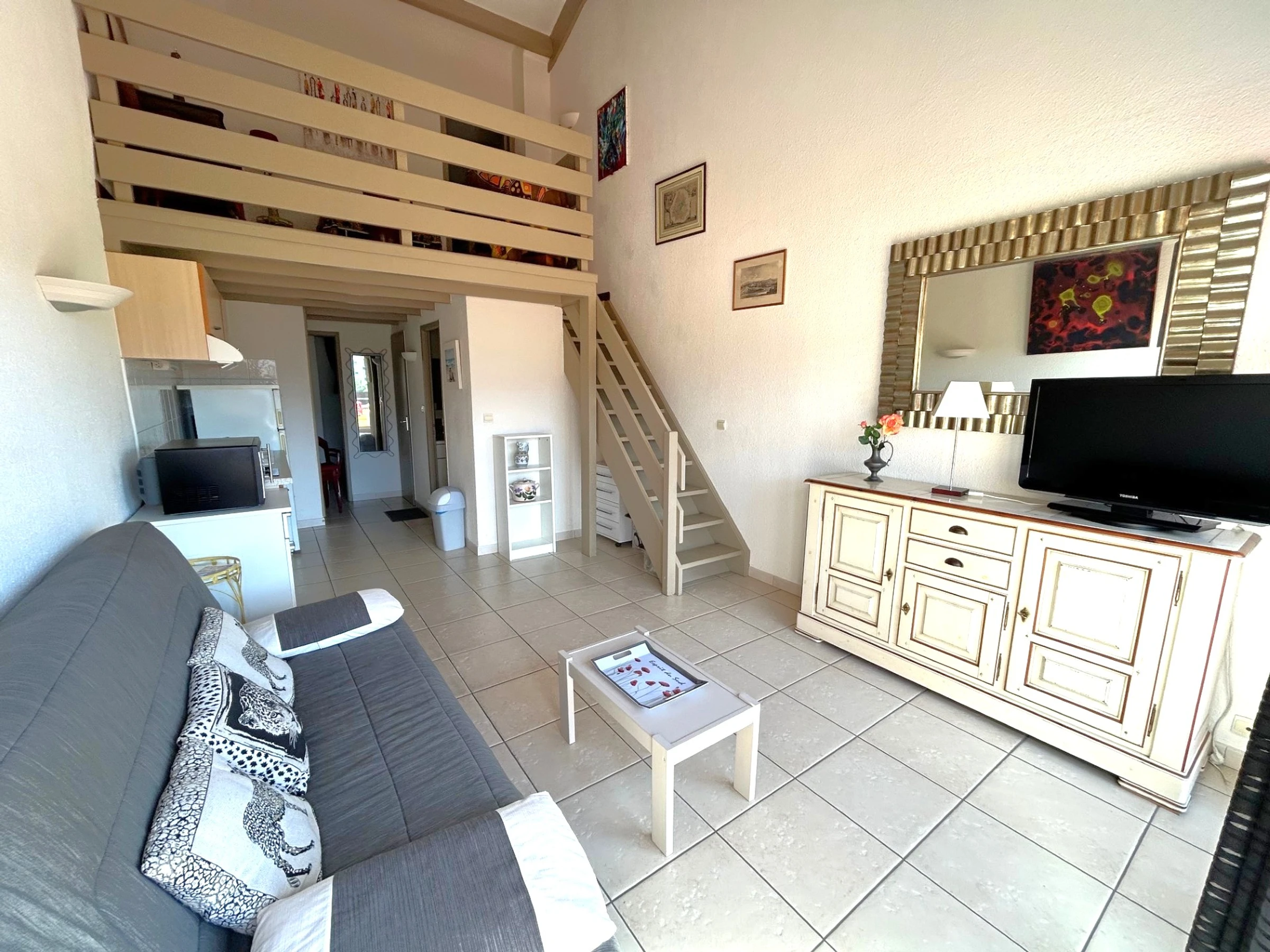 El apartamento está situado en la 4ª planta de una residencia a 350 m de la playa, que cuenta con piscina. Dispone de una cama doble (140 x 190 cm) en el dormitorio principal, otra cama doble (140 x 190 cm) en el dormitorio de la planta superior y un sofá cama doble en el salón. El apartamento está equipado con frigorífico/congelador, vitrocerámica, microondas, lavavajillas, lavadora y televisión. Además, cuenta con un balcón de 6 m² orientado al sur con toldo y una plaza de aparcamiento privada.