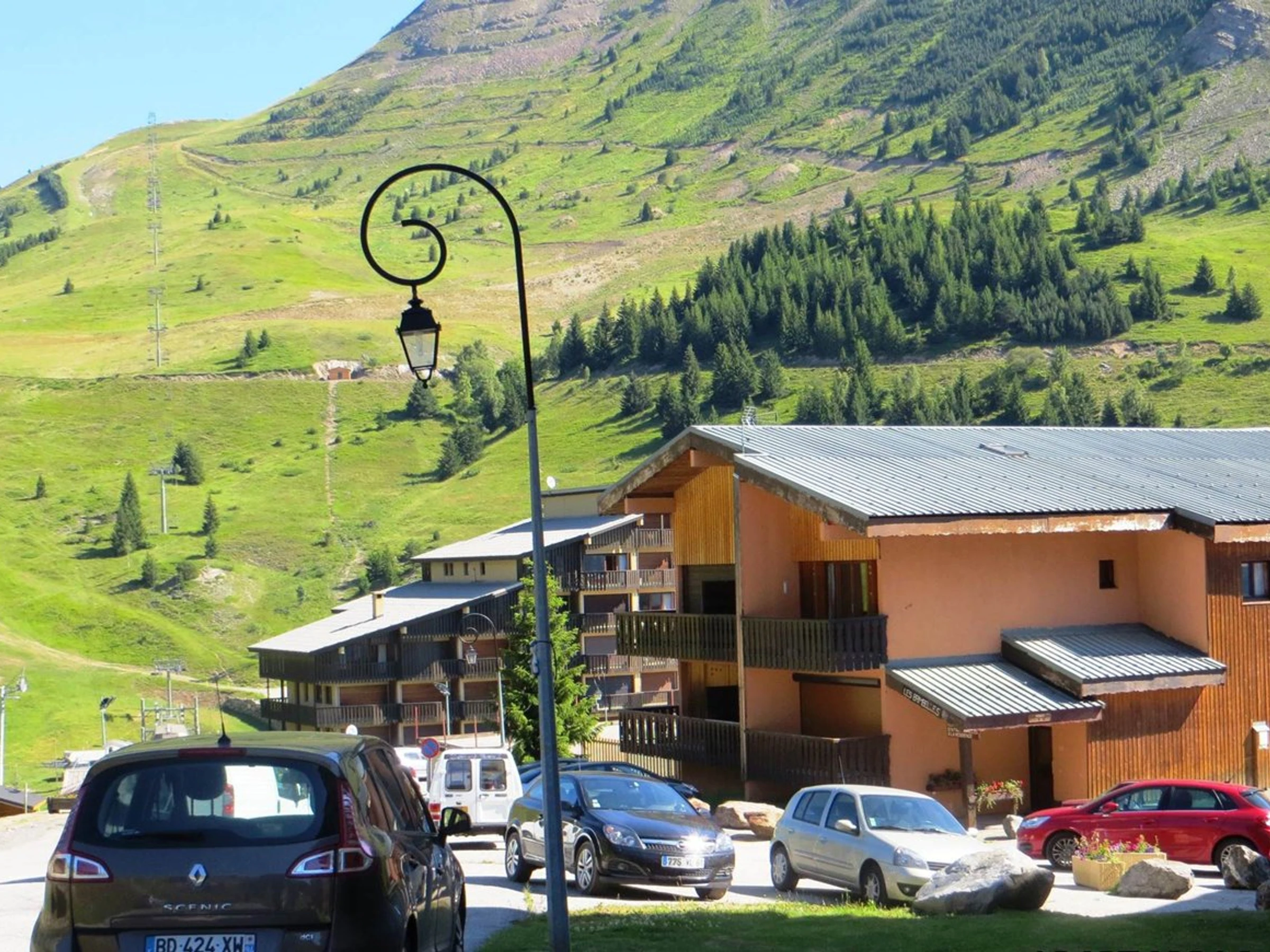 Cómodo estudio con vistas a las pistas. El balcón está amueblado con muebles de jardín para disfrutar de la hermosa vista panorámica de la sierra de Écrins.