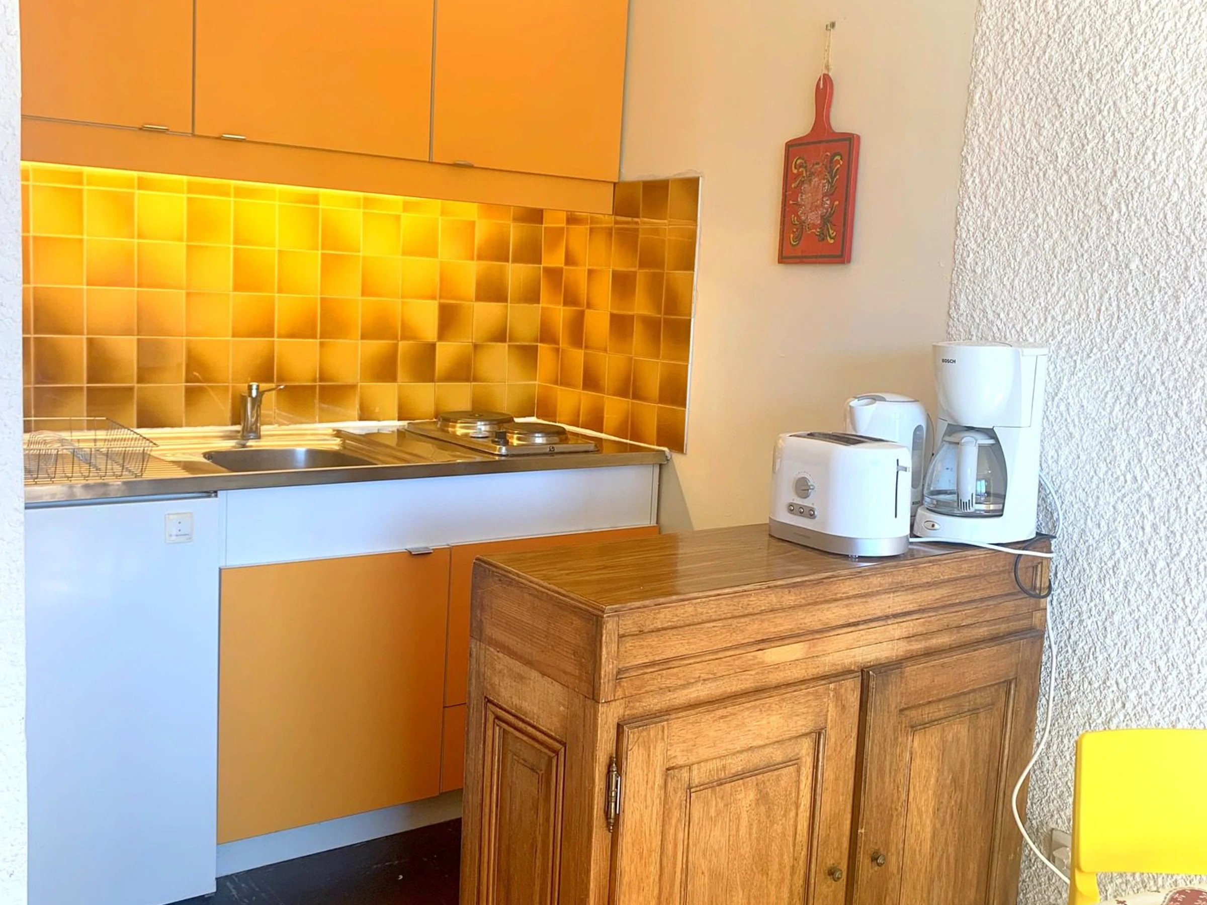 Séjour, sol plastice, canapé BZ (140), tv écran plat ; Cocina con monedas: placas électriques, cuatro multifunción (microondas + cuatro).