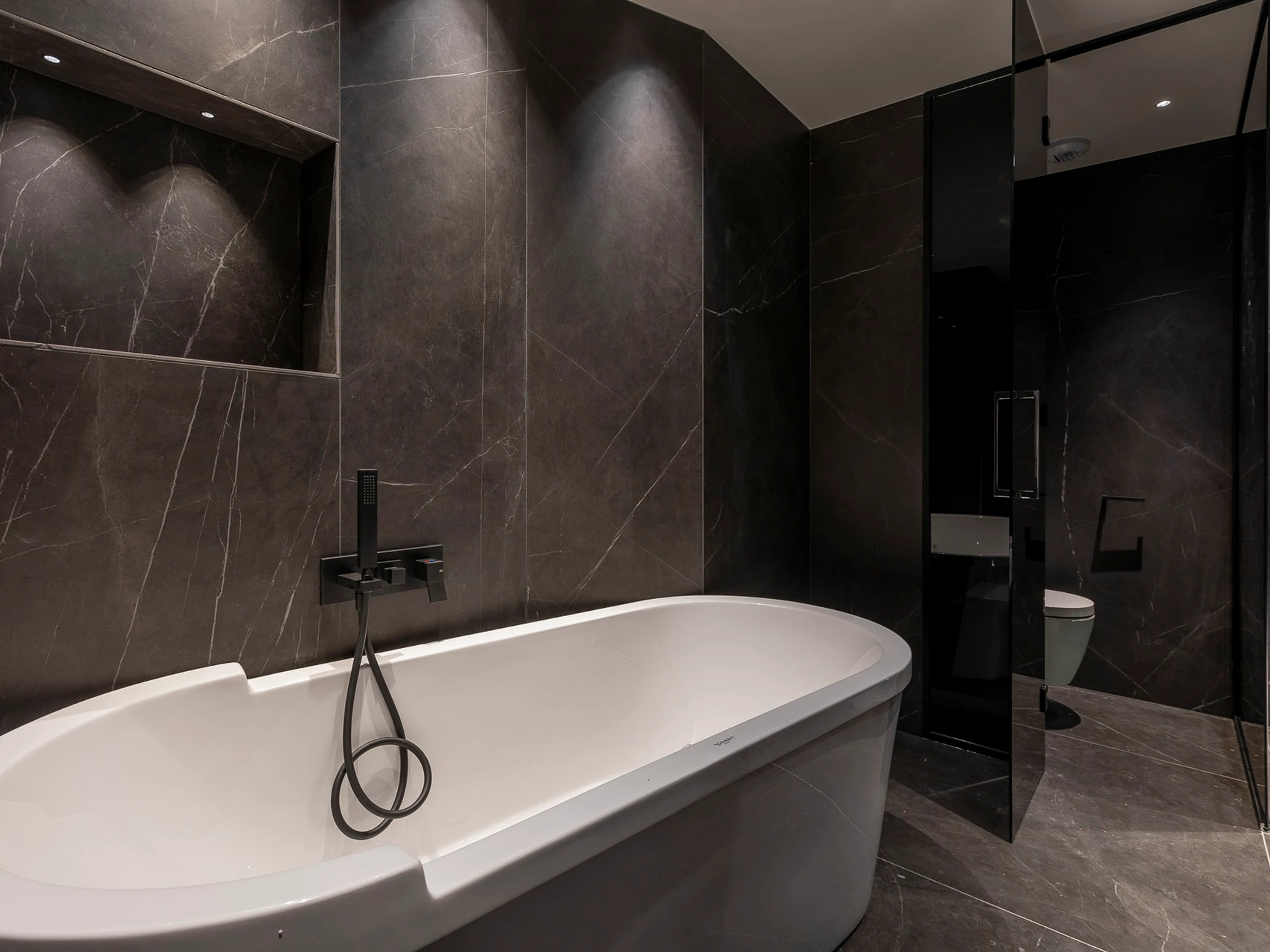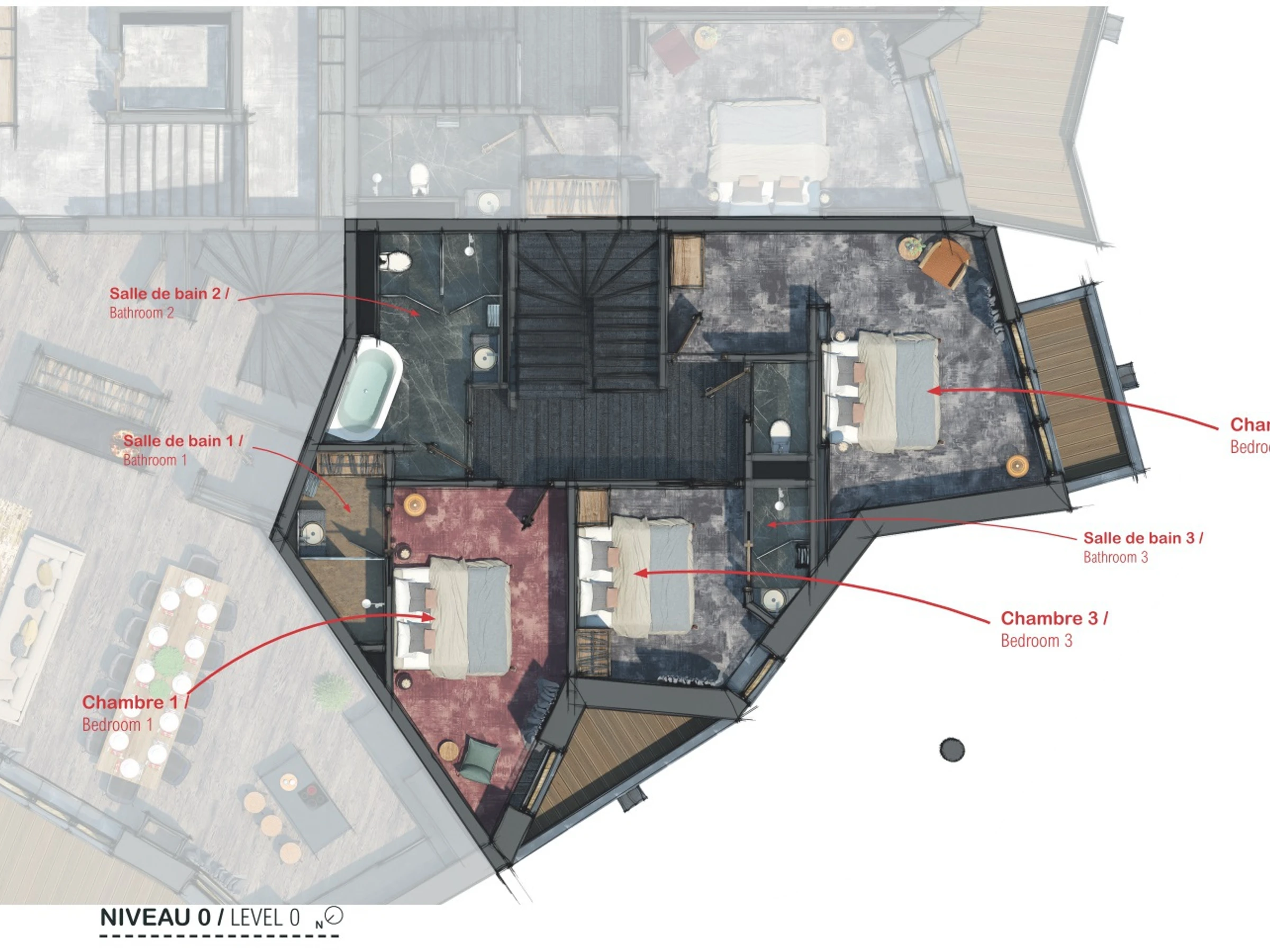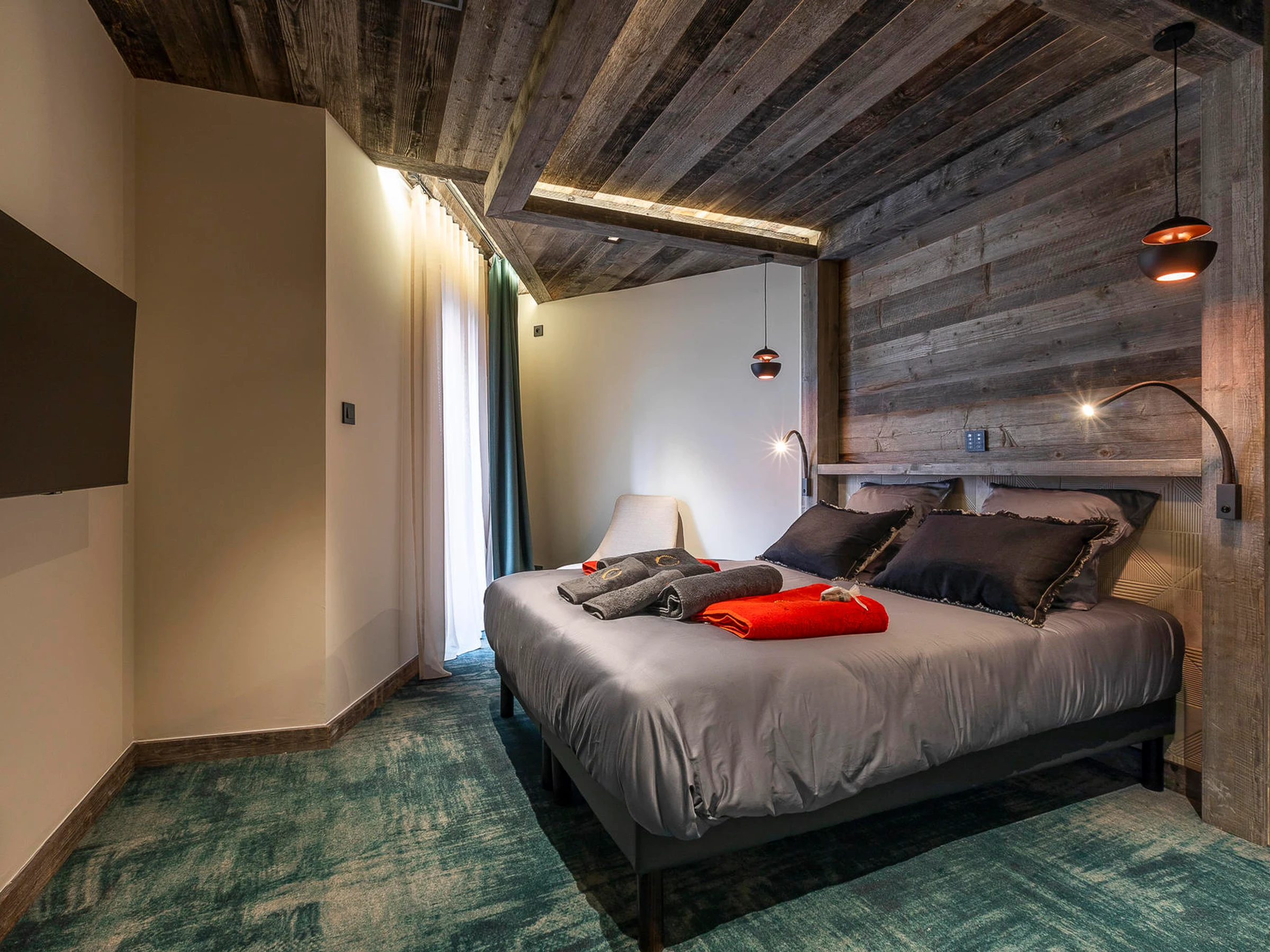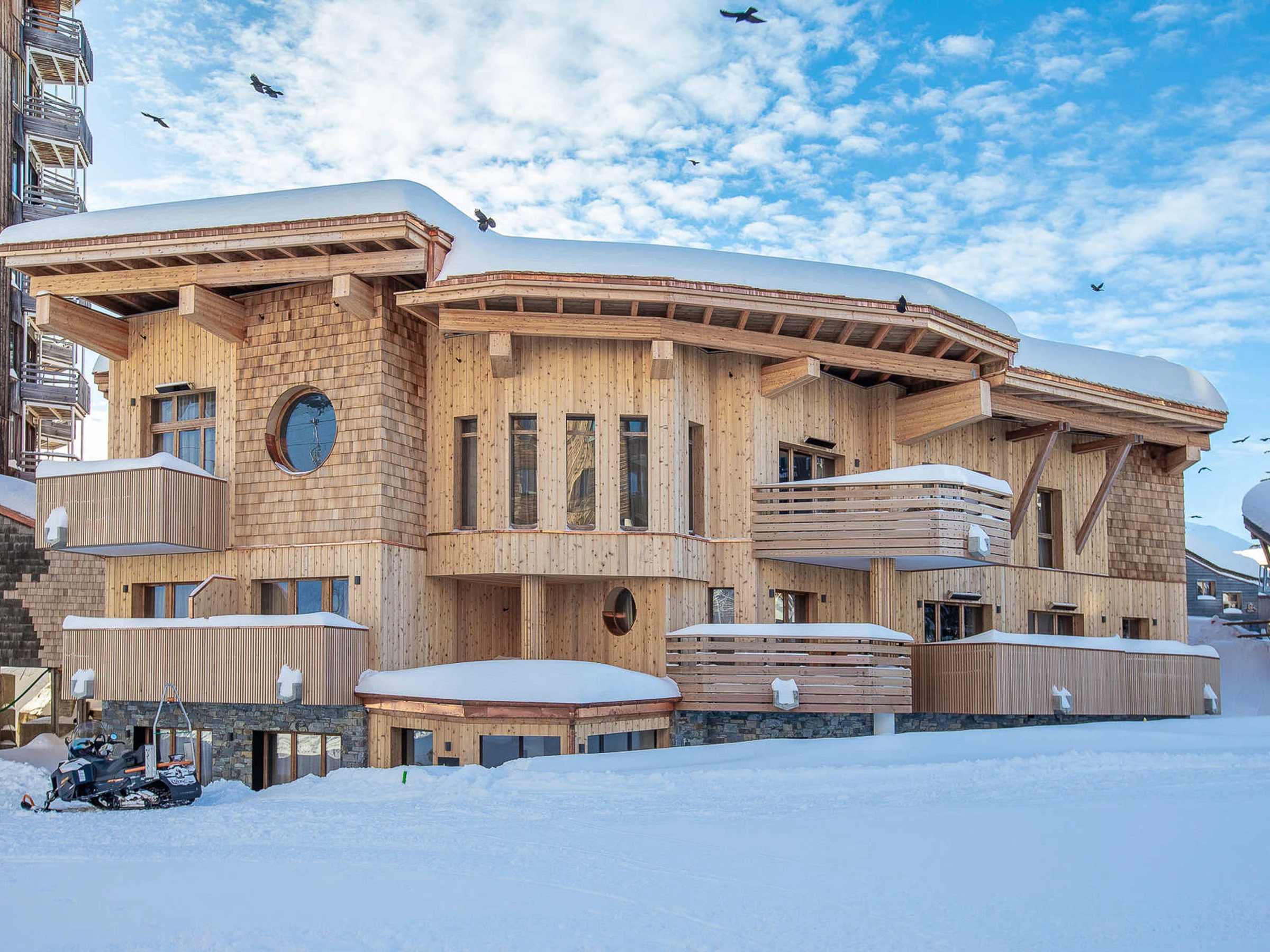 El interior de la residencia tiene un estilo alpino elegante con madera y materiales contemporáneos como vidrio, cobre y acero. Los muebles seleccionados por Nathalie de Breda presentan principalmente referencias francesas y europeas y los revestimientos de las paredes y las telas están hechos por artesanos locales. Las zonas comunes de más de 400 m² incluyen una sala de esquí, una piscina, una sala de fitness, un hammam y una sala de masajes con una cama de masaje de arena de cuarzo climatizada.