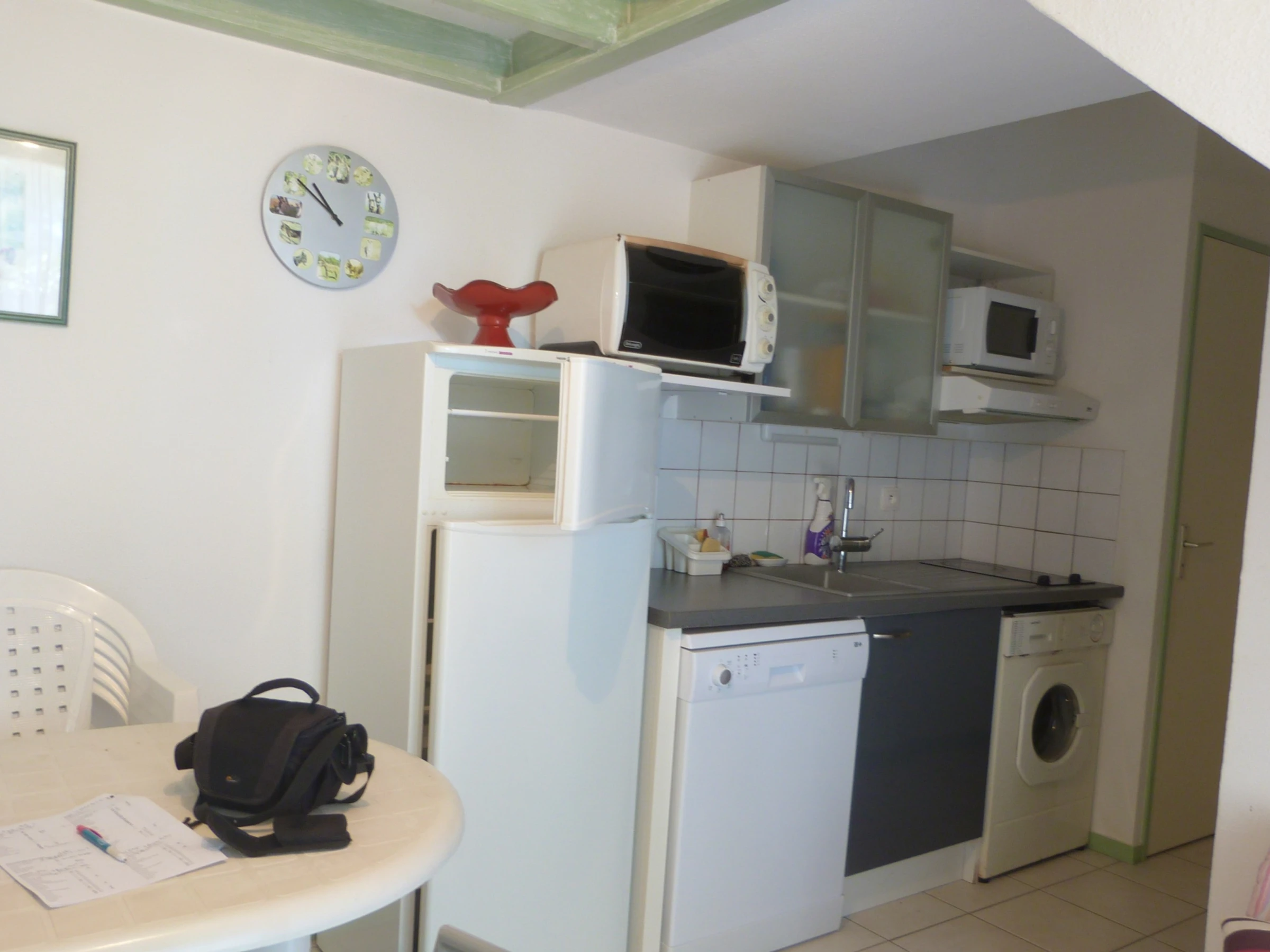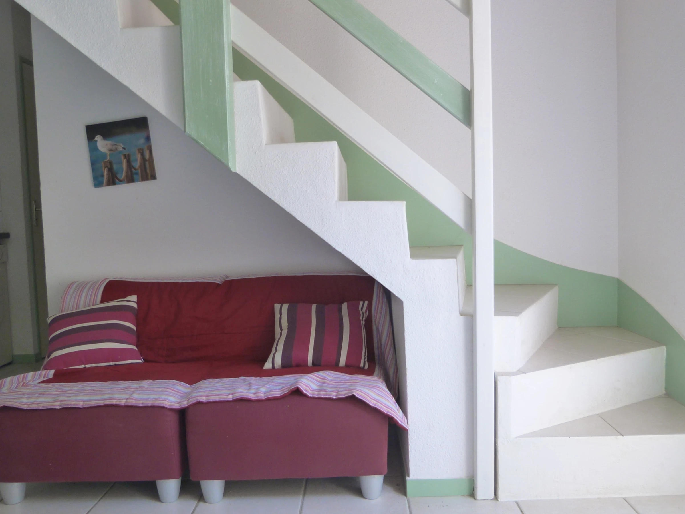Casa estándar de 30 m² en residencia de vacaciones - 5 personas que consta en la planta baja de un salón con cocina americana, un dormitorio con una cama de 140 cm, un aseo y en la planta superior, un dormitorio con 2 literas, un entrepiso con una cama de 90 cm y una cama supletoria de 90 cm y un baño. Lavadora, lavavajillas, horno, microondas, televisión. Jardín cerrado con mobiliario de jardín. Aparcamiento gratuito en la residencia. Se admiten mascotas. Se ofrece una tarifa de limpieza de 95€.