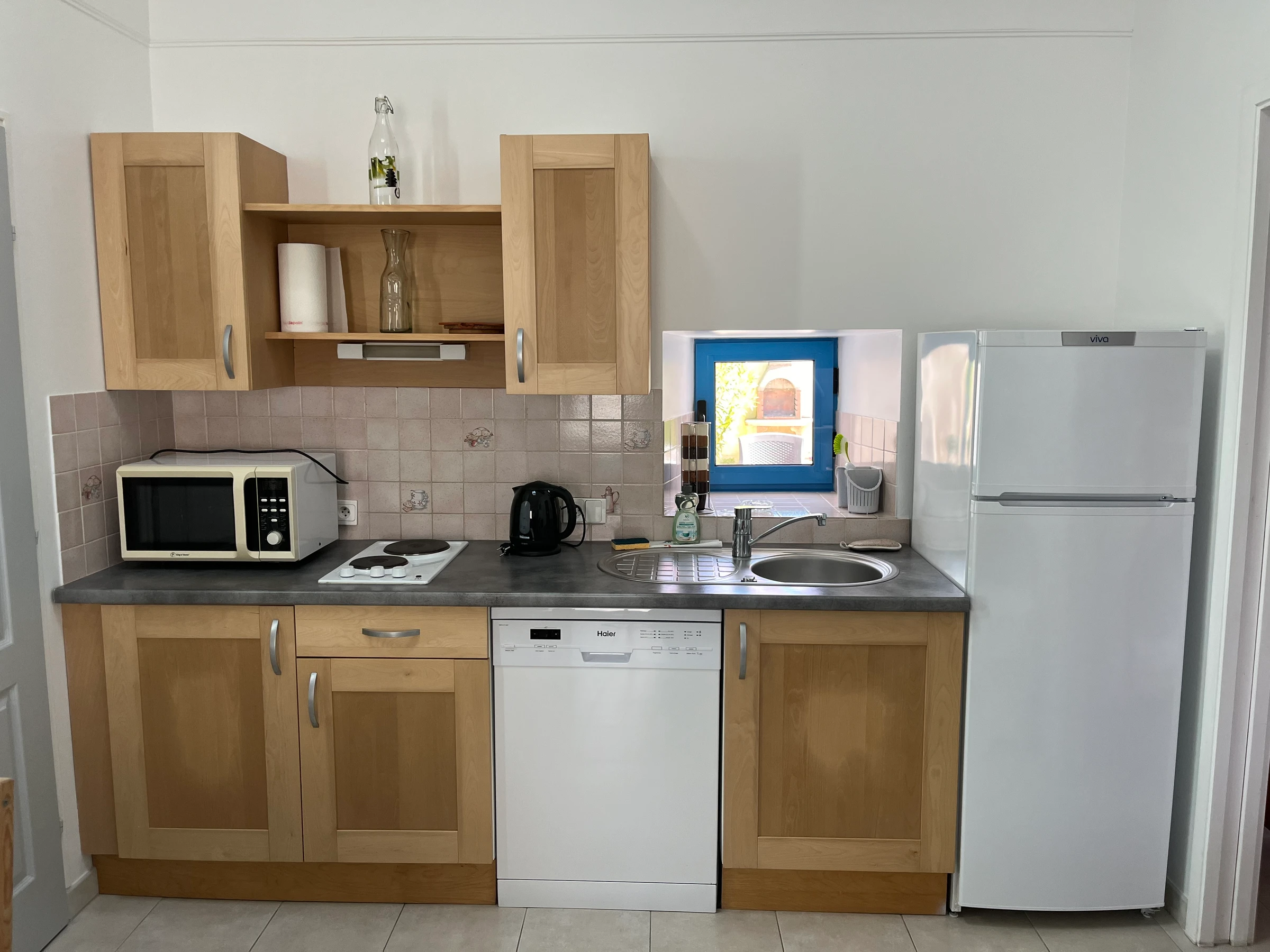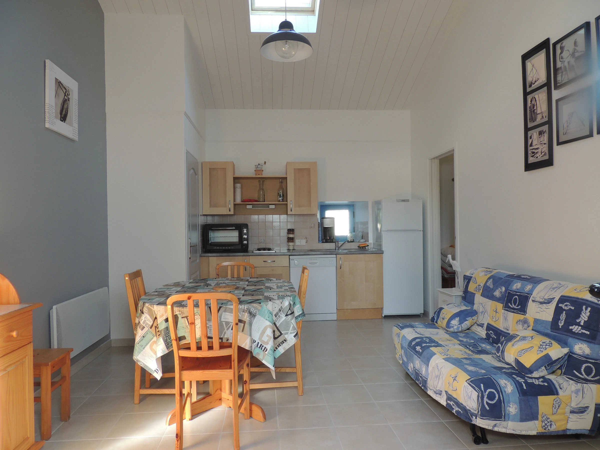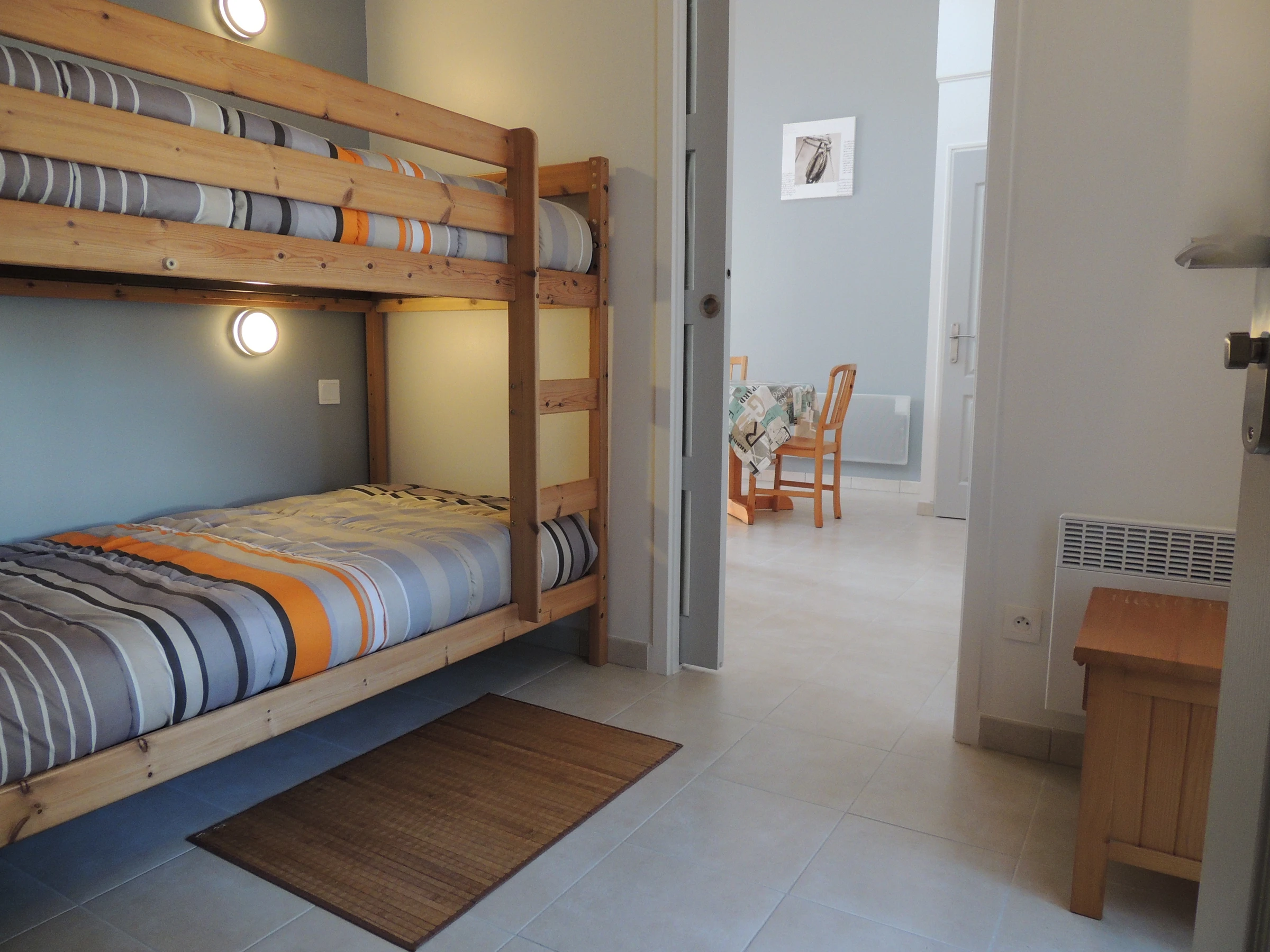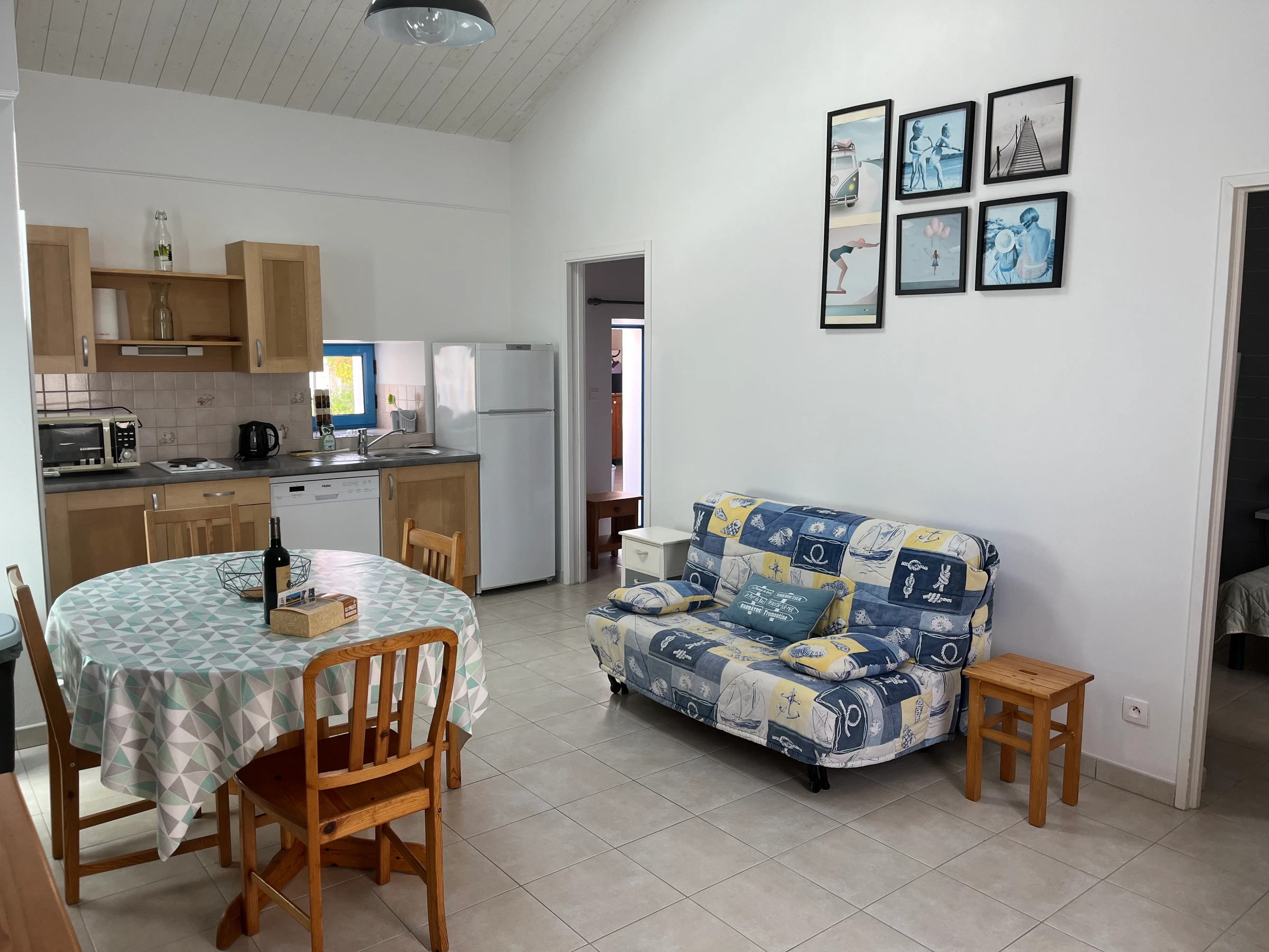 Casa adosada de una sola planta con capacidad para 4 personas - aproximadamente 50 m² - compuesta por salón-comedor con cocina americana amueblada y equipada, un dormitorio con una cama de 140 cm, una zona de dormir con 2 literas de 90 cm, cuarto de ducha y WC accesible a través de la zona de dormir, cuarto para guardar bicicletas con 2 bicicletas para adultos y 2 bicicletas para niños disponibles. Placa eléctrica, mini-horno, microondas, lavavajillas, frigorífico/congelador combinado, lavadora, televisión, Wi-Fi GRATIS, trona BB. Jardín cerrado con terraza, muebles de jardín y barbacoa. Estacionamiento en la calle o estacionamiento de la iglesia cercano. No se admiten mascotas. Posibilidad de paquete de limpieza de 80€.
