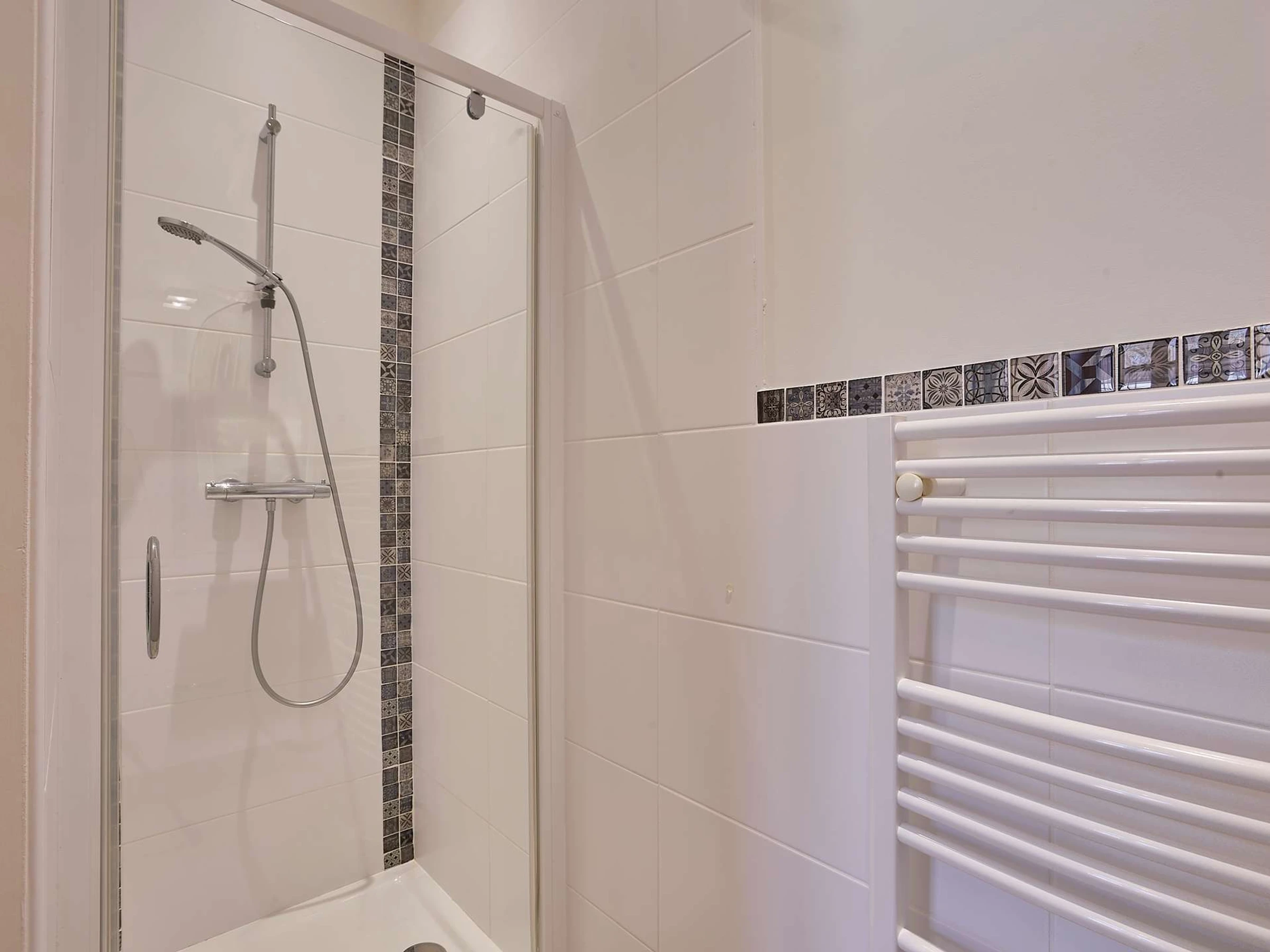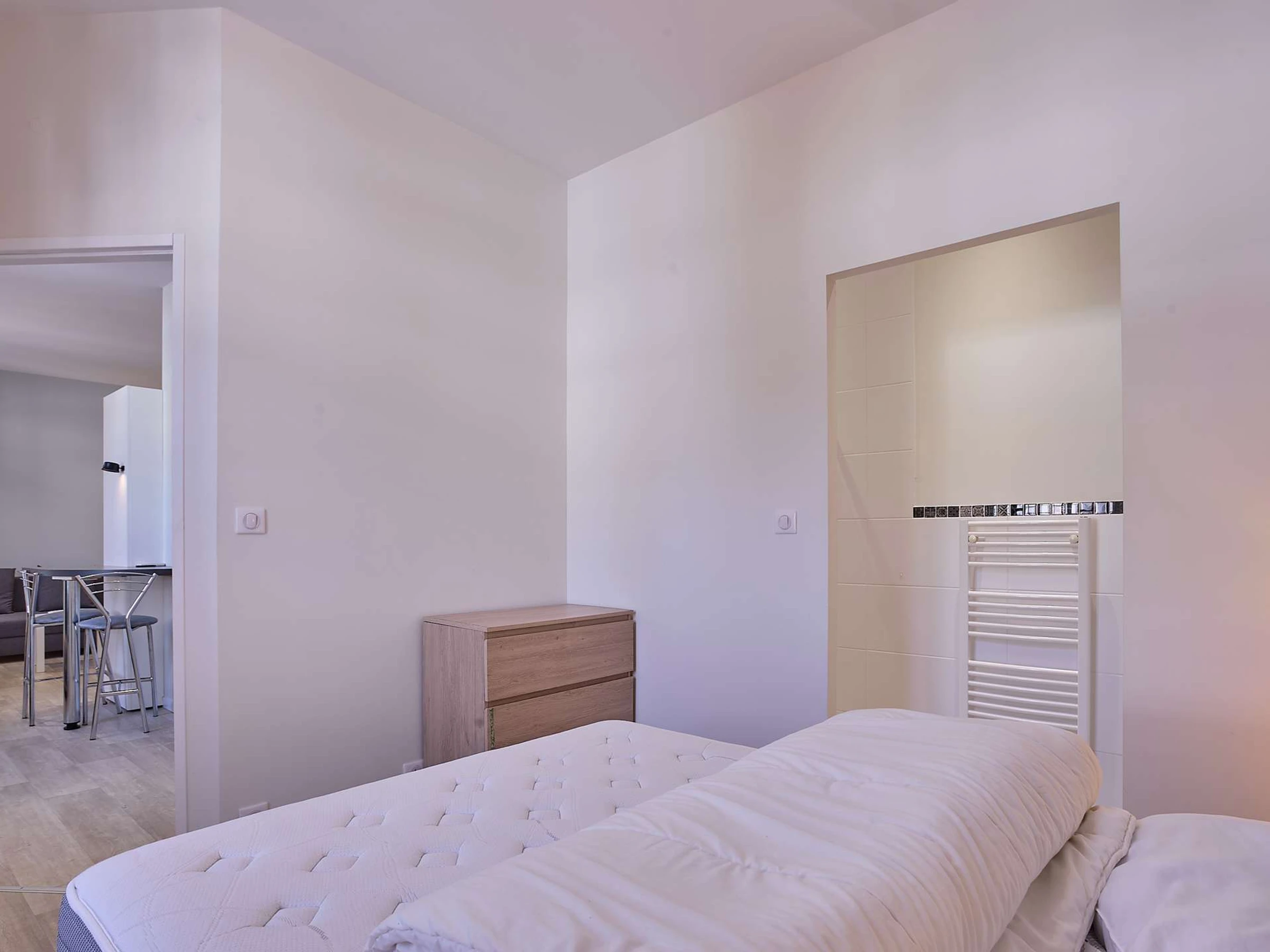 La suite principal de 14 m² ofrece un auténtico remanso de paz. Está amueblada con una cama doble (140 cm), espacio de almacenaje y baño privado con ducha, lavabo y amplio espacio de almacenamiento.