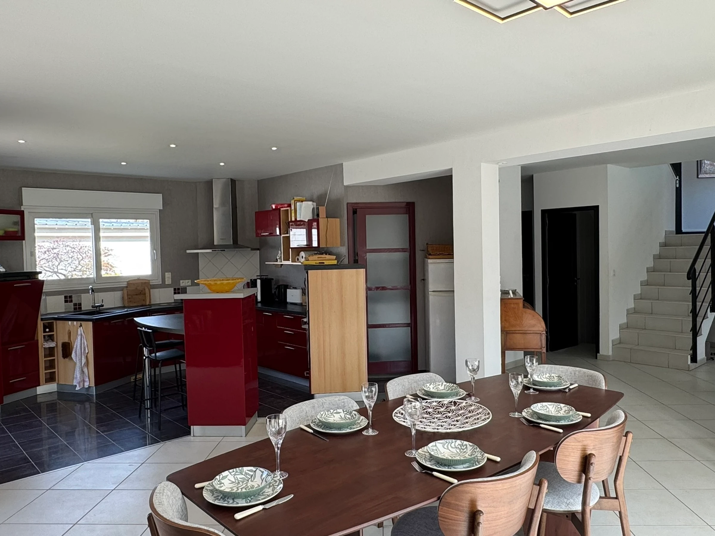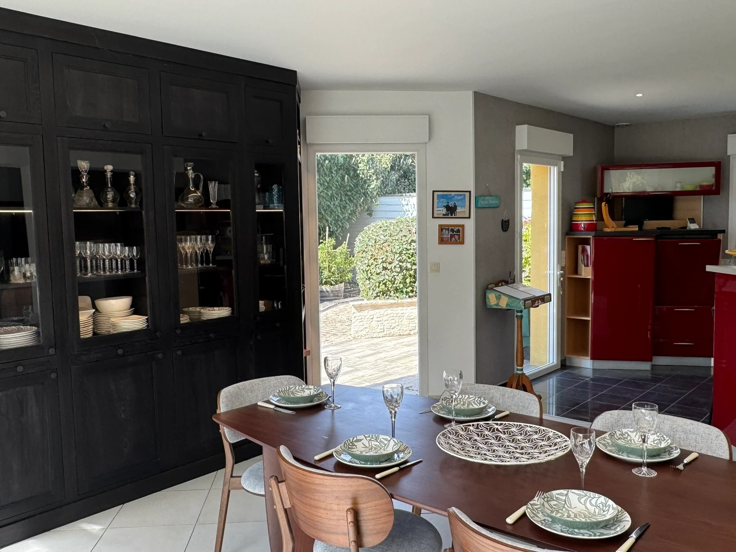 Esta villa, con capacidad para 8 personas, cuenta en la planta baja con un espacioso salón-comedor de 70 m² con cocina americana (lavavajillas, horno convencional, microondas, nevera y cafetera Krups) y un aseo independiente.