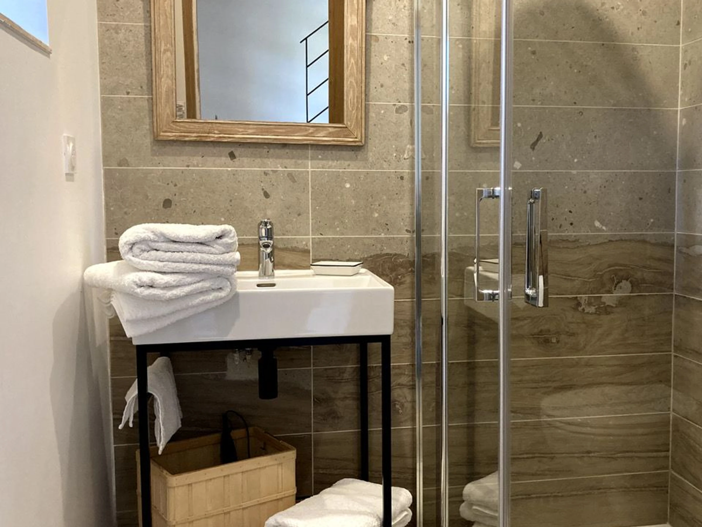 Habitación Sainfoin para 4 personas: en la planta baja, baño con ducha, lavabo e inodoro. En la planta superior, un amplio dormitorio con una cama doble y una pequeña habitación comunicada con dos camas individuales.