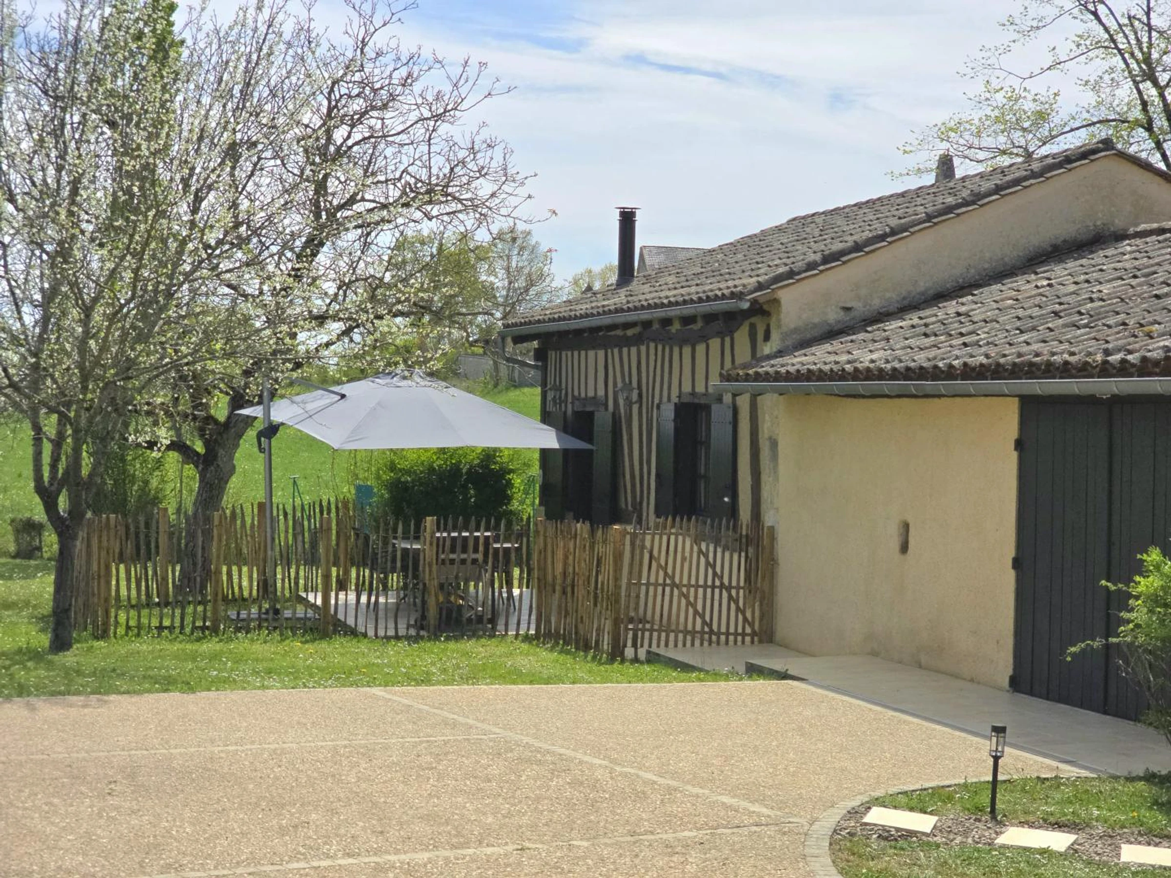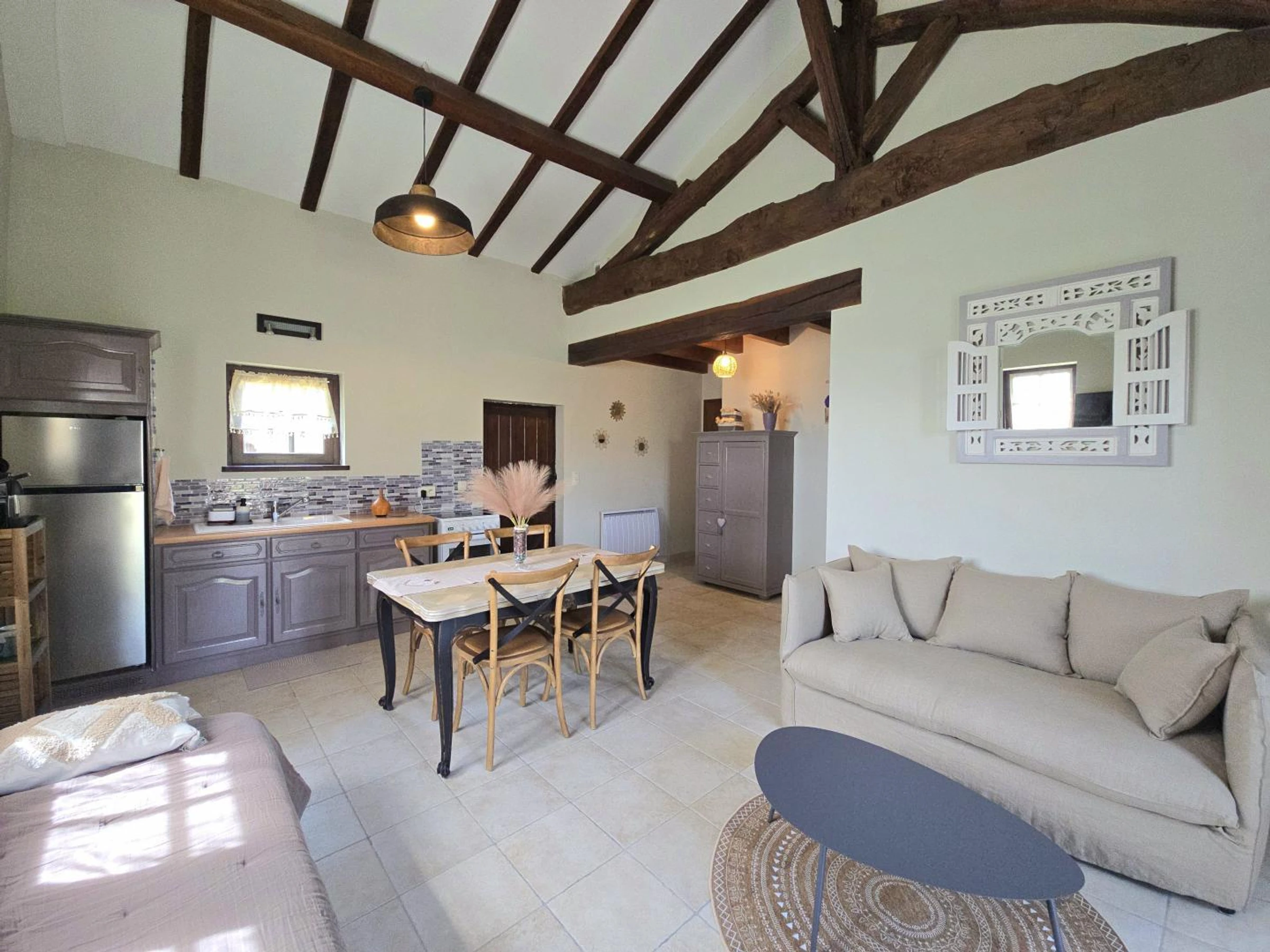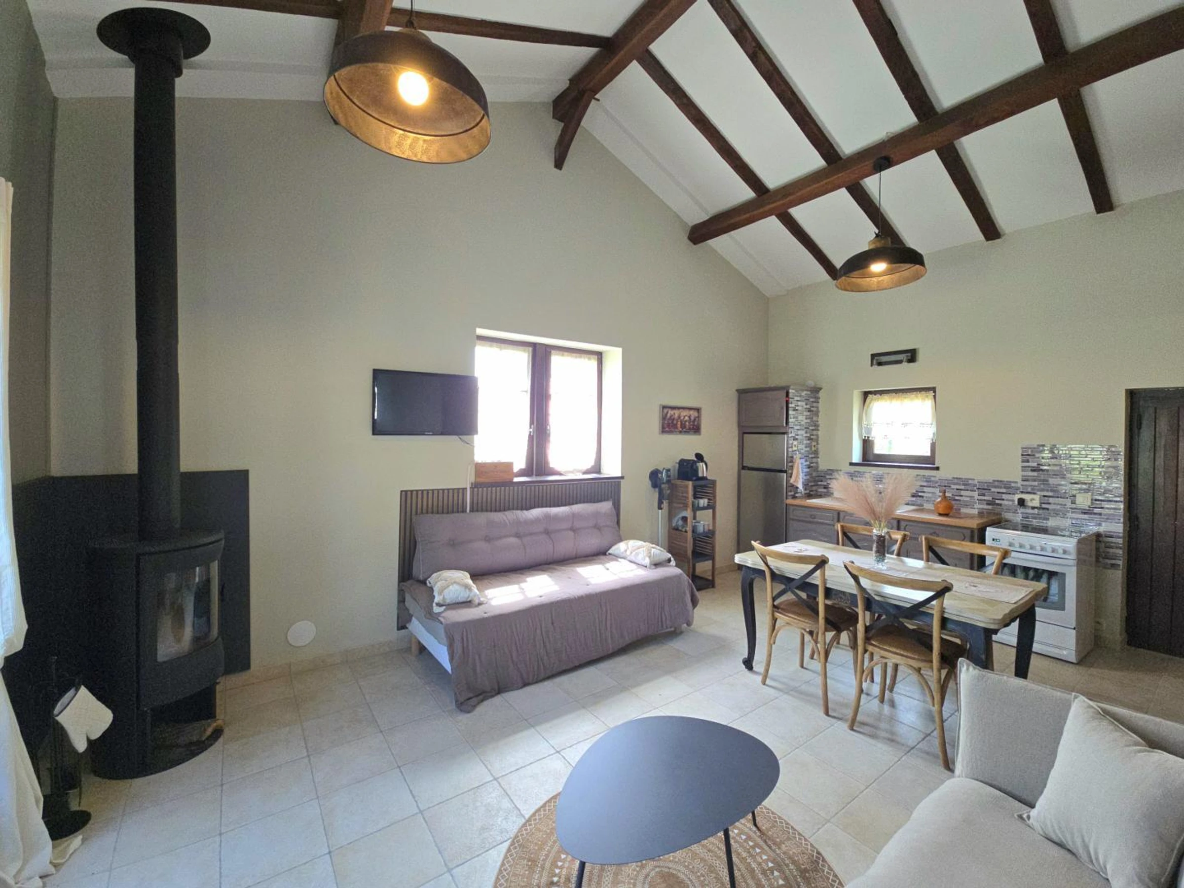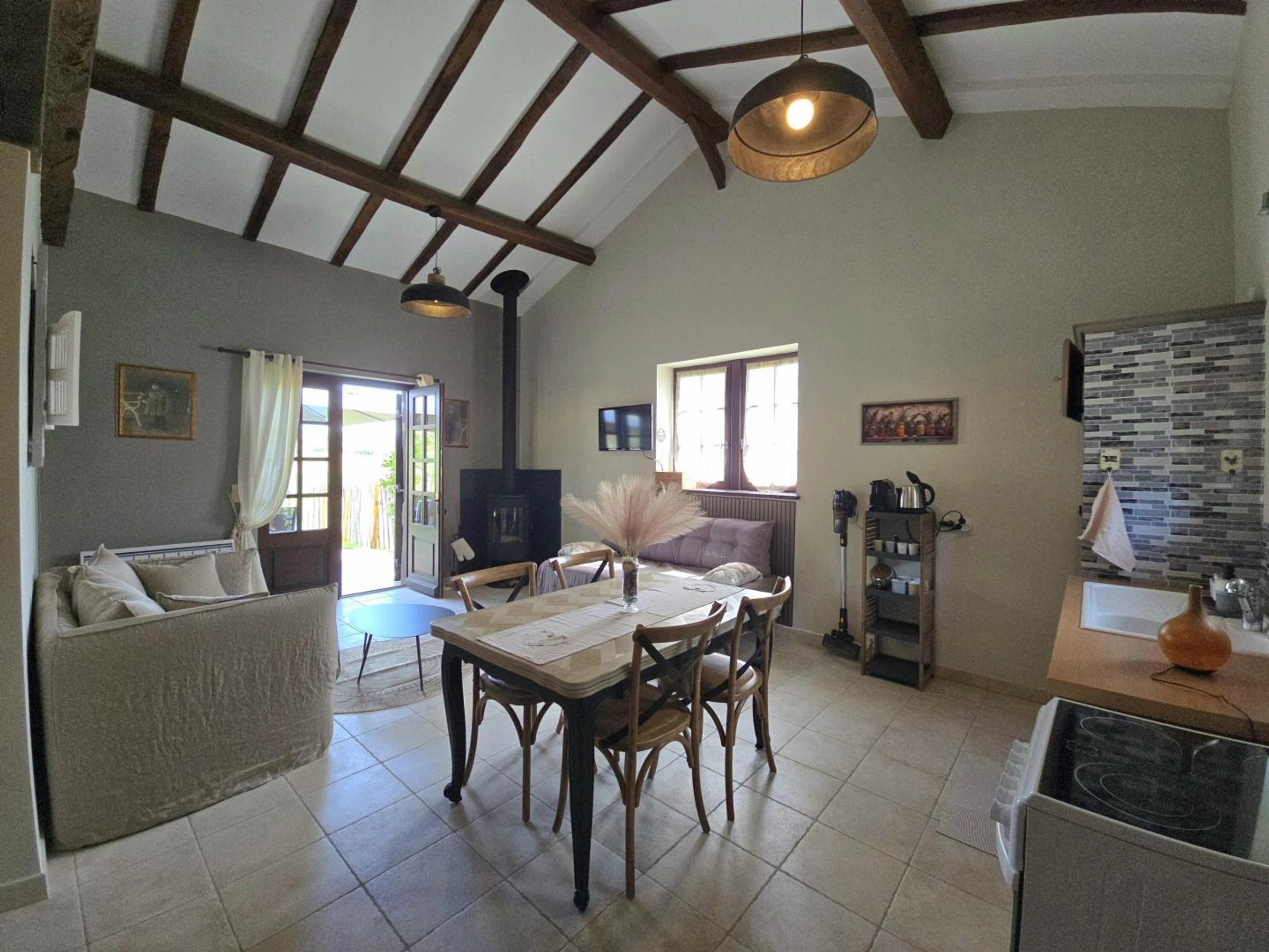 Accederá a una sala de estar con un sofá cama, un banco, un televisor, una estufa de leña y acceso a internet. También hay una cocina equipada con vitrocerámica de cuatro fuegos, horno, cafetera Nespresso, frigorífico-congelador y comedor. También dispone de un aseo independiente. Dispondrá de un dormitorio con cama de matrimonio (160 x 200 cm) y un baño en suite con ducha, lavabo y lavadora. En el exterior de la casa, podrá disfrutar de una terraza con muebles de jardín, sombrilla y plancha. Compartirá con los propietarios un jardín vallado de aproximadamente 2500 m², así como una piscina de cloro de 8 x 4 m, 1,60 m de profundidad y cubierta de seguridad, abierta desde mediados de mayo hasta finales de septiembre. La casa está junto al garaje de los propietarios y cerca de su casa. La calefacción se proporciona mediante radiadores eléctricos y una estufa de leña. Hay aparcamiento disponible en el establecimiento. Esta encantadora casa rural para dos personas cautiva con el auténtico encanto de su construcción con entramado de madera. Ideal para una escapada romántica, ofrece un entorno refinado con acceso a una piscina compartida, perfecta para relajarse después de un día explorando.