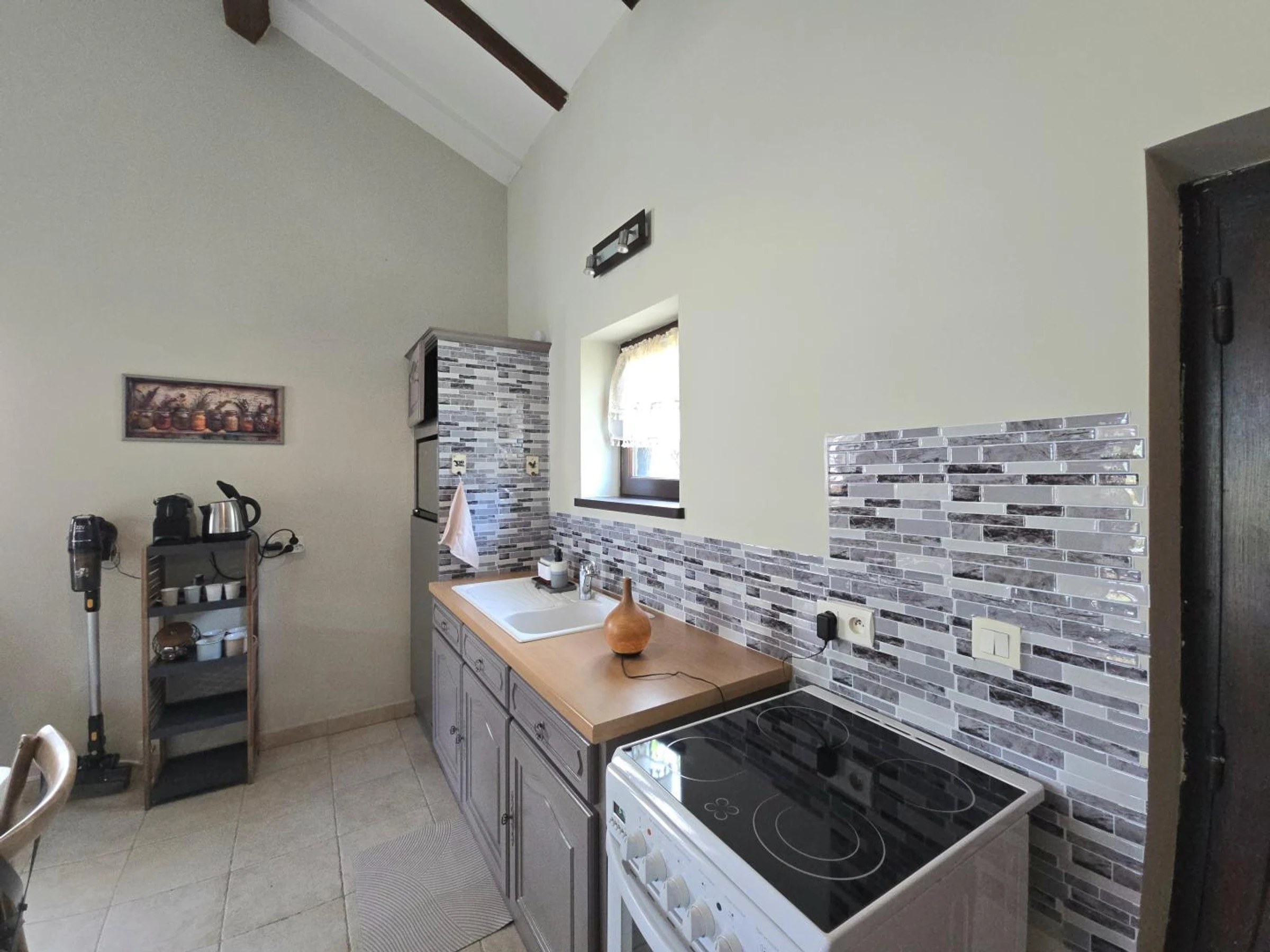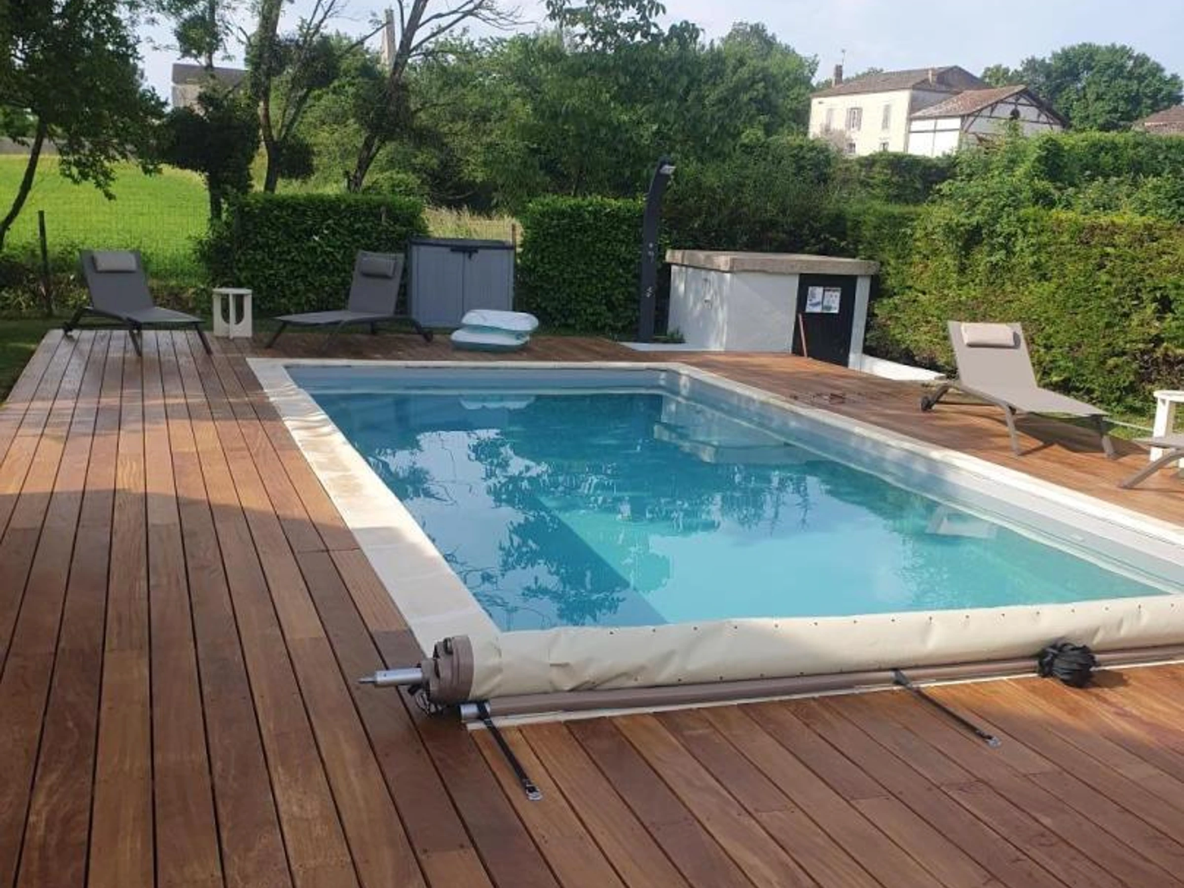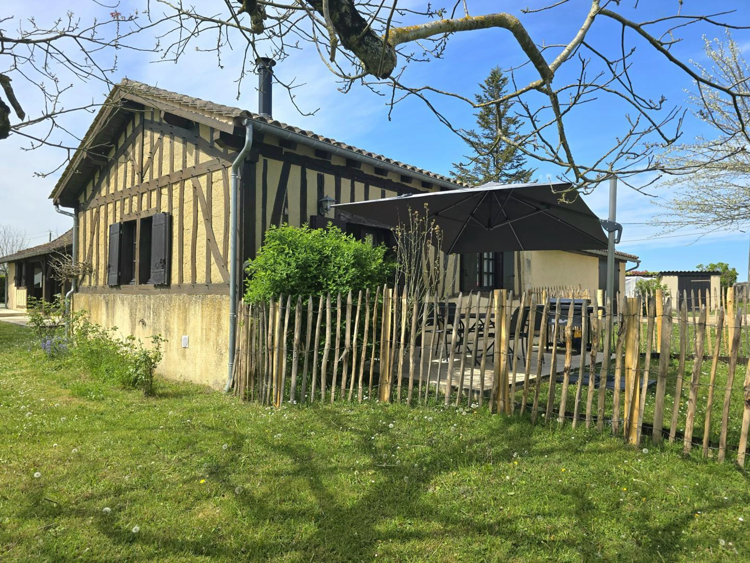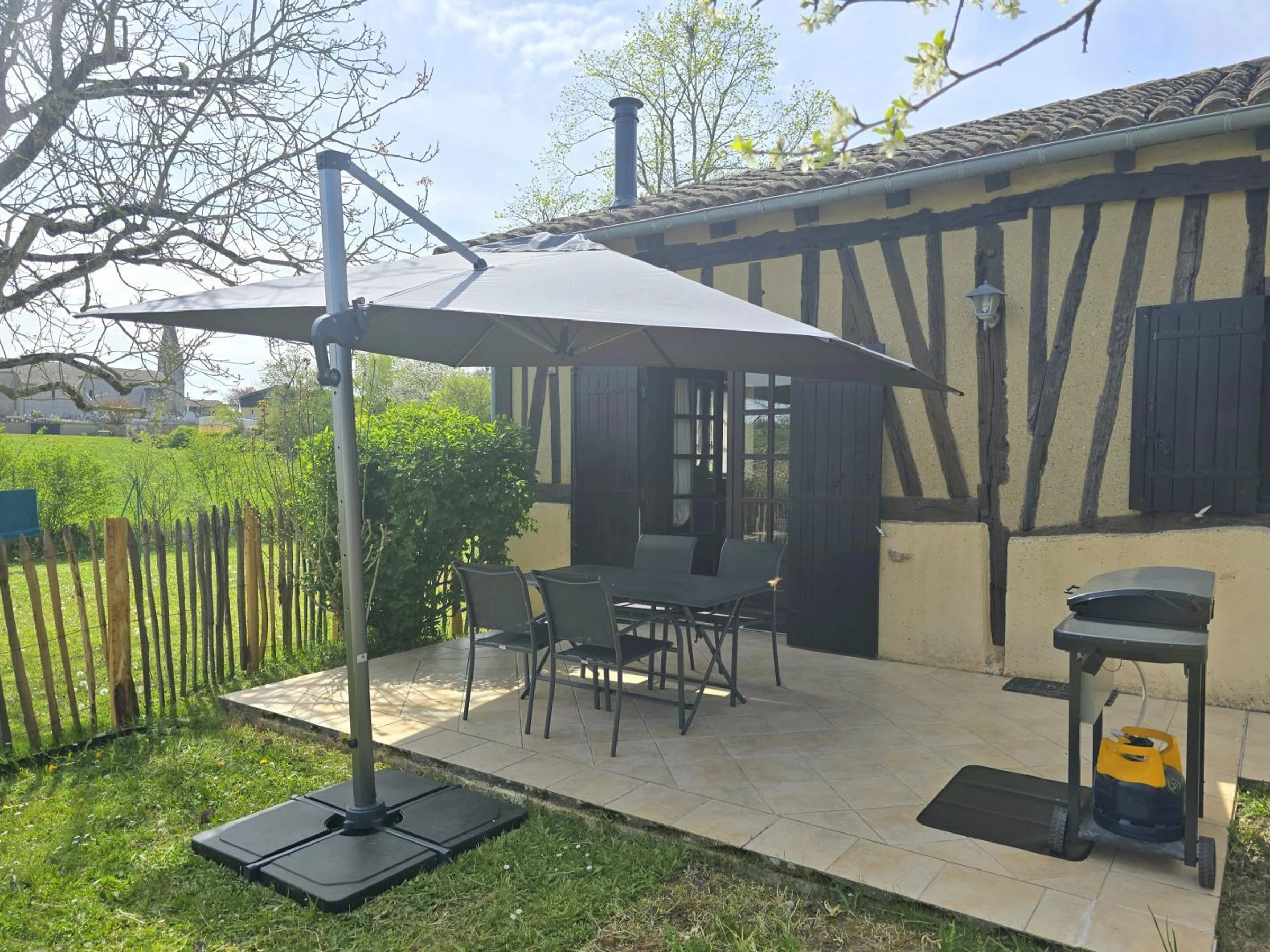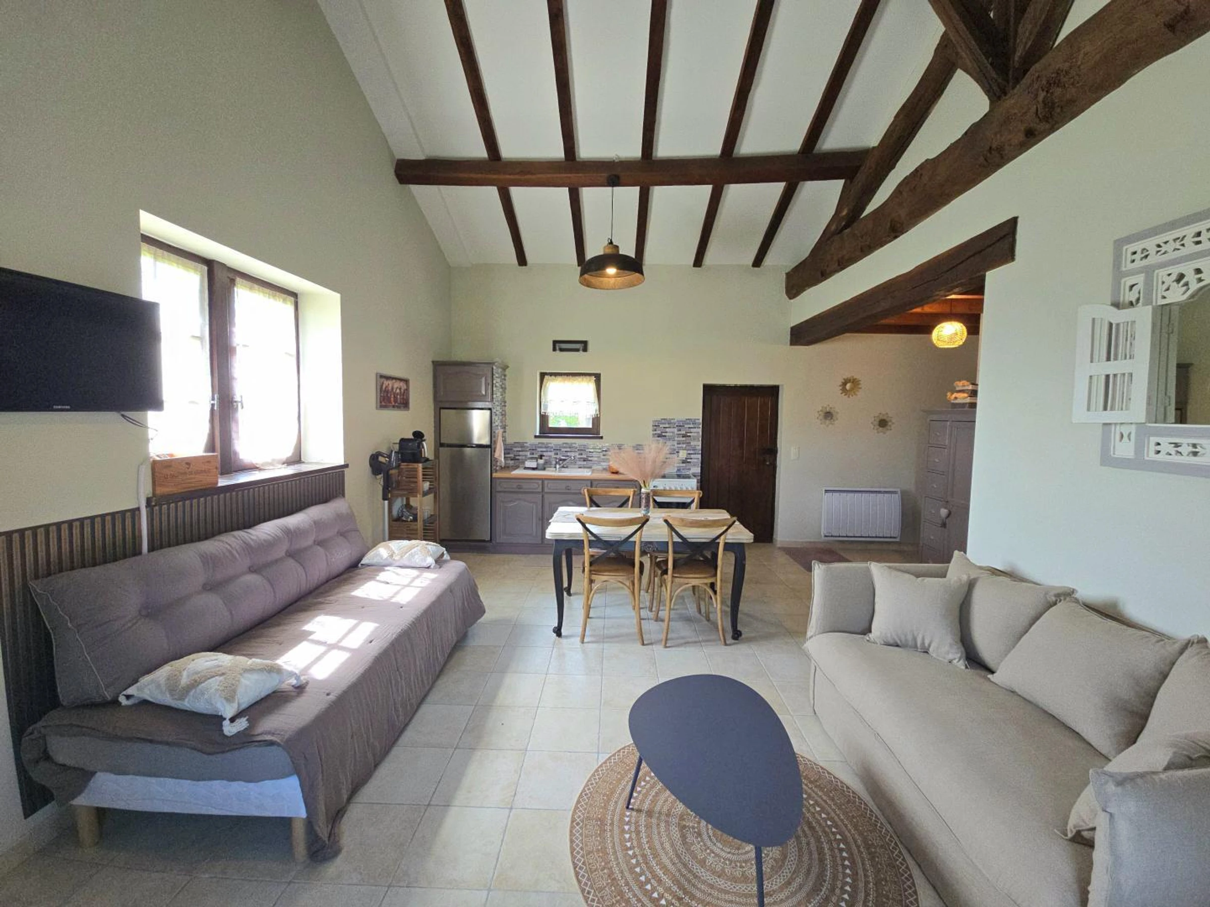 Accederá a una sala de estar con un sofá cama, un banco, un televisor, una estufa de leña y acceso a internet. También hay una cocina equipada con vitrocerámica de cuatro fuegos, horno, cafetera Nespresso, frigorífico-congelador y comedor. También dispone de un aseo independiente. Dispondrá de un dormitorio con cama de matrimonio (160 x 200 cm) y un baño en suite con ducha, lavabo y lavadora. En el exterior de la casa, podrá disfrutar de una terraza con muebles de jardín, sombrilla y plancha. Compartirá con los propietarios un jardín vallado de aproximadamente 2500 m², así como una piscina de cloro de 8 x 4 m, 1,60 m de profundidad y cubierta de seguridad, abierta desde mediados de mayo hasta finales de septiembre. La casa está junto al garaje de los propietarios y cerca de su casa. La calefacción se proporciona mediante radiadores eléctricos y una estufa de leña. Hay aparcamiento disponible en el establecimiento. Esta encantadora casa rural para dos personas cautiva con el auténtico encanto de su construcción con entramado de madera. Ideal para una escapada romántica, ofrece un entorno refinado con acceso a una piscina compartida, perfecta para relajarse después de un día explorando.
