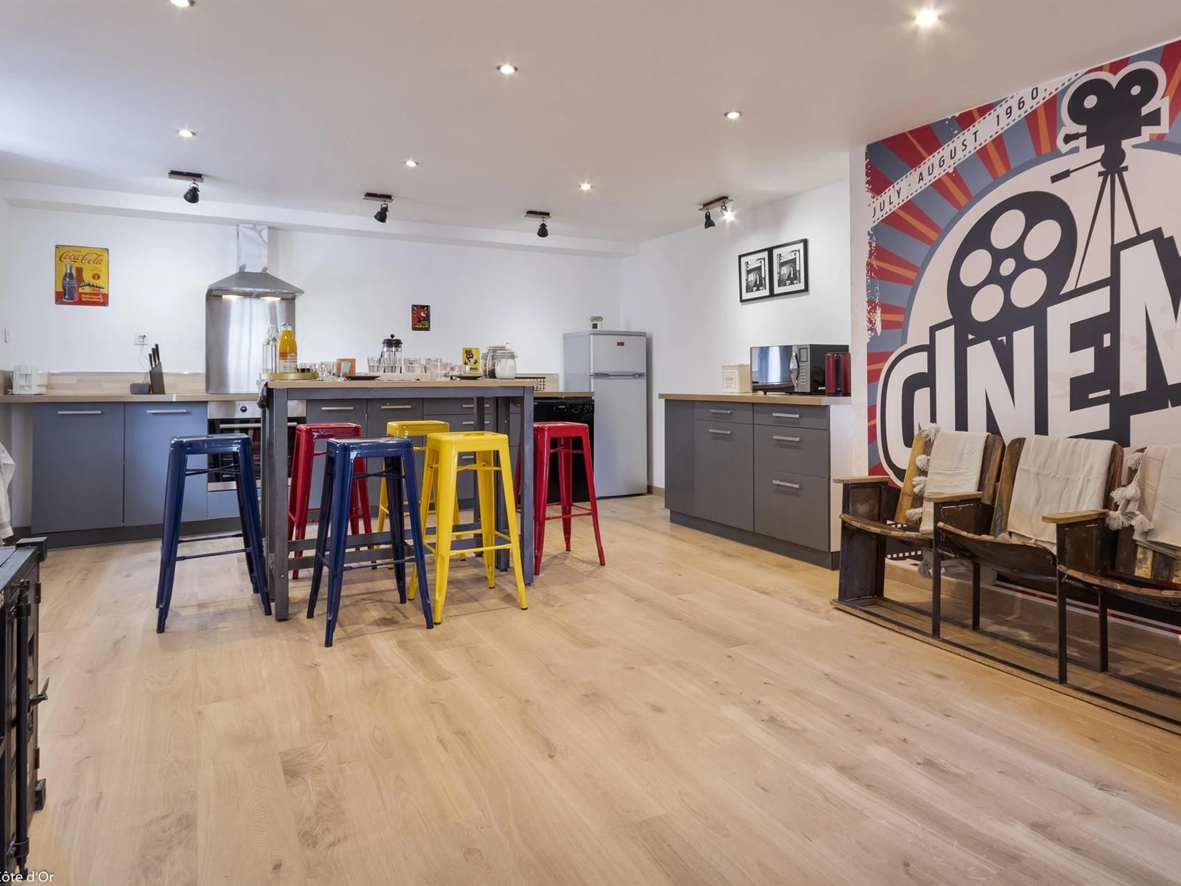 Unos pocos pasos te llevan al primer nivel donde encuentras una sala de estar con comedor, salón (TV con video prime, fibra y wifi, etc.) y cocina inspirada en los años 50 en una mezcla de madera y acero. La cocina está equipada con todas las comodidades modernas (aire acondicionado reversible, horno, lavavajillas, placa de inducción, microondas, frigorífico con congelador).