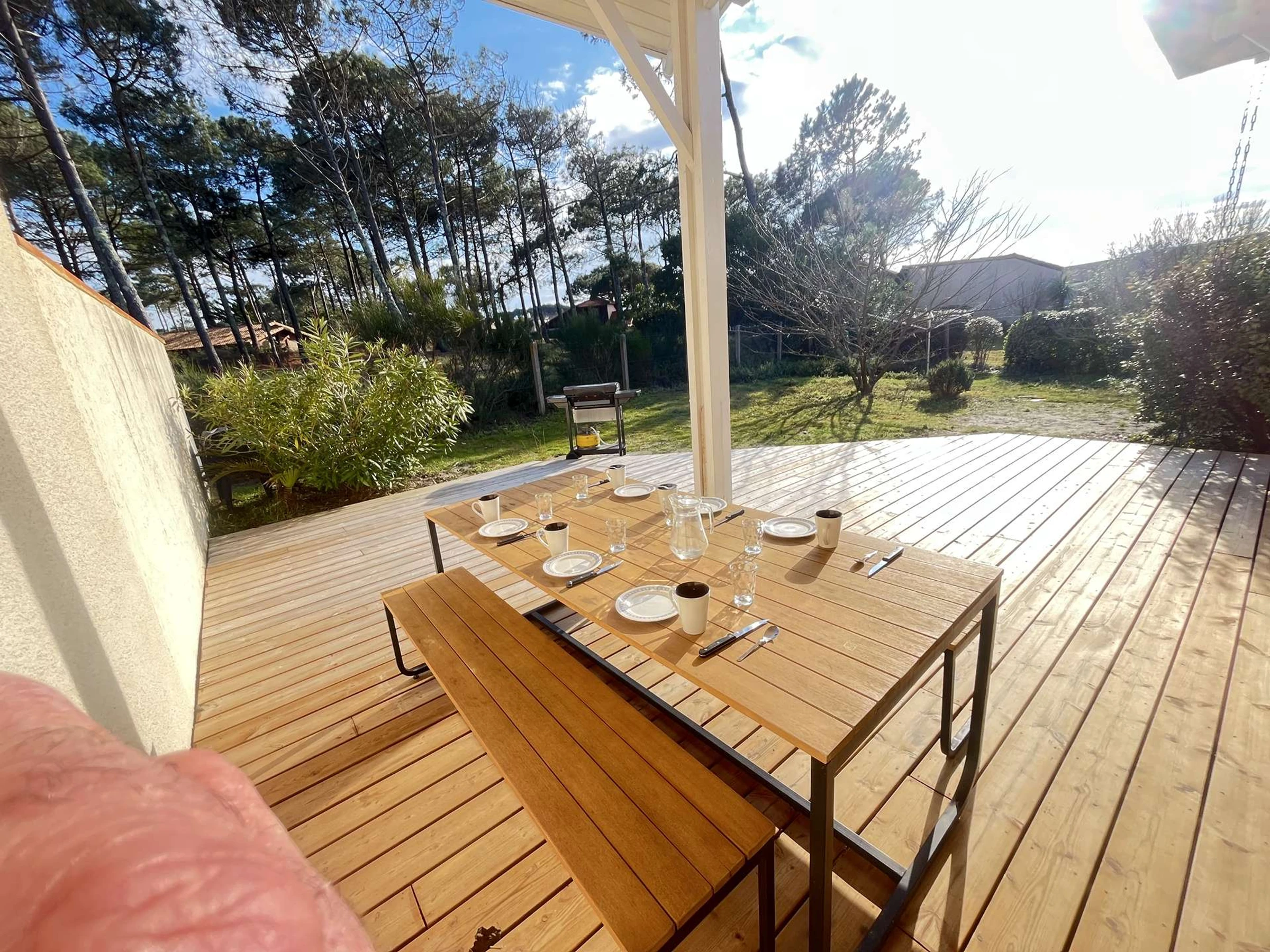La villa cuenta con una terraza cubierta orientada al este, amueblada con mobiliario de jardín y una parrilla de gas para comer al aire libre. Además, dispone de una plaza de aparcamiento justo enfrente de la casa.