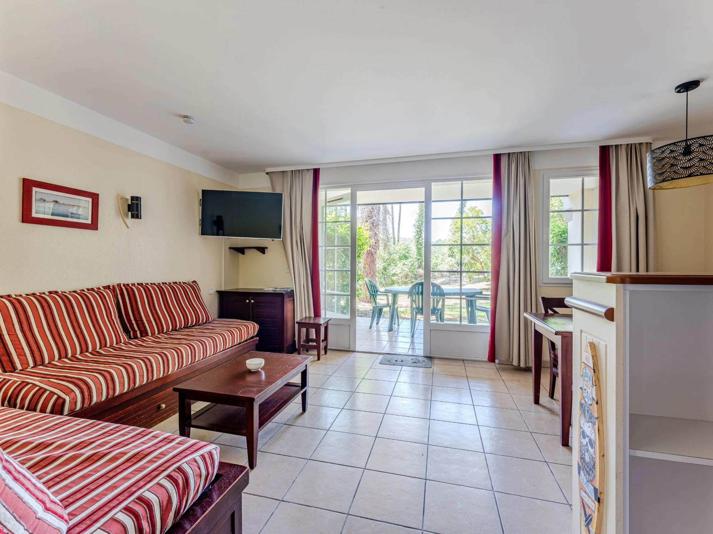 En una residencia turística, precioso apartamento en planta baja con vistas al campo de golf, a pie de campo, a 800 m del lago y a 200 m de los carriles bici. Este apartamento para 5 personas cuenta con un dormitorio con una cama de 140 x 190 cm, una zona de dormitorio con una cama de 90 x 190 cm, un baño, un aseo con ducha, un salón con dos sofás cama y una cocina americana con lavavajillas, vitrocerámica y frigorífico, todo ello con acceso a una amplia terraza cubierta con mobiliario de exterior.