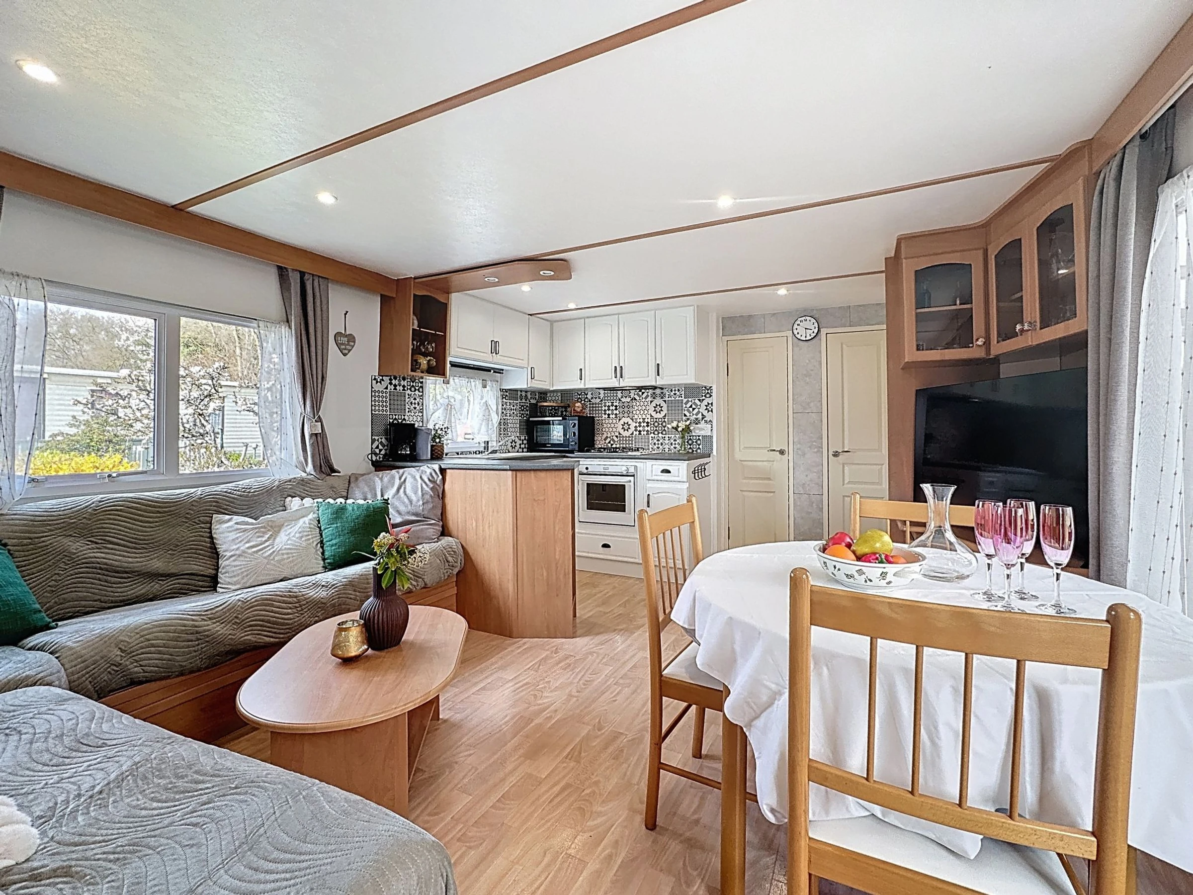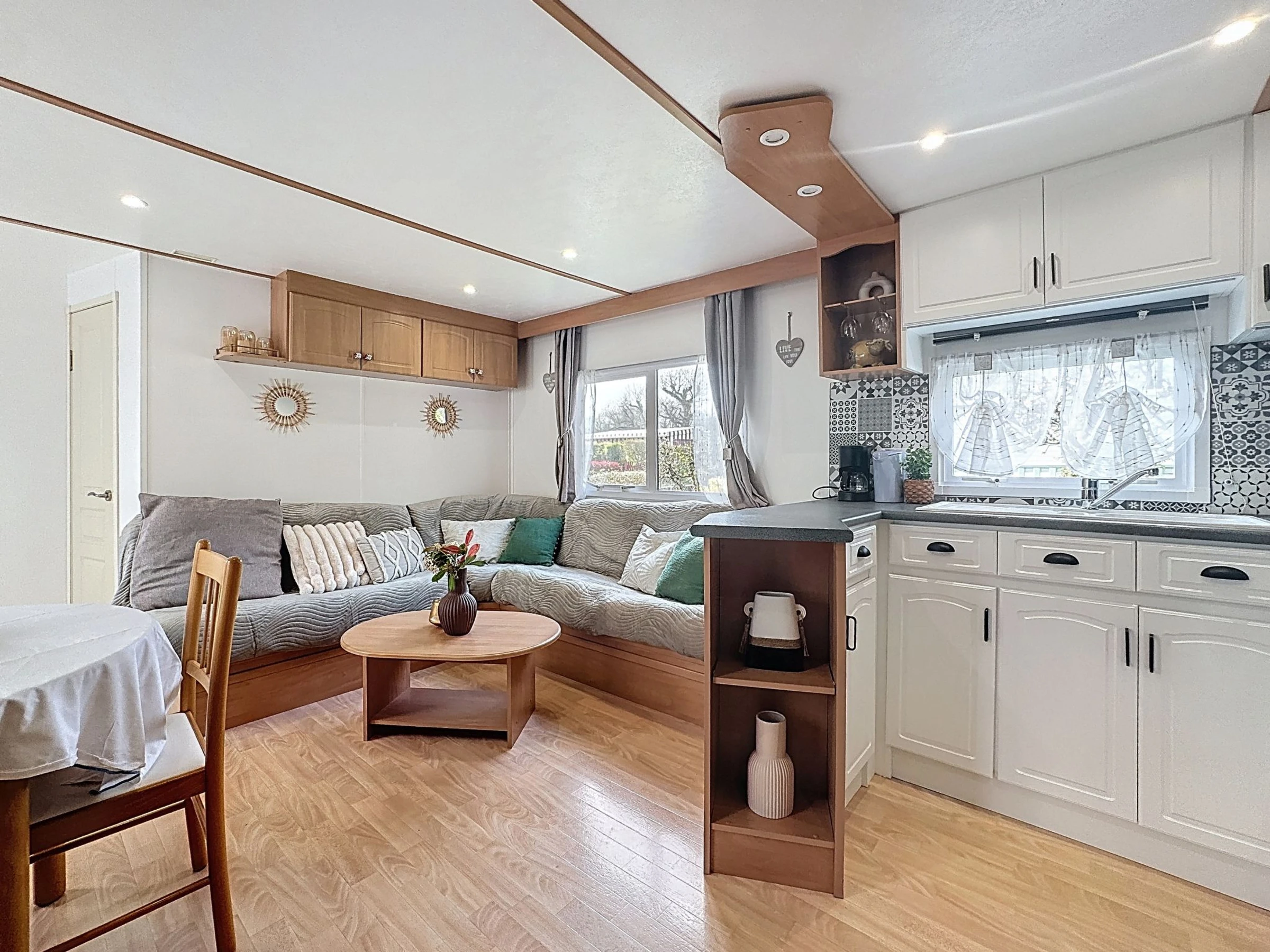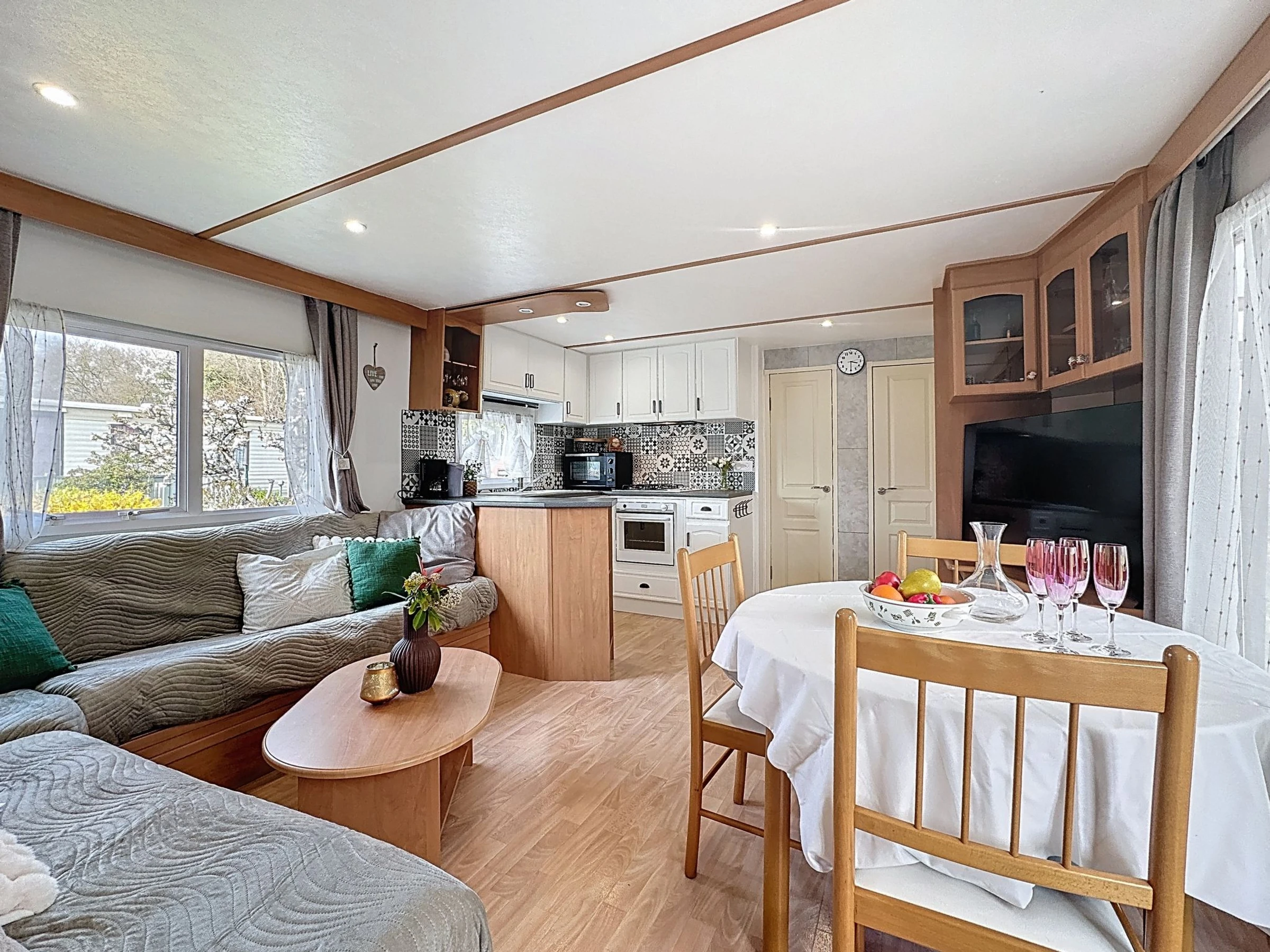 "Le Lieu Bill", 3 estancias mobile home 40 m2. Salón-comedor con TV (pantalla plana). Salida a la terraza. 1 dorm. con 1 cama de matrimonio (1 x 140 cm, 190 cm de longitud). 1 dorm. con 1 cama de matrimonio (1 x 140 cm, 190 cm de longitud). Cocina abierta (4 fogones, lavavajillas, tostadora, hervidor de agua eléctrico, microondas, cafetera eléctrica). Ducha, WC separado. Calefacción eléctrica. Terraza grande 10 m2. Muebles de terraza. El alojamiento dispone de: Internet (Wifi, extra). Plaza de aparcamiento (2 Coches). A tener en cuenta: apartamento para no fumadores. 1 mascota / perro. Detector de humo.