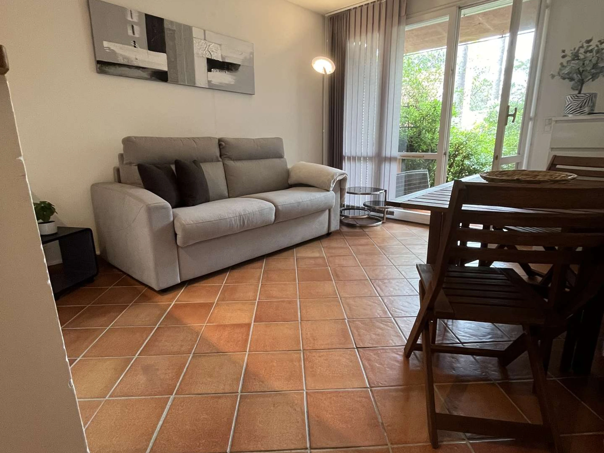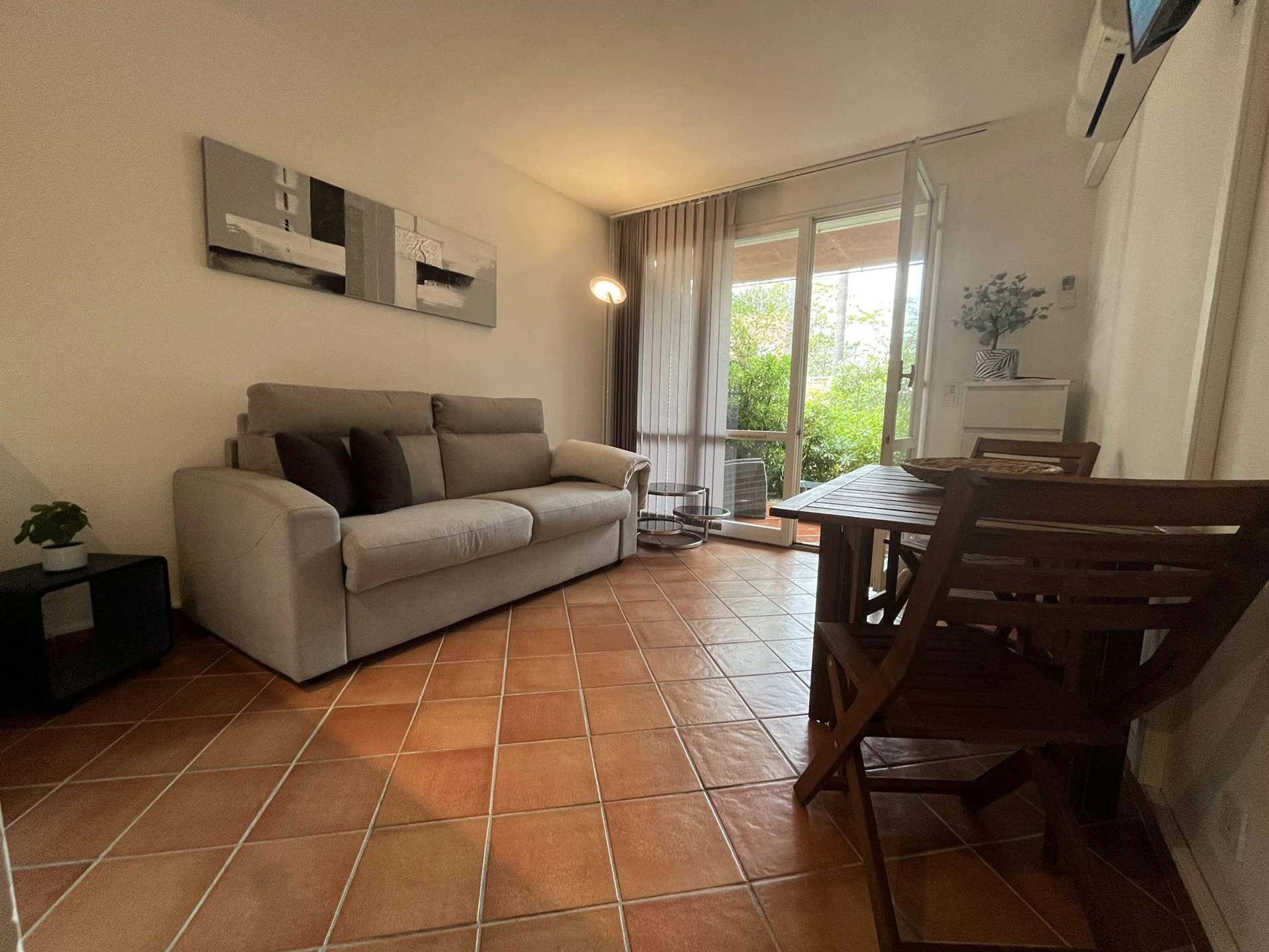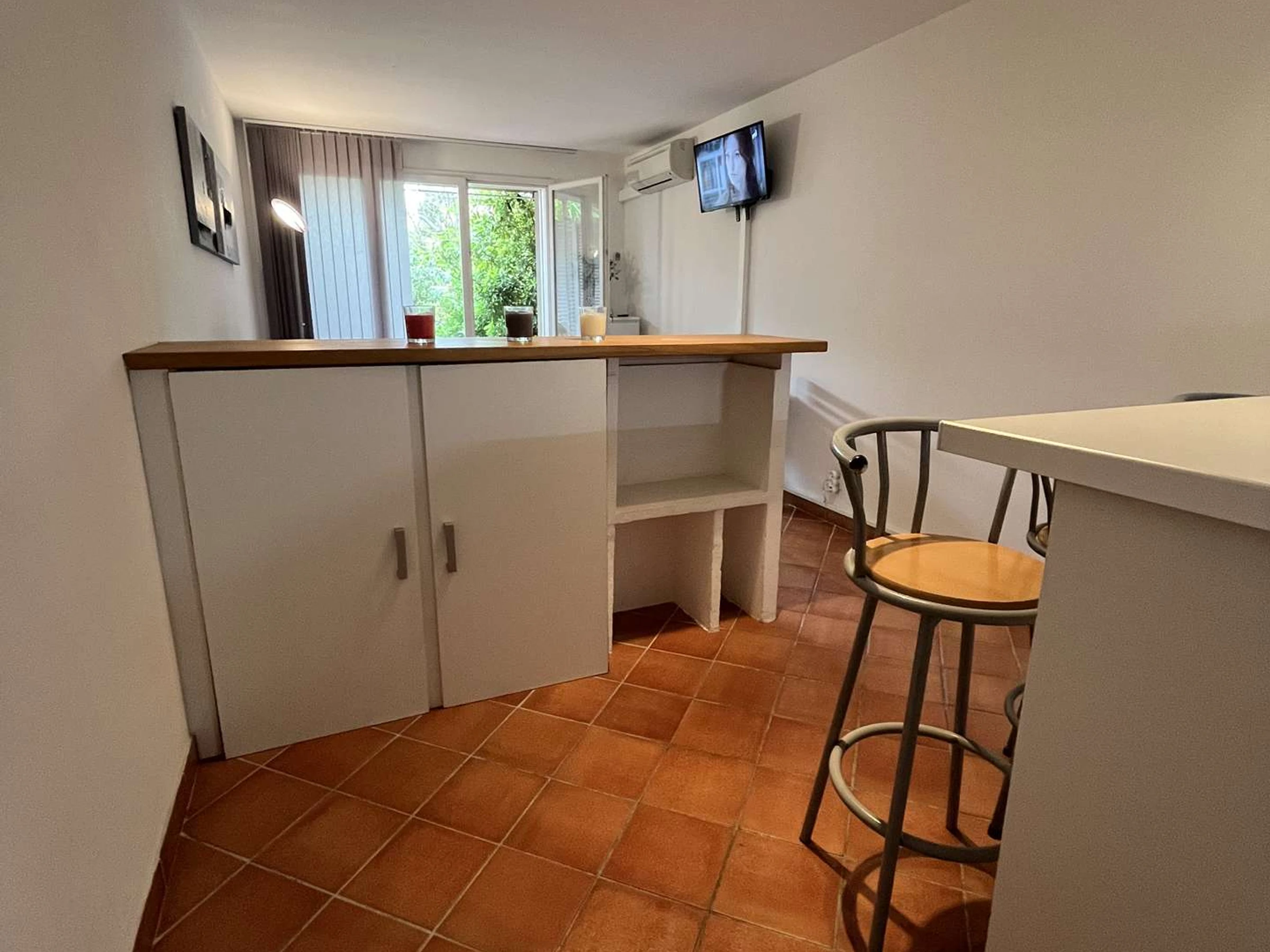 Estudio en planta baja con aire acondicionado, en residencia segura. Consta de una sala de estar con un sofá convertible de 140 cm, una zona de cocina equipada, un baño con WC y cabina de ducha, una terraza orientada al sur con vistas al jardín de la residencia. Aparcamiento gratuito en el establecimiento.