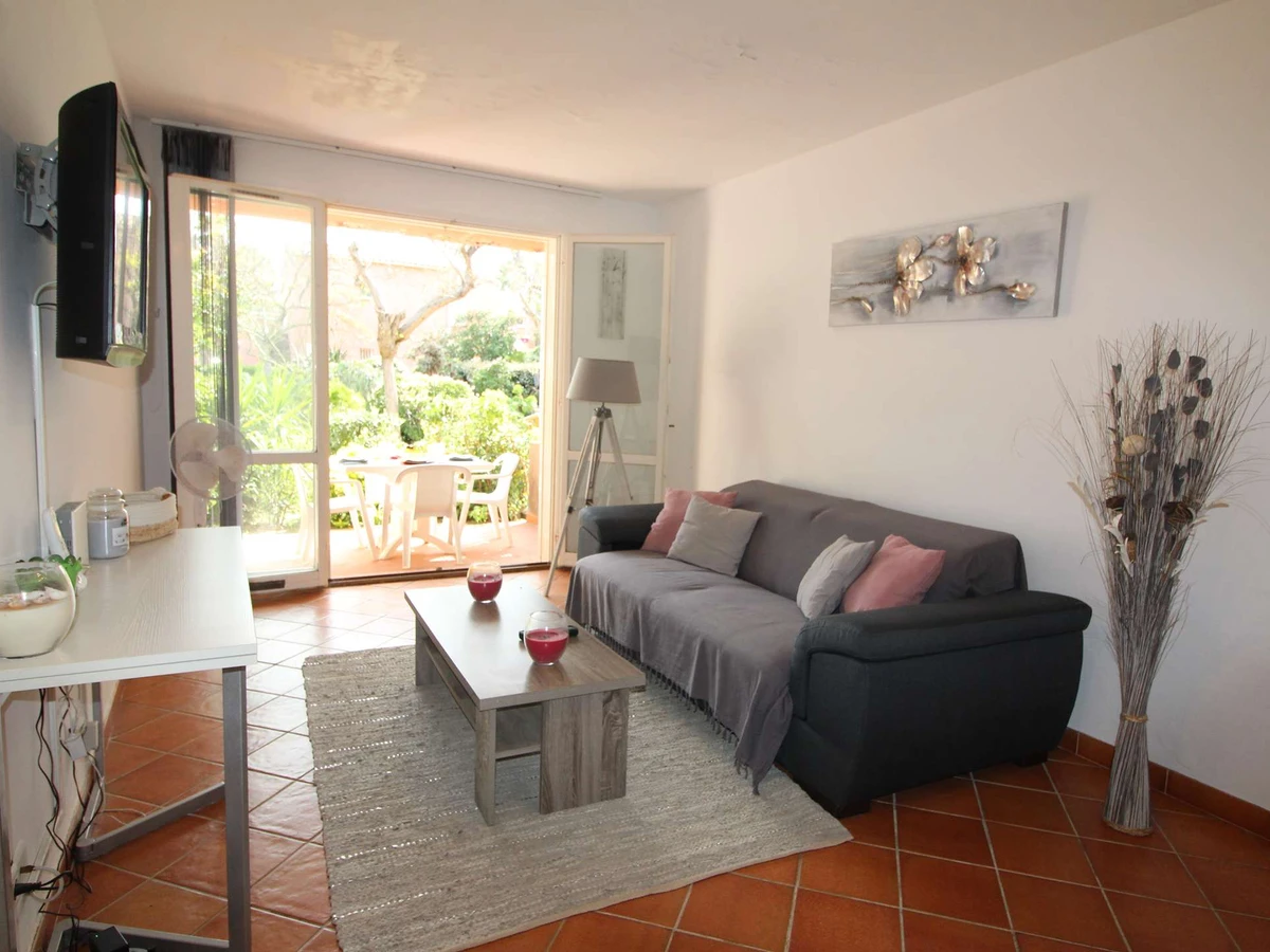 Estudio con aire acondicionado en la planta baja, en una residencia [hidden] compone de una sala de estar con un sofá cama convertible 140, un área de cocina equipada, un baño con inodoro y cabina de ducha, una terraza orientada al sur con vistas al jardín de la residencia. Estacionamiento gratuito en el lugar.