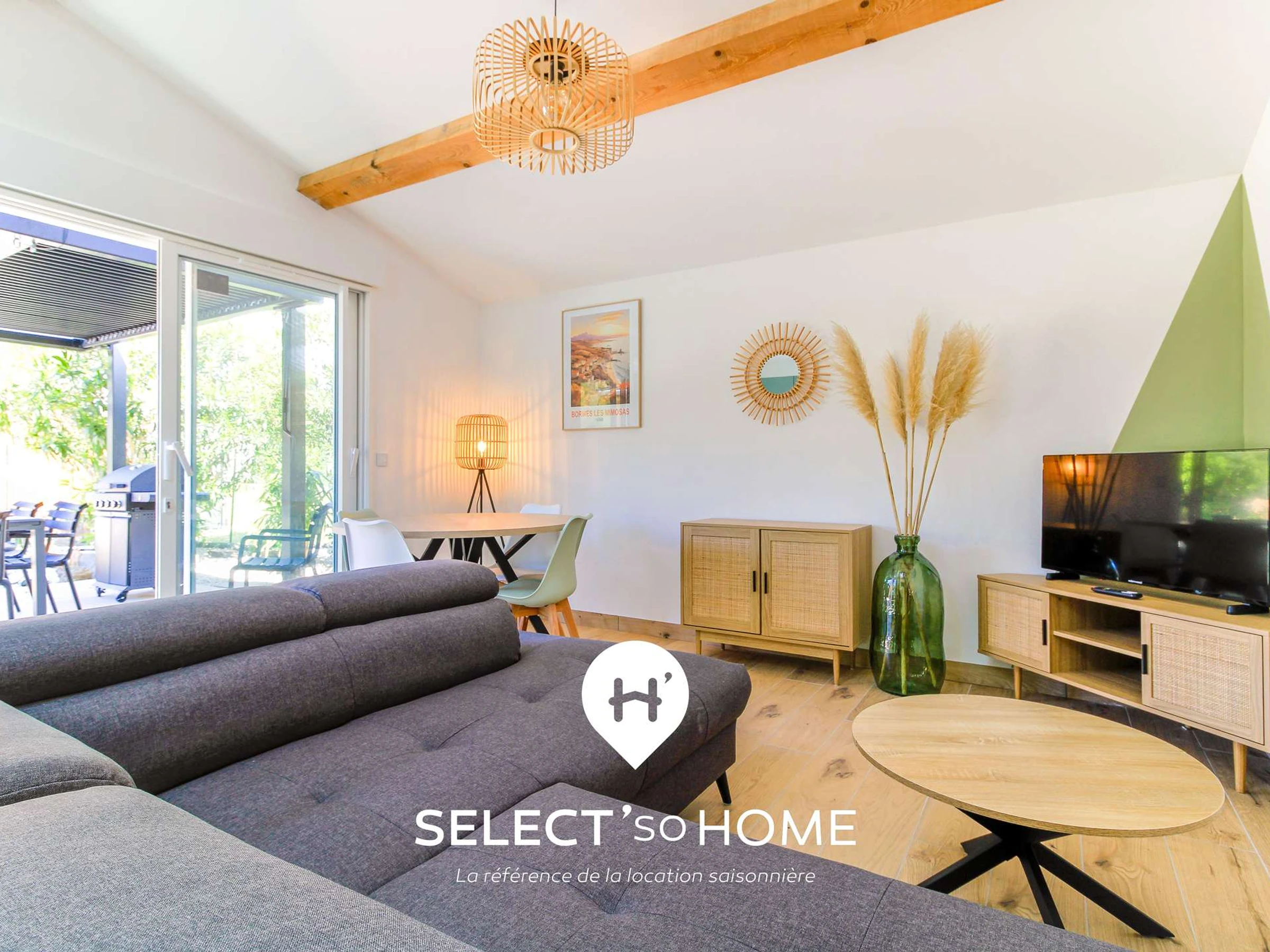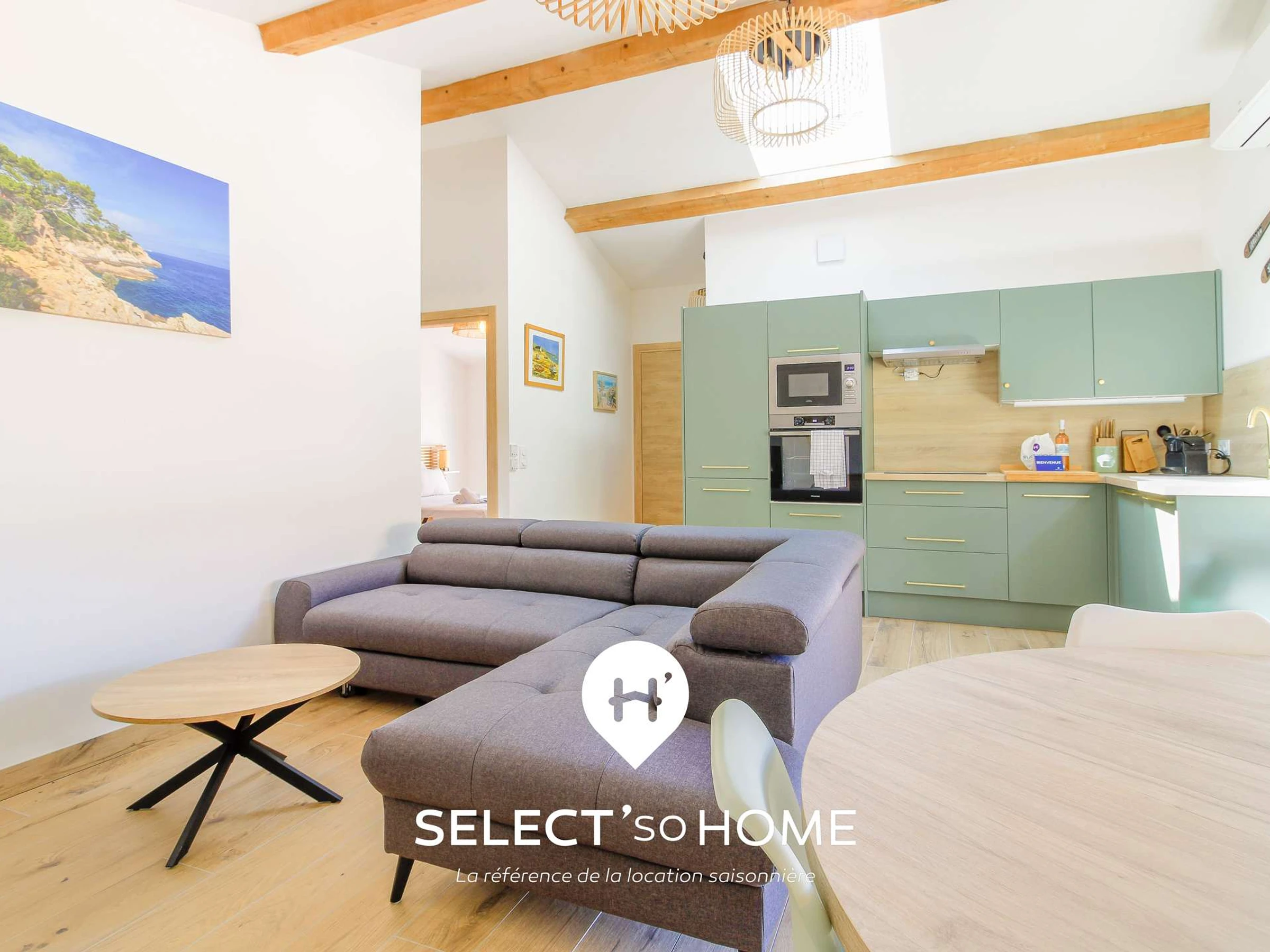 Tras su fachada soleada, Villa Évasion despliega un ambiente cálido y contemporáneo, pensado para el bienestar. Desde el momento en que entra, la luz natural inunda el salón, realzado por las vigas vistas y el suelo de madera clara. El salón invita a la relajación con su amplio y mullido sofá esquinero: ya sea para una siesta después de la playa, un aperitivo relajado o una película por la noche, todos encontrarán su rincón perfecto. El comedor es ideal para comidas informales, y la elegante y discreta cocina americana permite cocinar sin alterar la decoración.