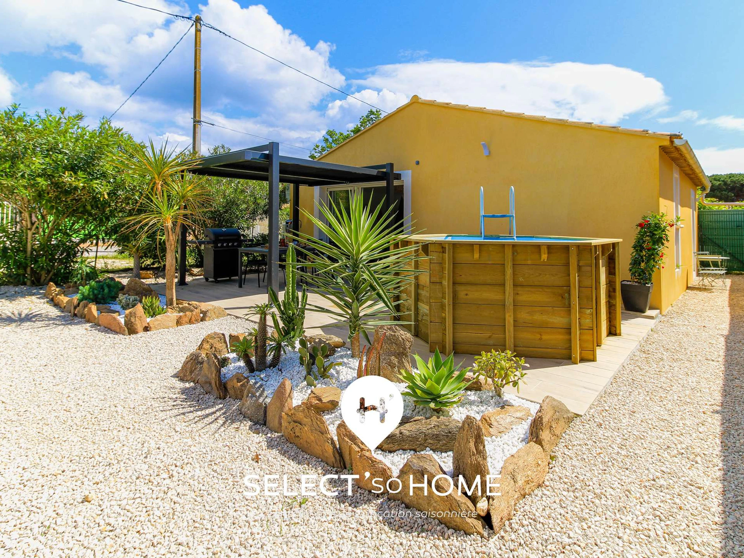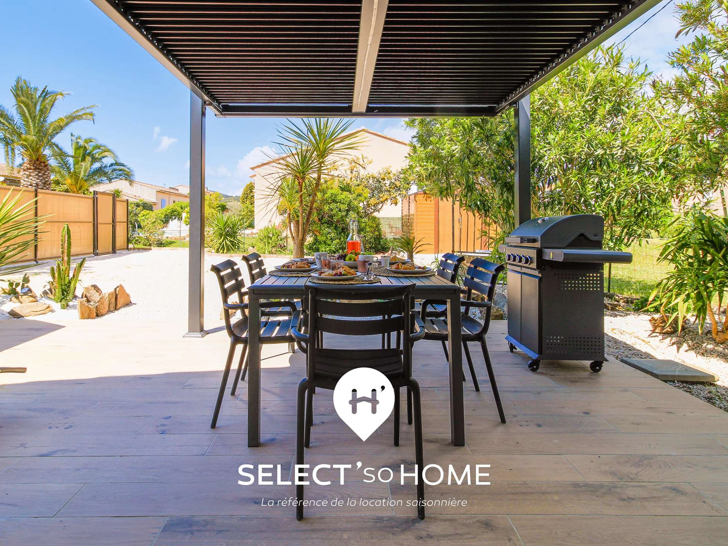 Ubicada en una parcela privada y ajardinada, la villa ofrece un espacio exterior cuidadosamente diseñado: zona de barbacoa, plantas mediterráneas, piscina de madera, aparcamiento privado… Aquí cada momento encuentra su lugar: un desayuno tranquilo, una siesta a la sombra o un aperitivo con los pies en el agua.
