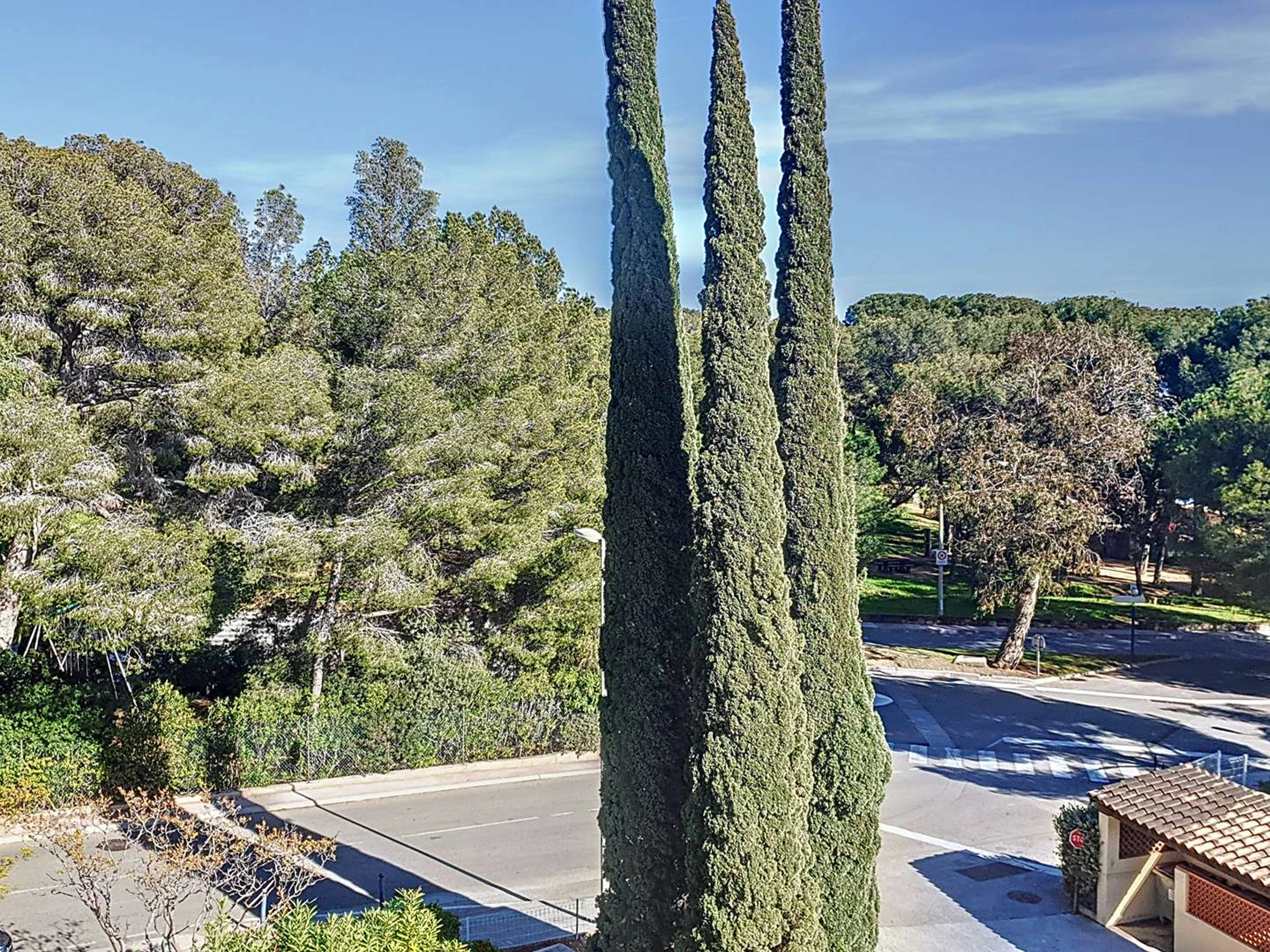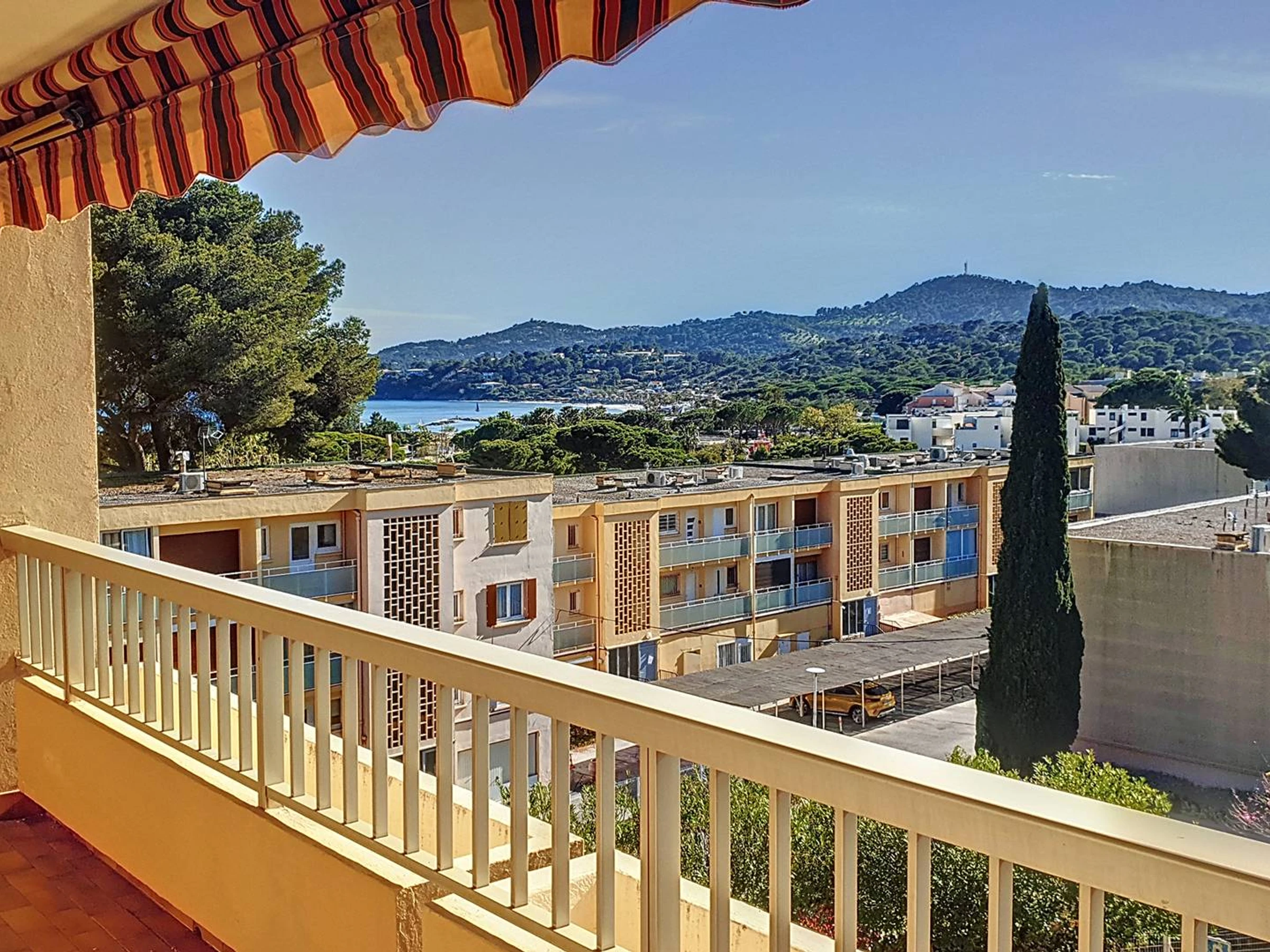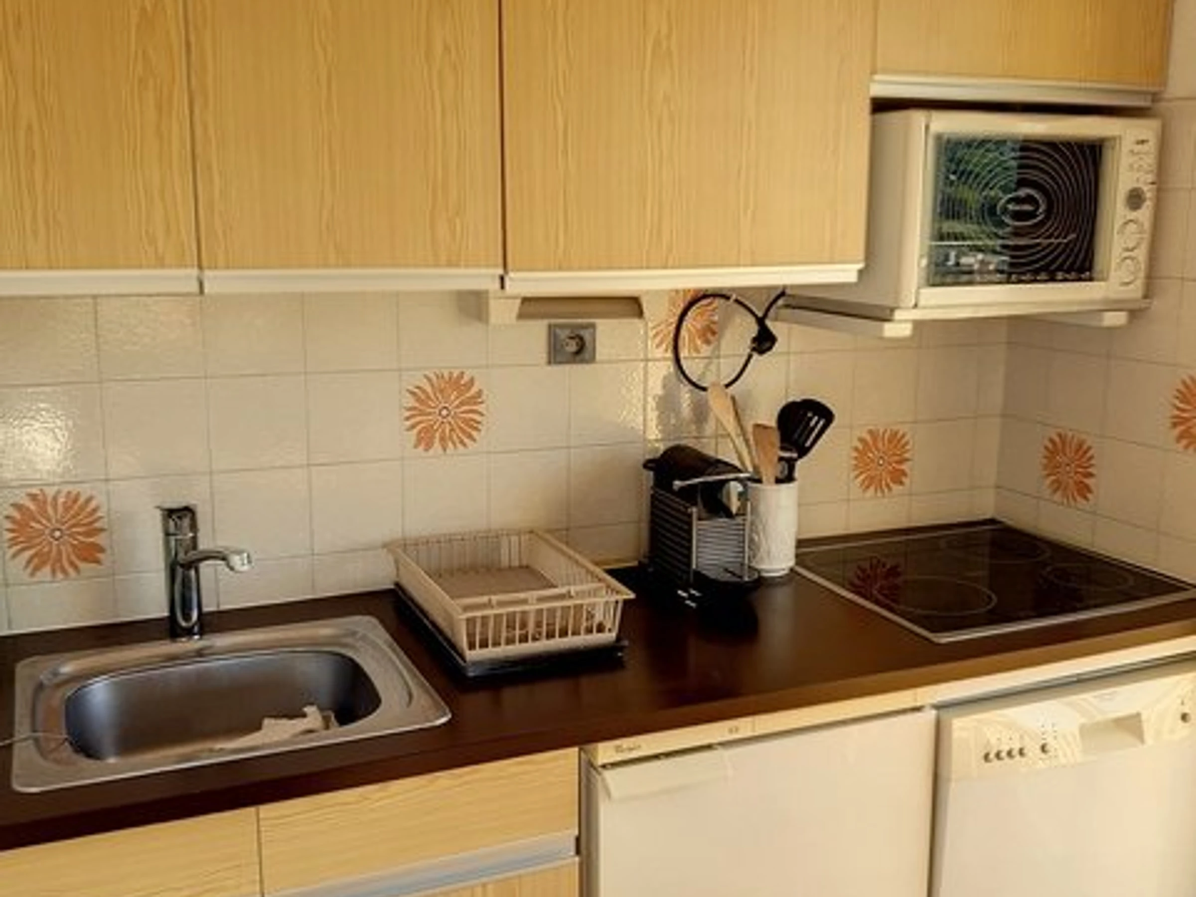 Doble Vista y exposición Este Suroeste para este bonito T2, equipado con una Logia en el lado de la Sala de estar y un Balcón en el lado de la cocina; Podrá disfrutar del sol por la mañana para el desayuno y la Logia para el final del día. Una cocina funcional, una sala de estar con un gran sofá cama y TV, con vistas a la Logia equipada (mesa y sillas) con una vista muy agradable de los jardines de la Residencia, la colina y una pequeña vista al [hidden] accesos, uno a la puerta al pie de la cornisa de Iles d'Or, otro callejón sin salida de Brise Marine que te lleva directamente a las tiendas.