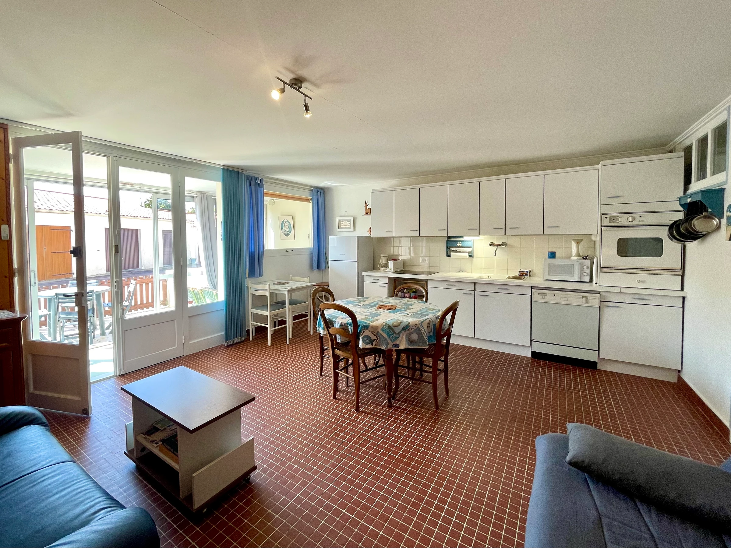 Consta de un salón de aproximadamente 22 m² con cocina totalmente equipada (vitrocerámica, horno, microondas, lavavajillas), un comedor (mesa, sillas) y una zona de estar (dos sofás, uno de ellos cama, mesa de centro y TV de pantalla plana).
