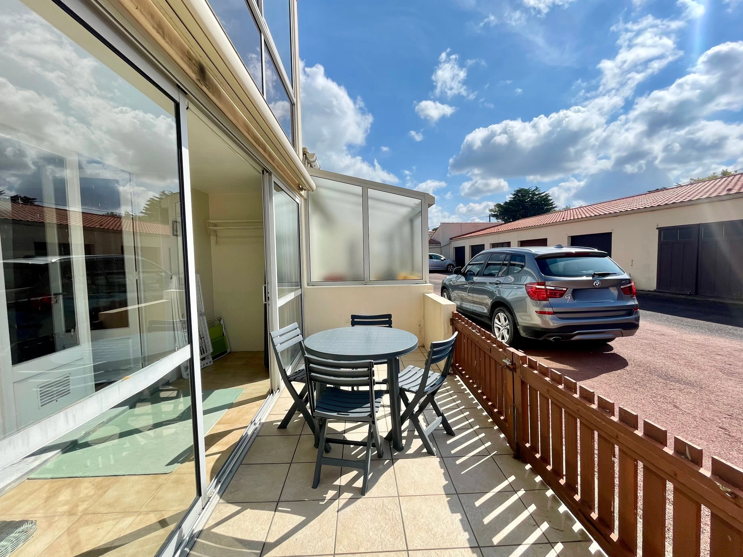 El salón da a una galería en la parte trasera de la residencia, que a su vez da a una terraza con muebles de jardín (mesa, sillas, toldo y conjunto de ratán).