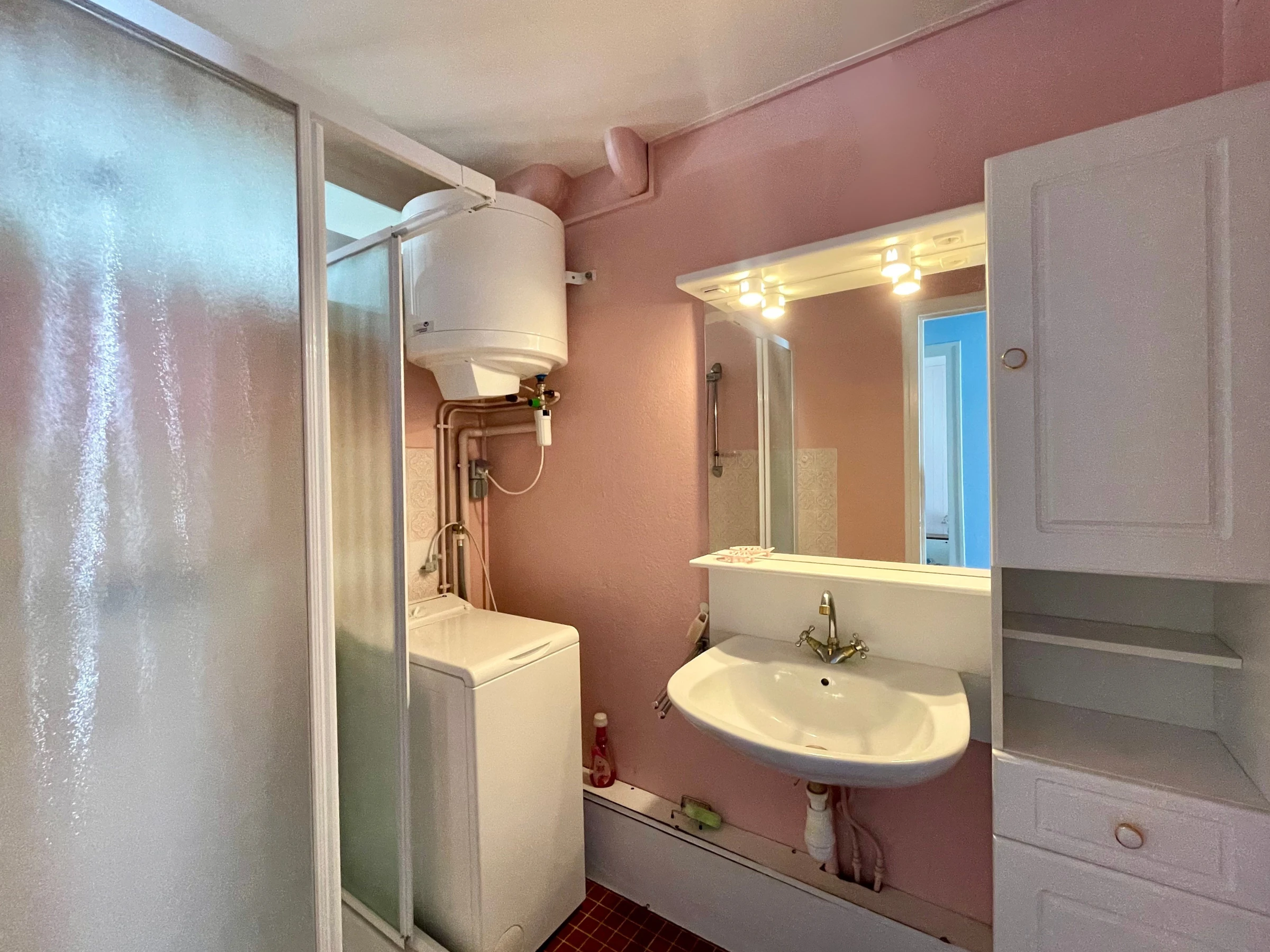 Un pasillo conduce al dormitorio, un aseo independiente y el baño (lavabo, ducha y lavadora).