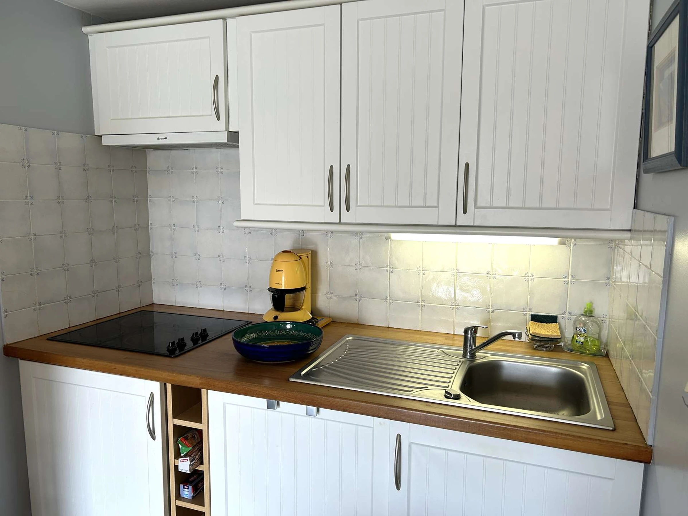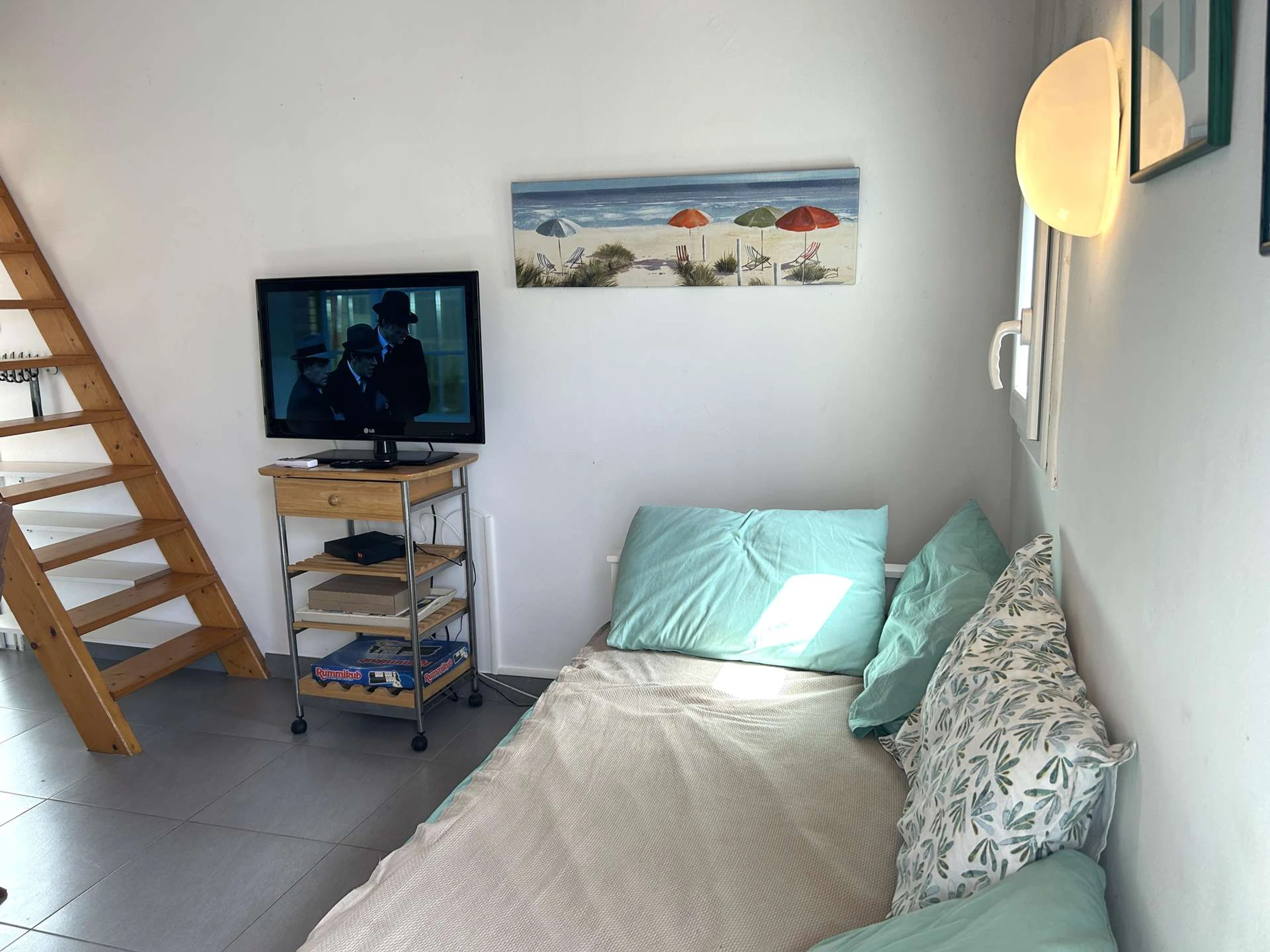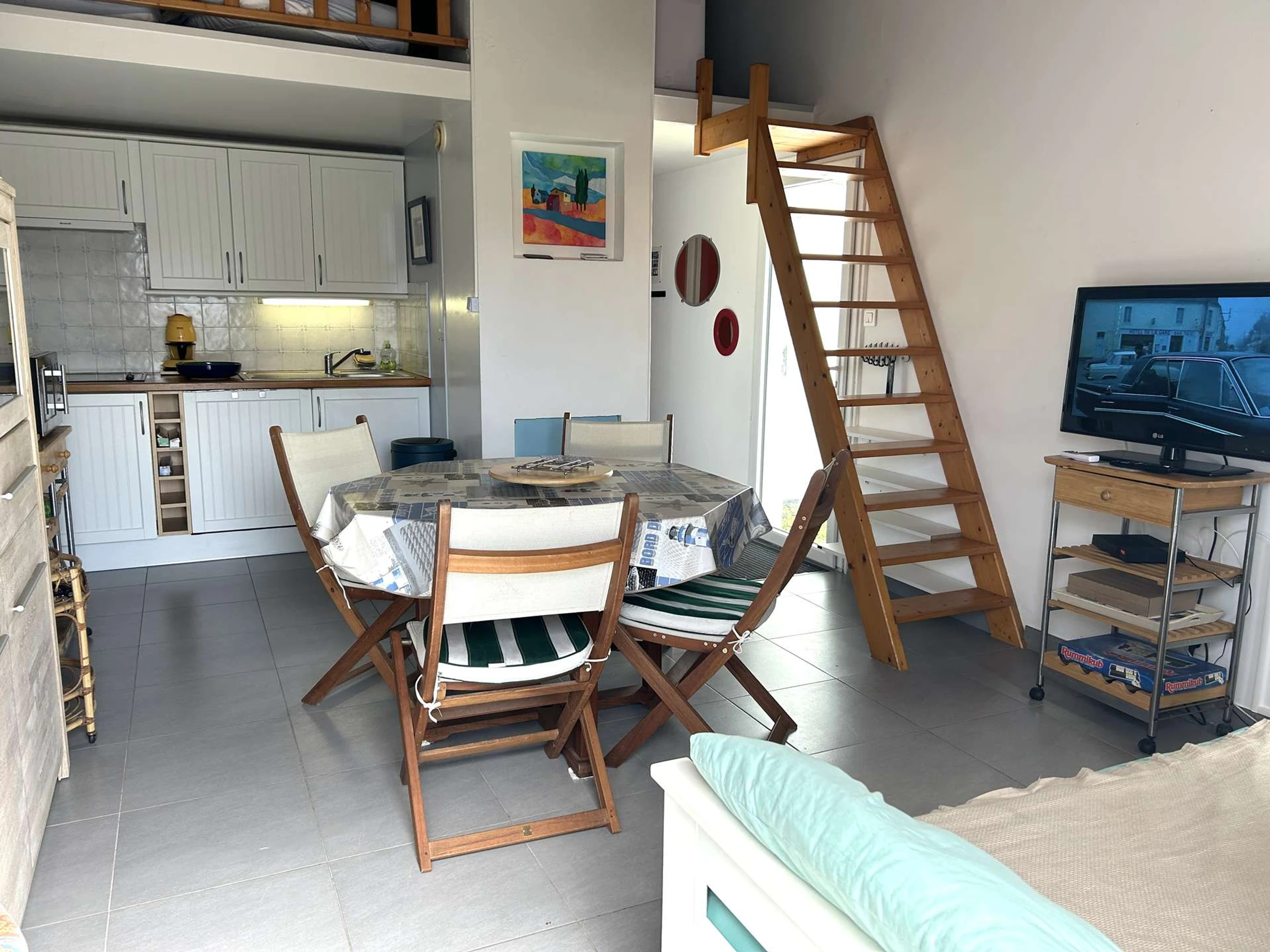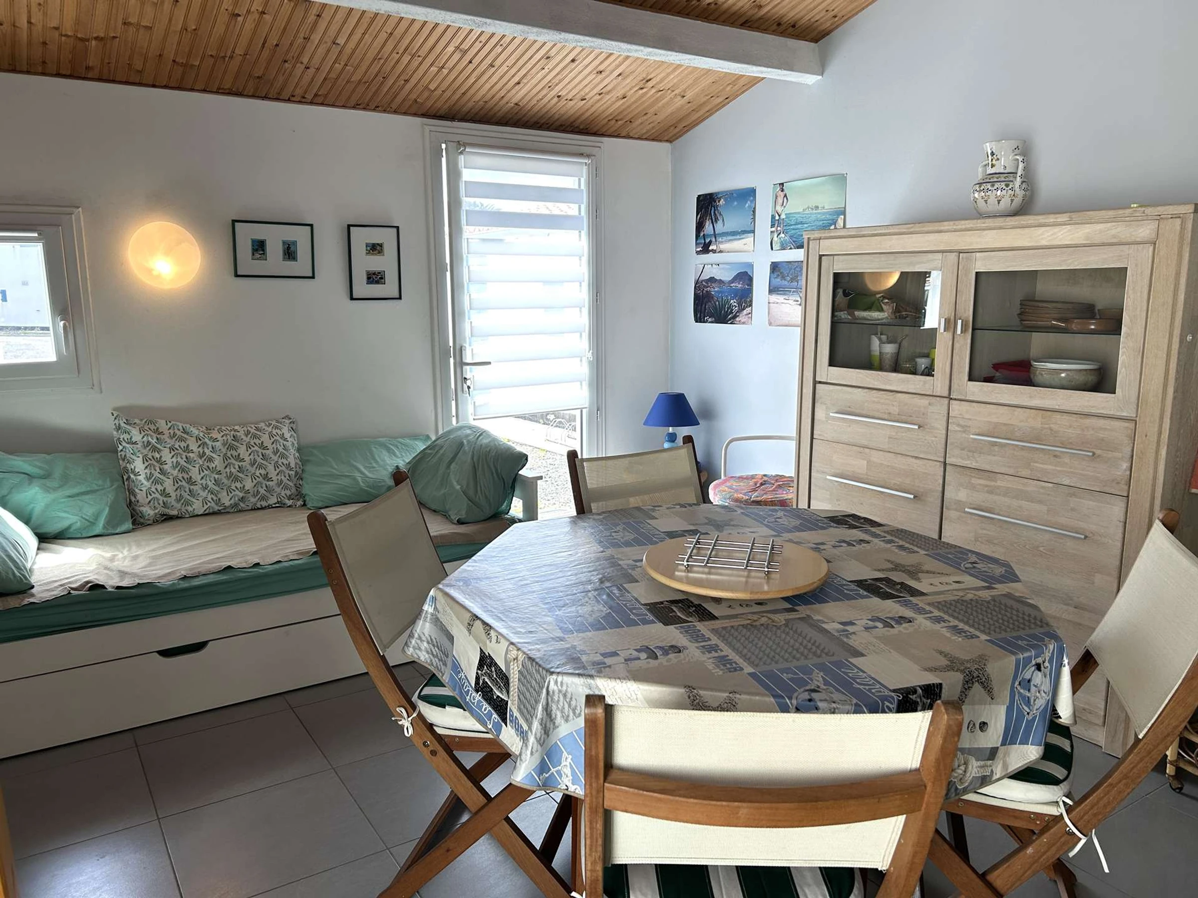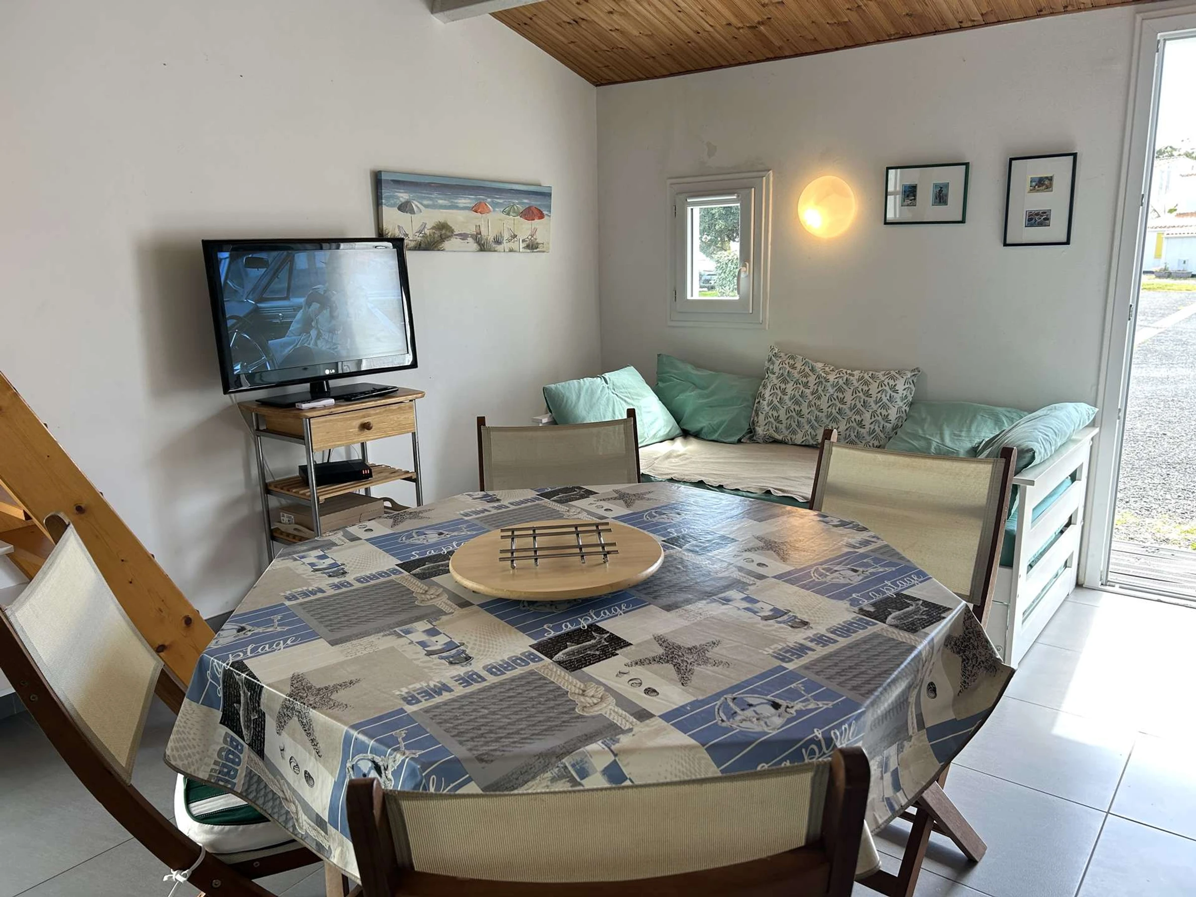 Esta casa vacacional incluye una cocina americana totalmente equipada (lavavajillas), una sala de estar con TV y sofá cama para dos personas, un dormitorio con cama de matrimonio, un altillo (altura máxima 1,40 m, con acceso por escalera) con dos camas individuales, un cuarto de ducha y un aseo independiente.