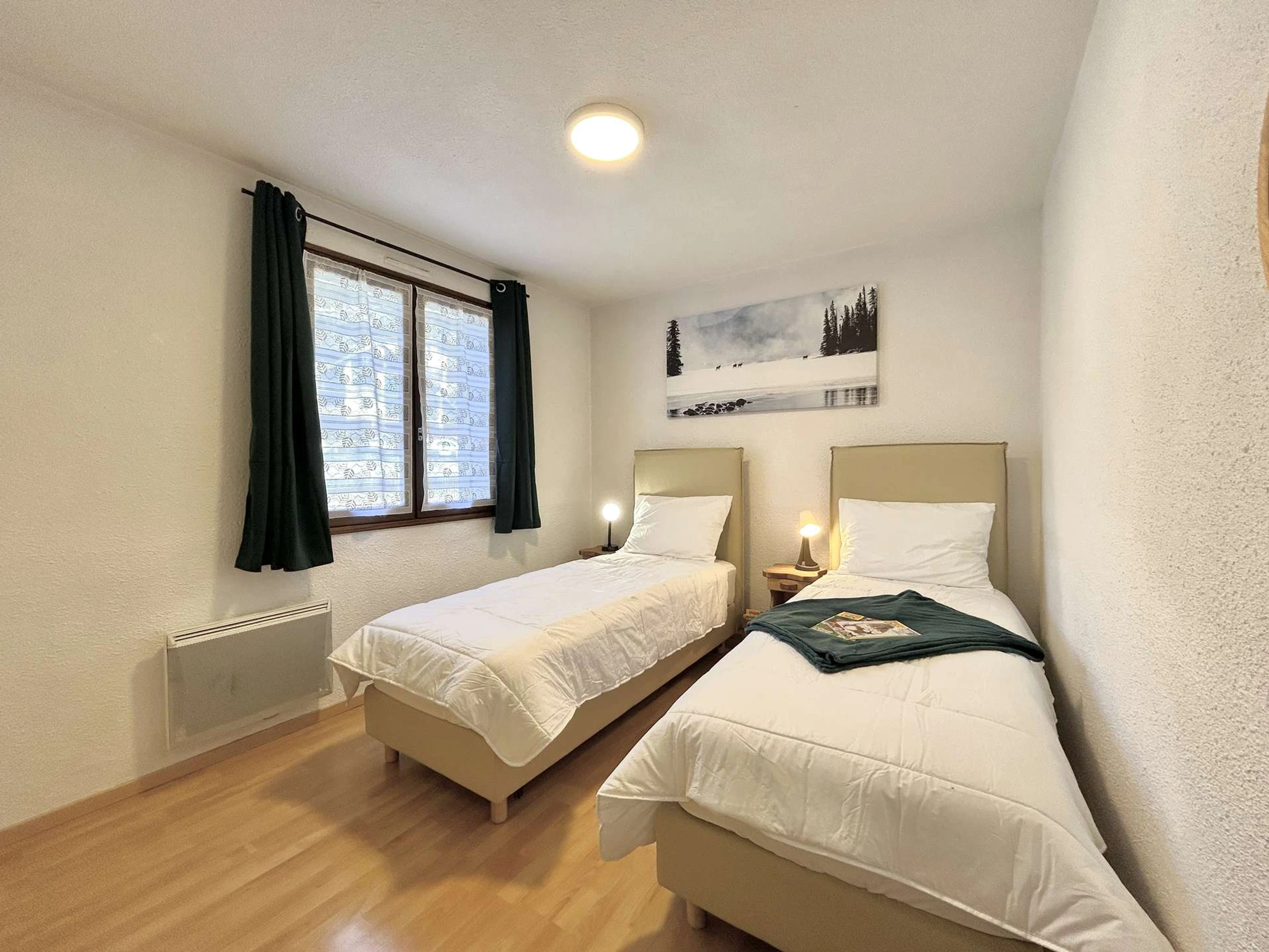 - Dormitorio principal con dos camas individuales (80x200 cm) que se pueden unir para formar una cama doble (160x200 cm),