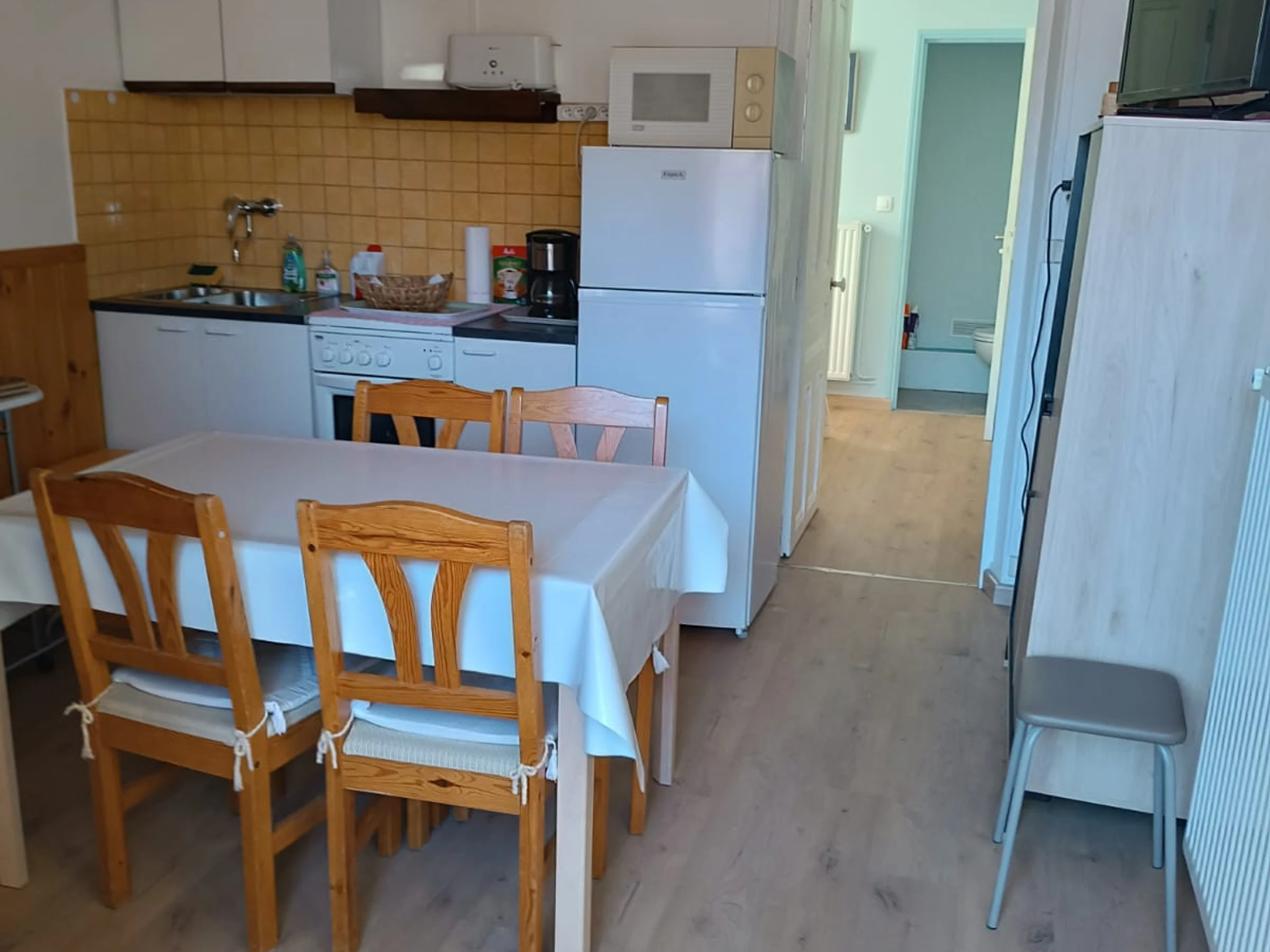 Cocina : cocina americana, Equipamiento cocina : cafetera de filtro. , lavaplatos, cocina electrica, set de fondue, nevera, Hervidor eléctrico,, Microondas, Horno, tostador