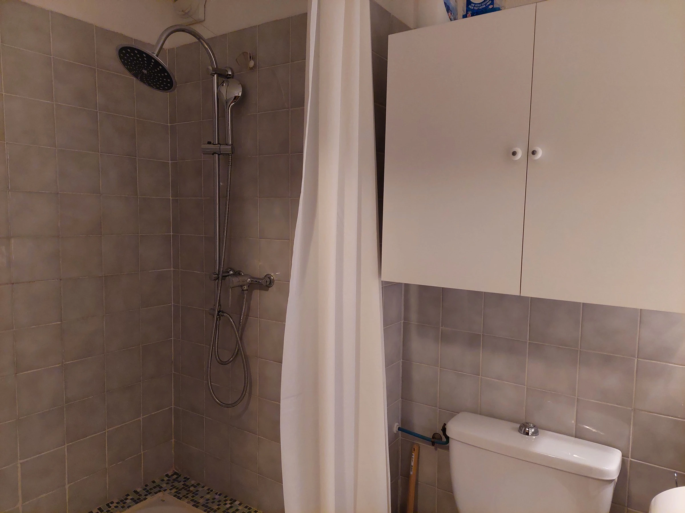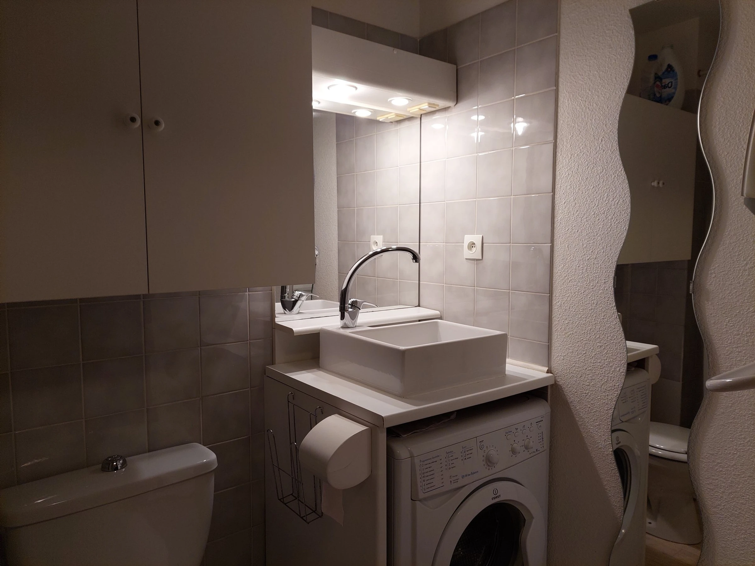 Con ducha, inodoro y lavadora.