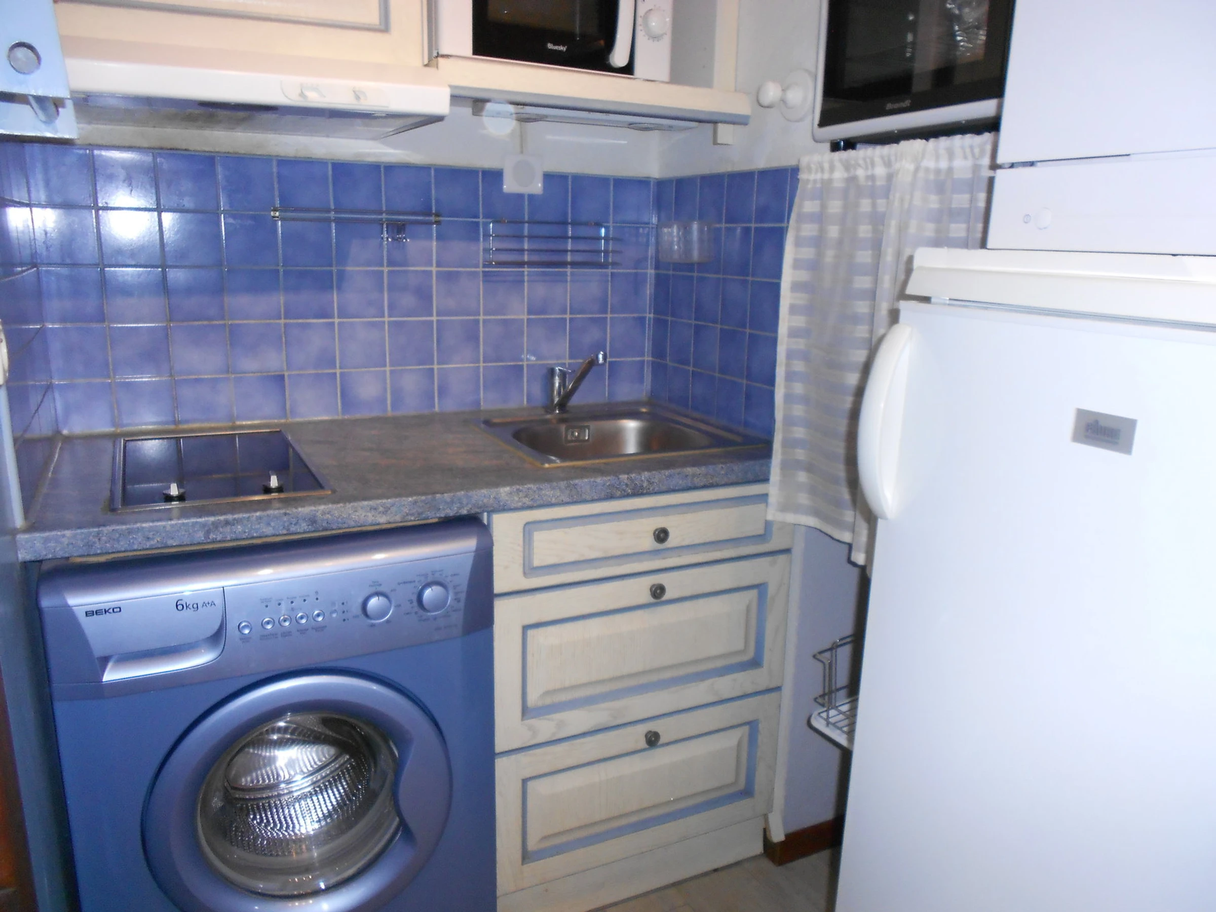Cocina con placa de inducción, lavadora, microondas y frigorífico.
