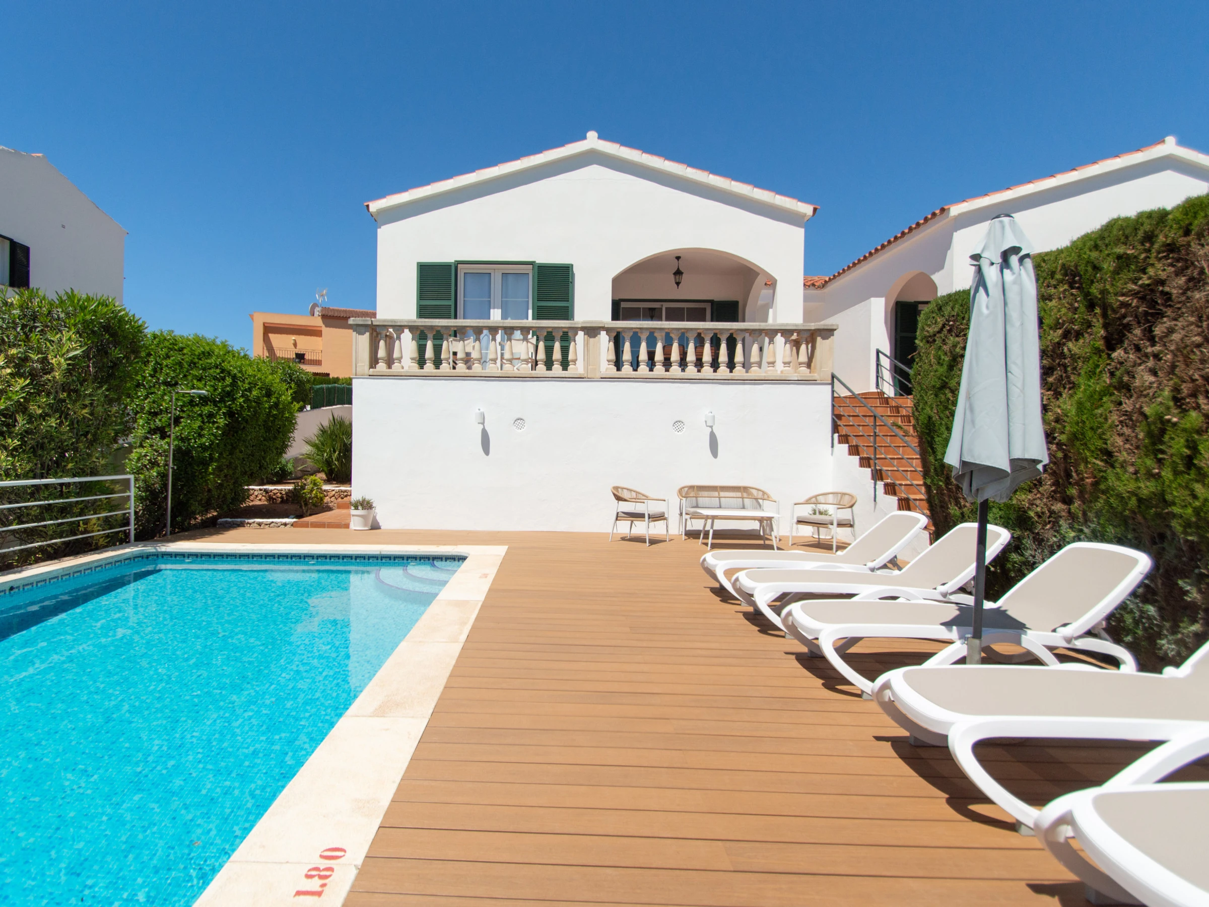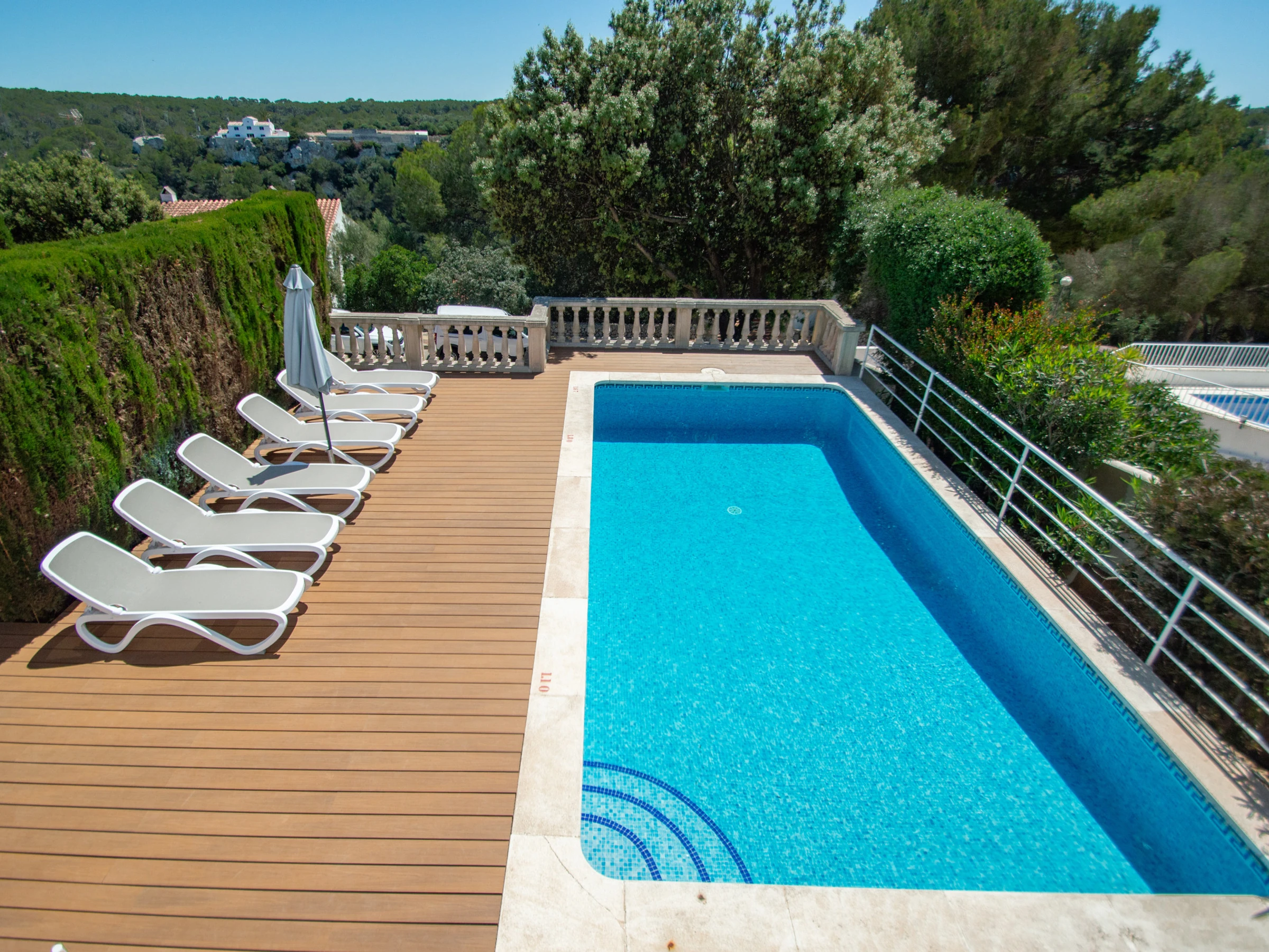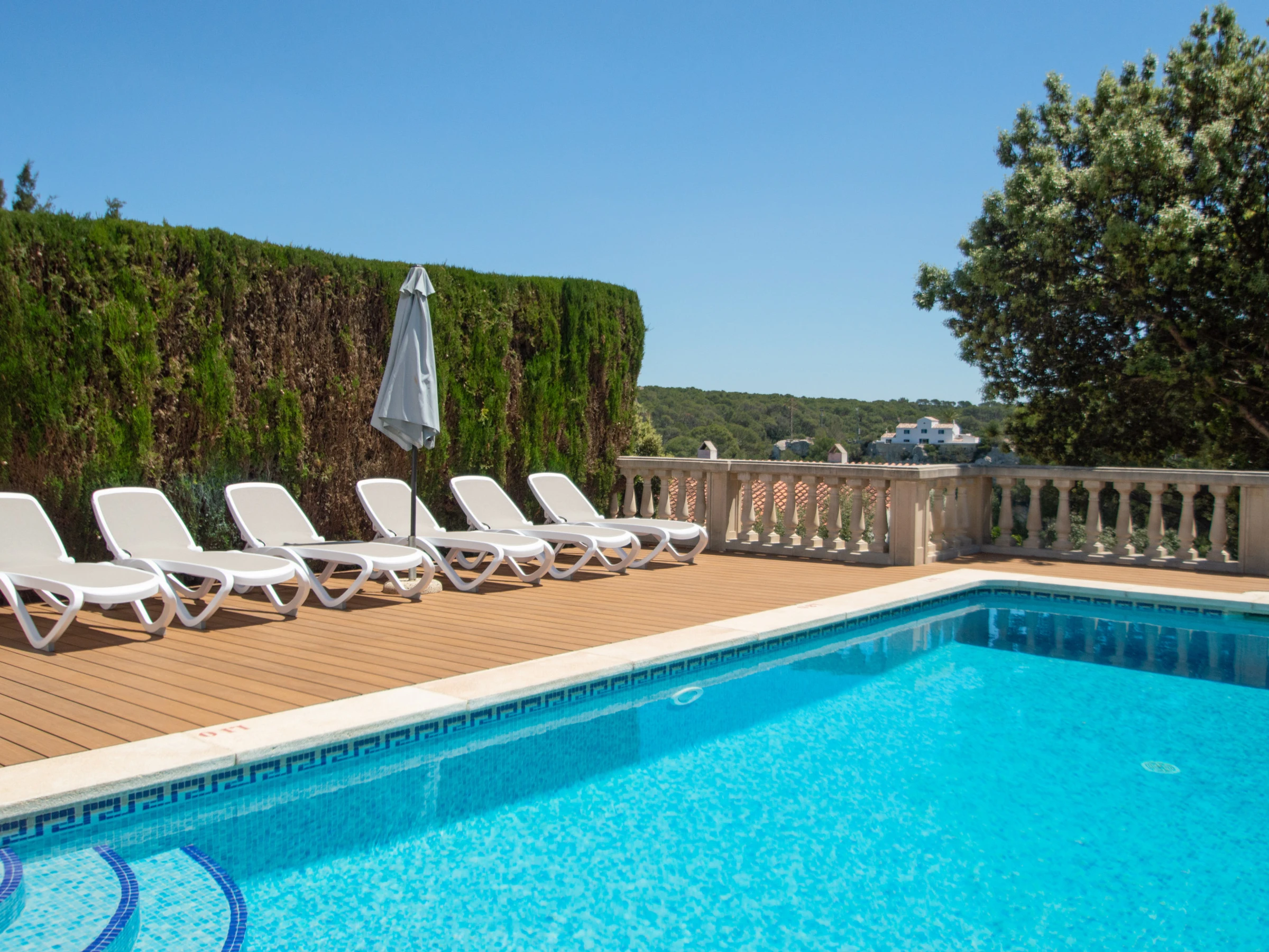 La villa en alquiler en Menorca goza de una amplia piscina y una zona ajardinada que ofrece total privacidad. Cuenta con hamacas para todos los huéspedes y mobiliario de jardín.