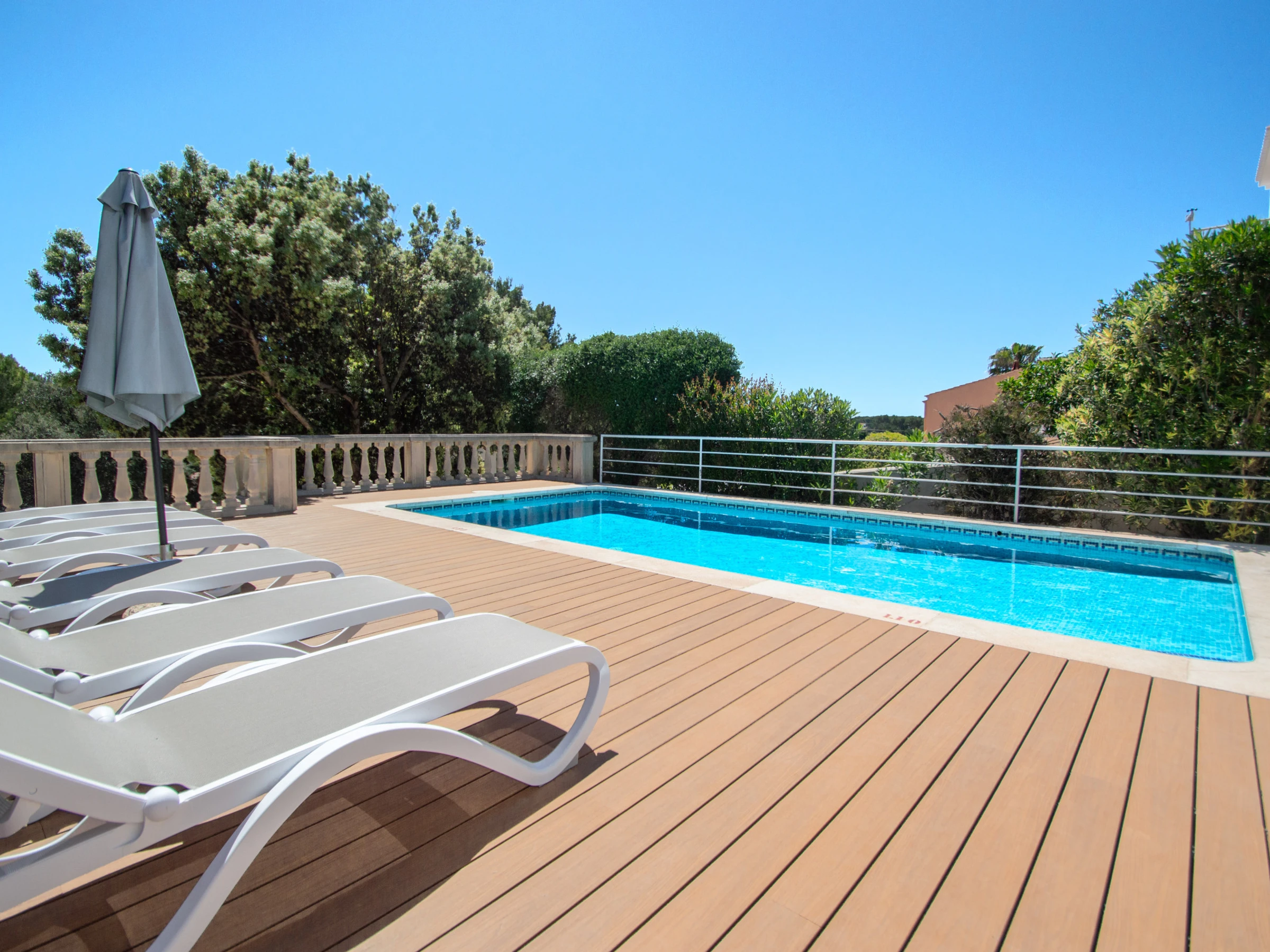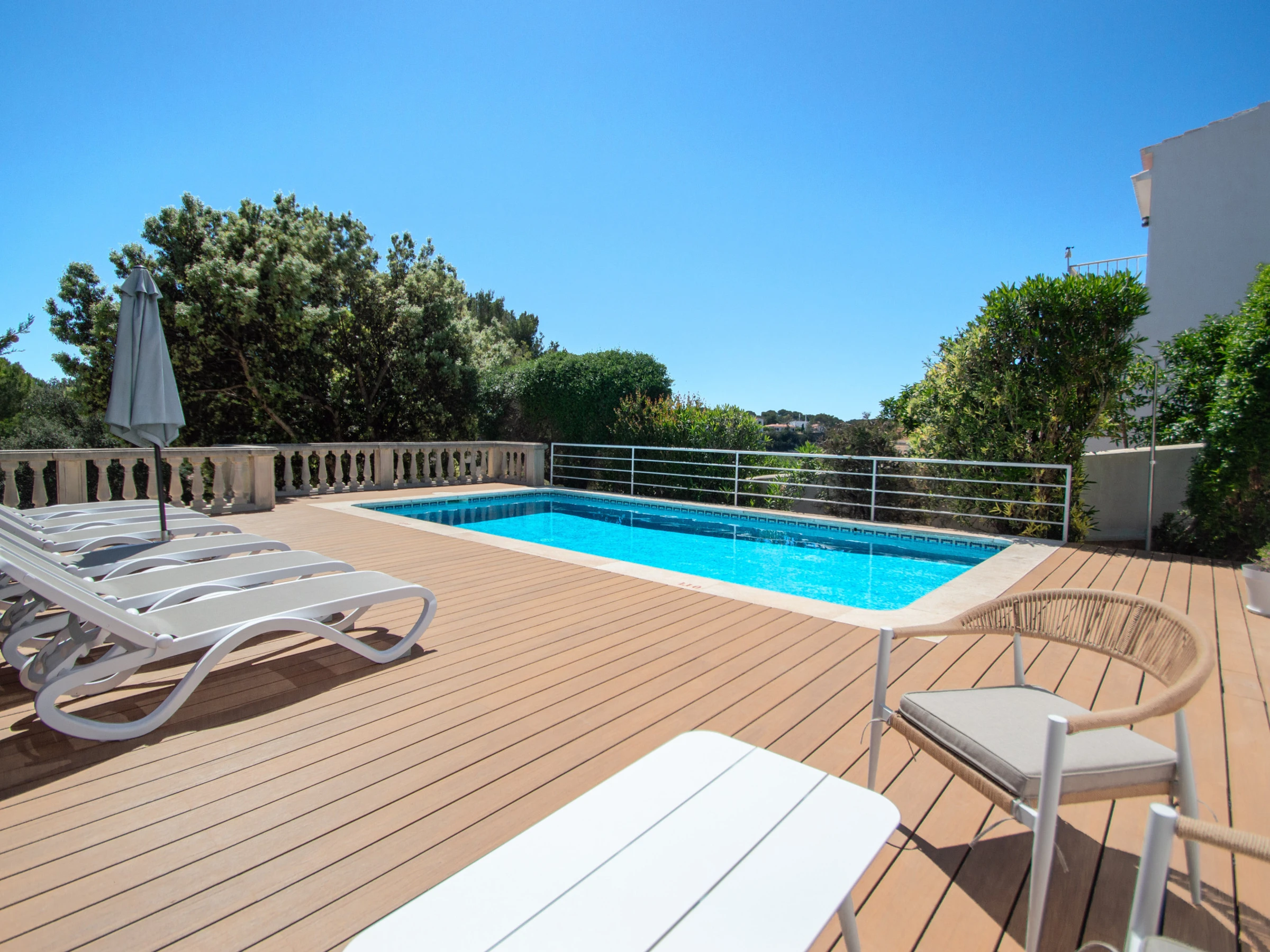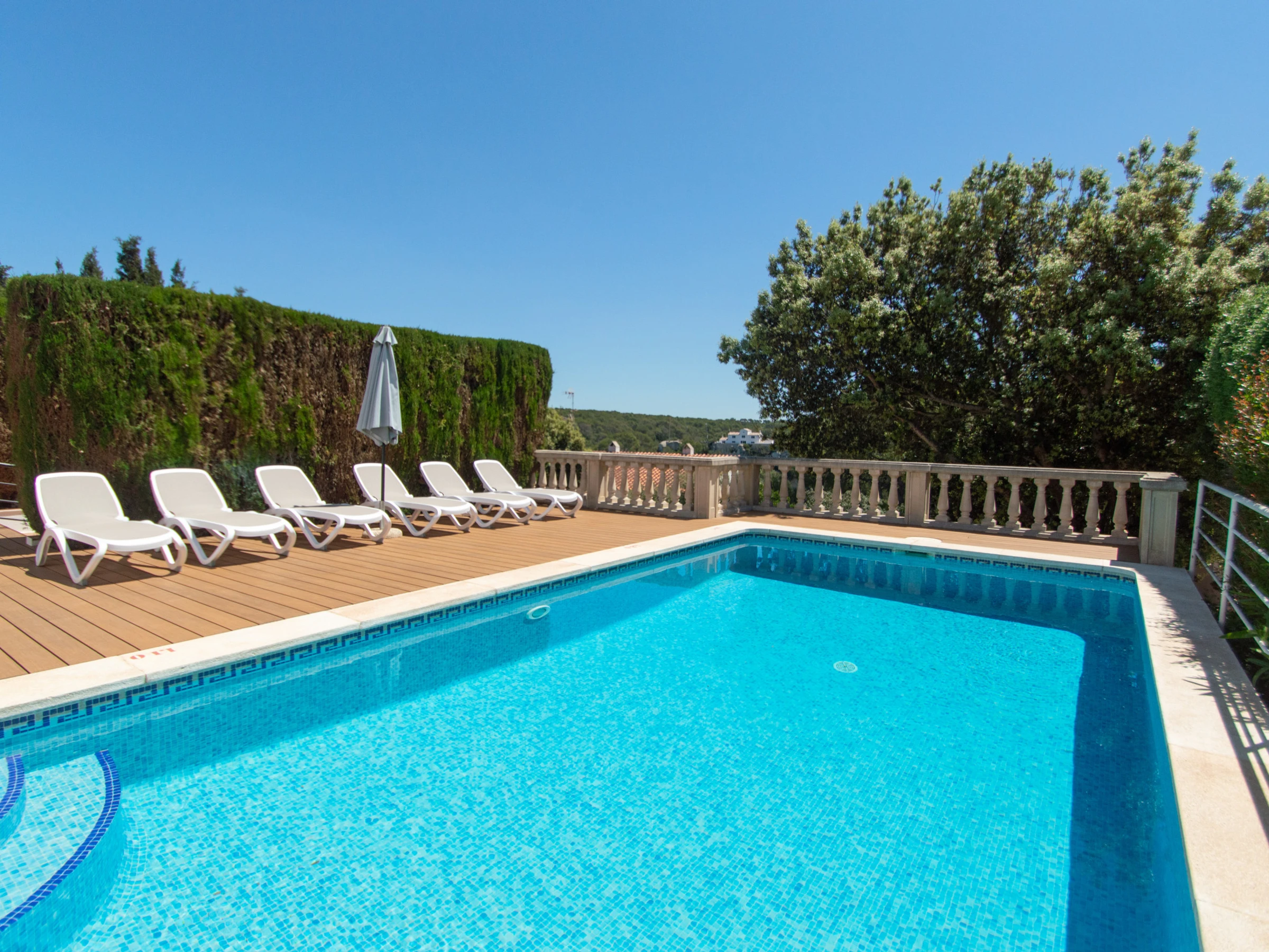 La villa en alquiler en Menorca goza de una amplia piscina y una zona ajardinada que ofrece total privacidad. Cuenta con hamacas para todos los huéspedes y mobiliario de jardín.