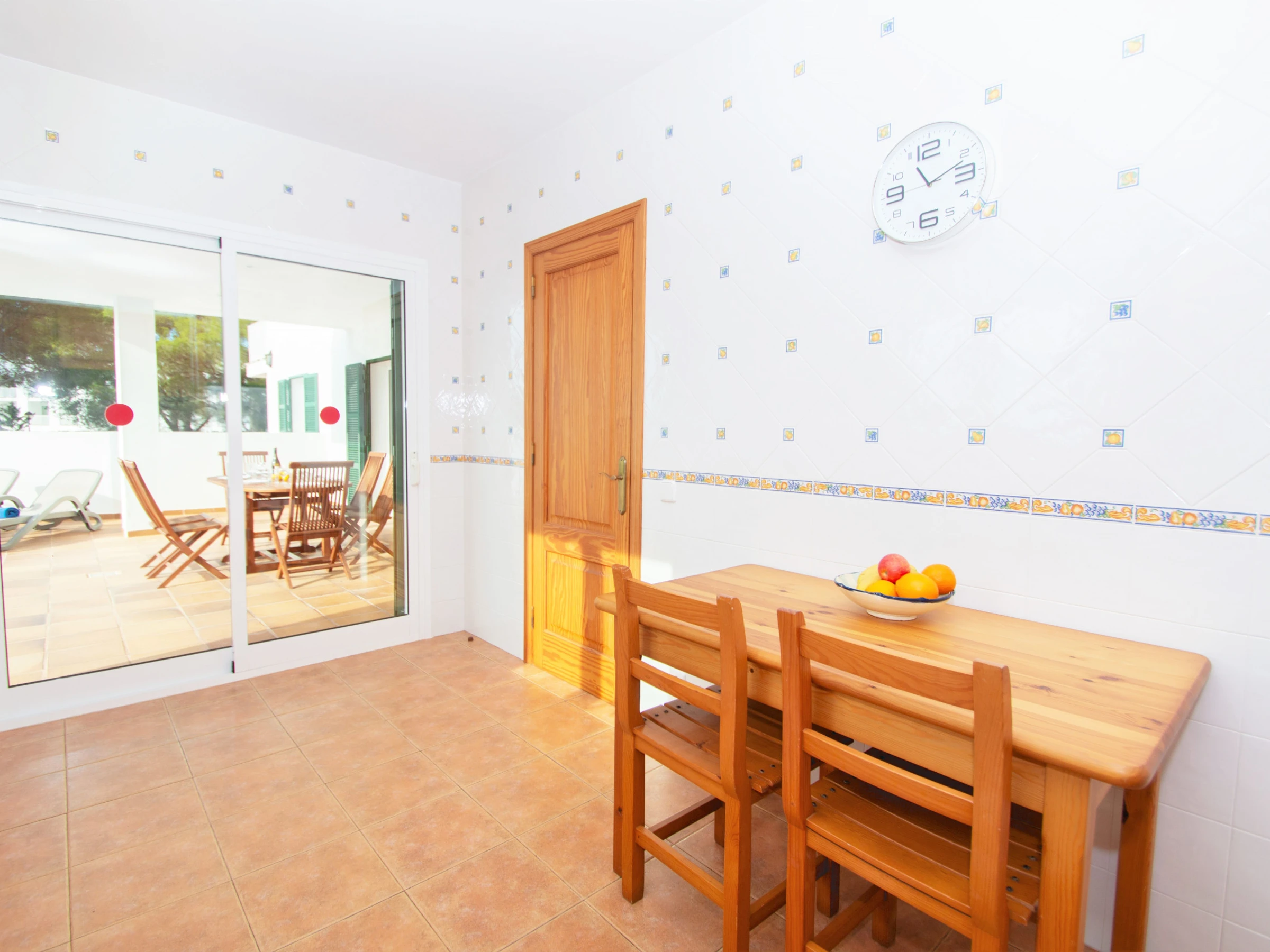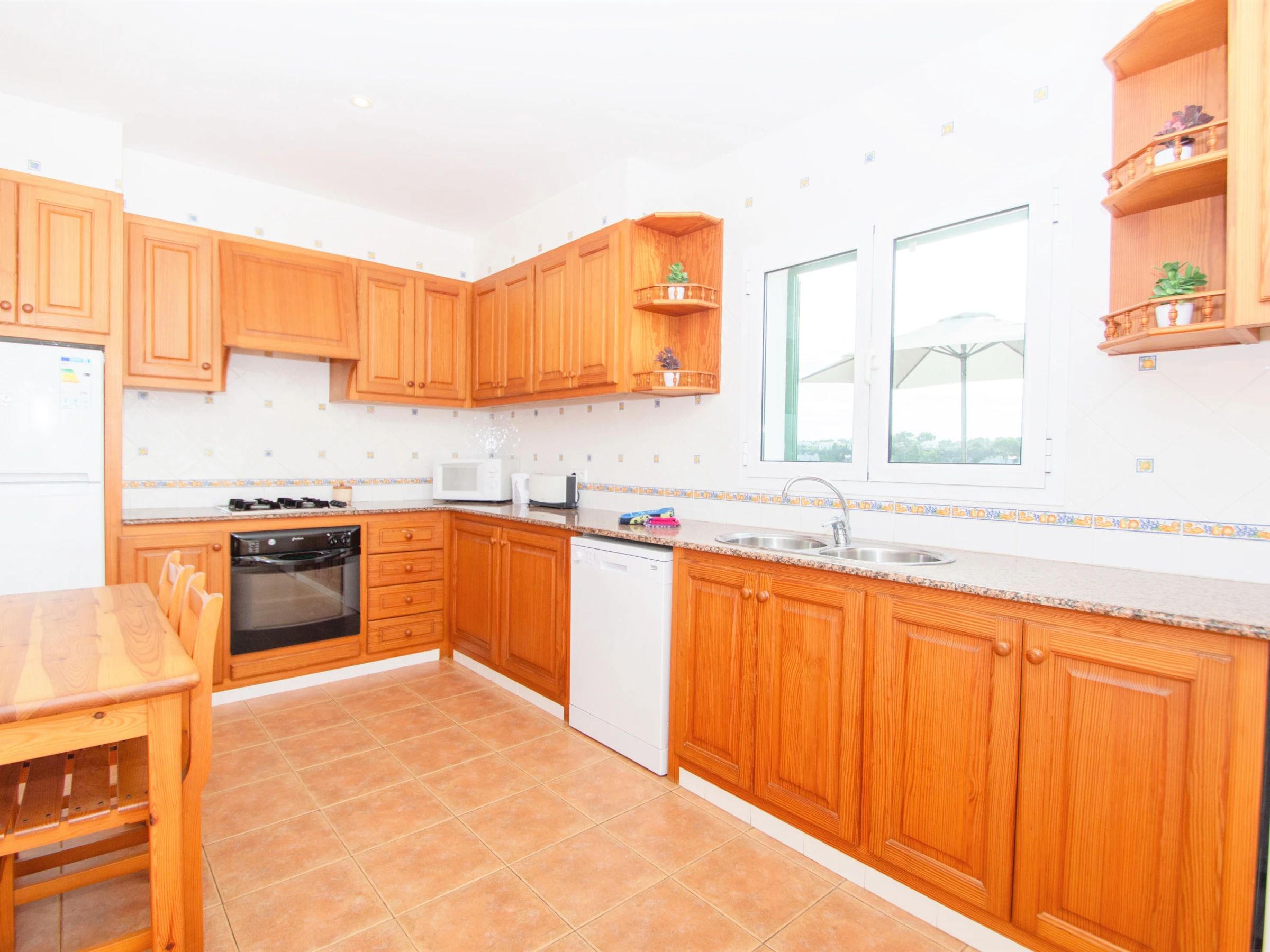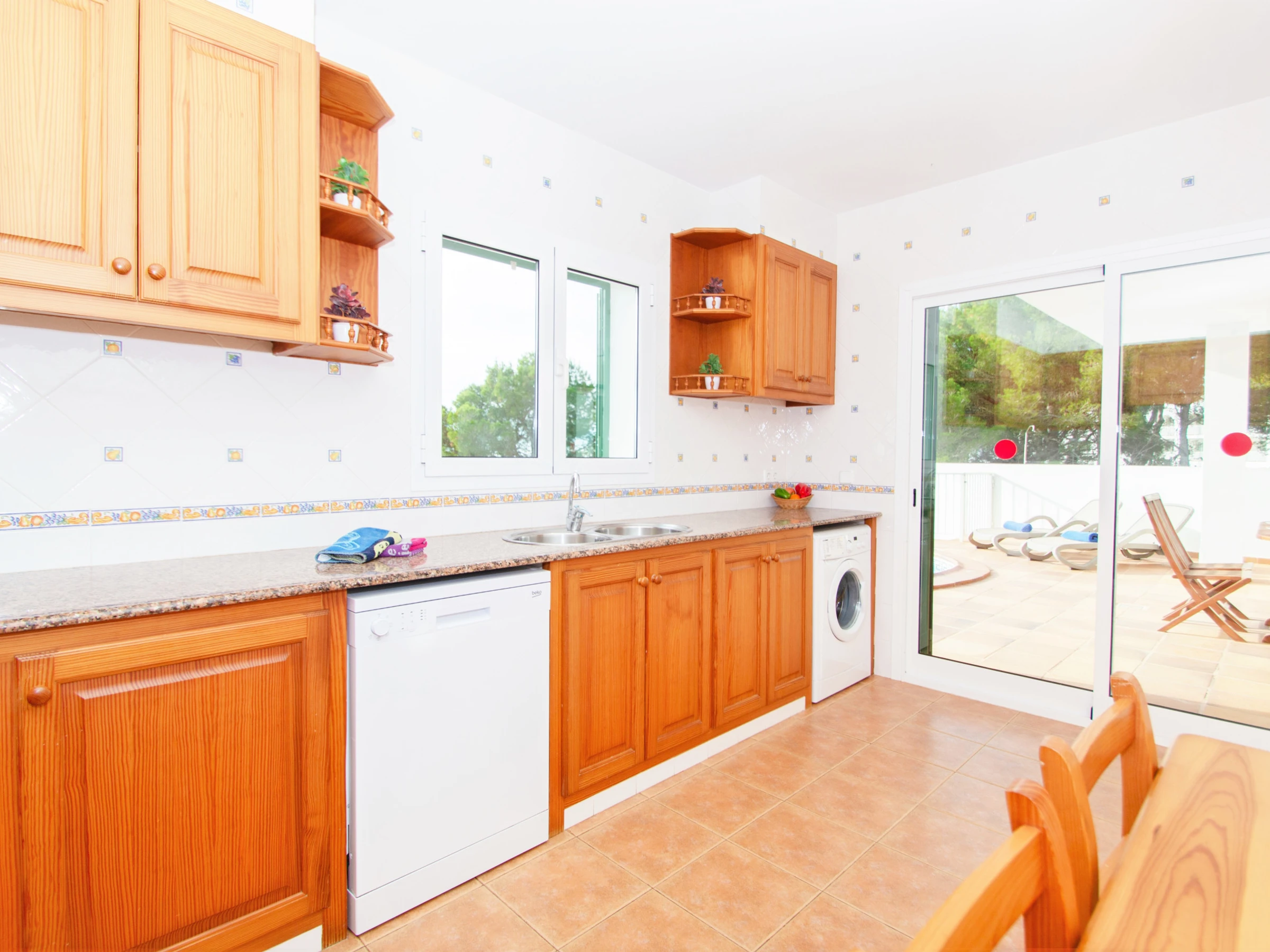 Entras a la villa por una bonita zona ajardinada hasta llegar a la puerta principal que da paso a la entrada de la villa. A mano izquierda del recibidor encontramos la primera habitación doble. Ésta está equipada con una cama de matrimonio y un amplio armario para guardar la ropa. A continuación, encontramos un baño, equipado con plato de ducha y secador. Además, este está adaptado para personas con movilidad reducida. Justo al lado, se encuentra la cocina totalmente equipada. Dispone de fogones, horno, lavavajillas, frigorífico, microondas, cafetera, tostadora, hervidor de agua y todo el menaje de cocina necesario. La amplia cocina cuenta con acceso a la zona exterior de la piscina.