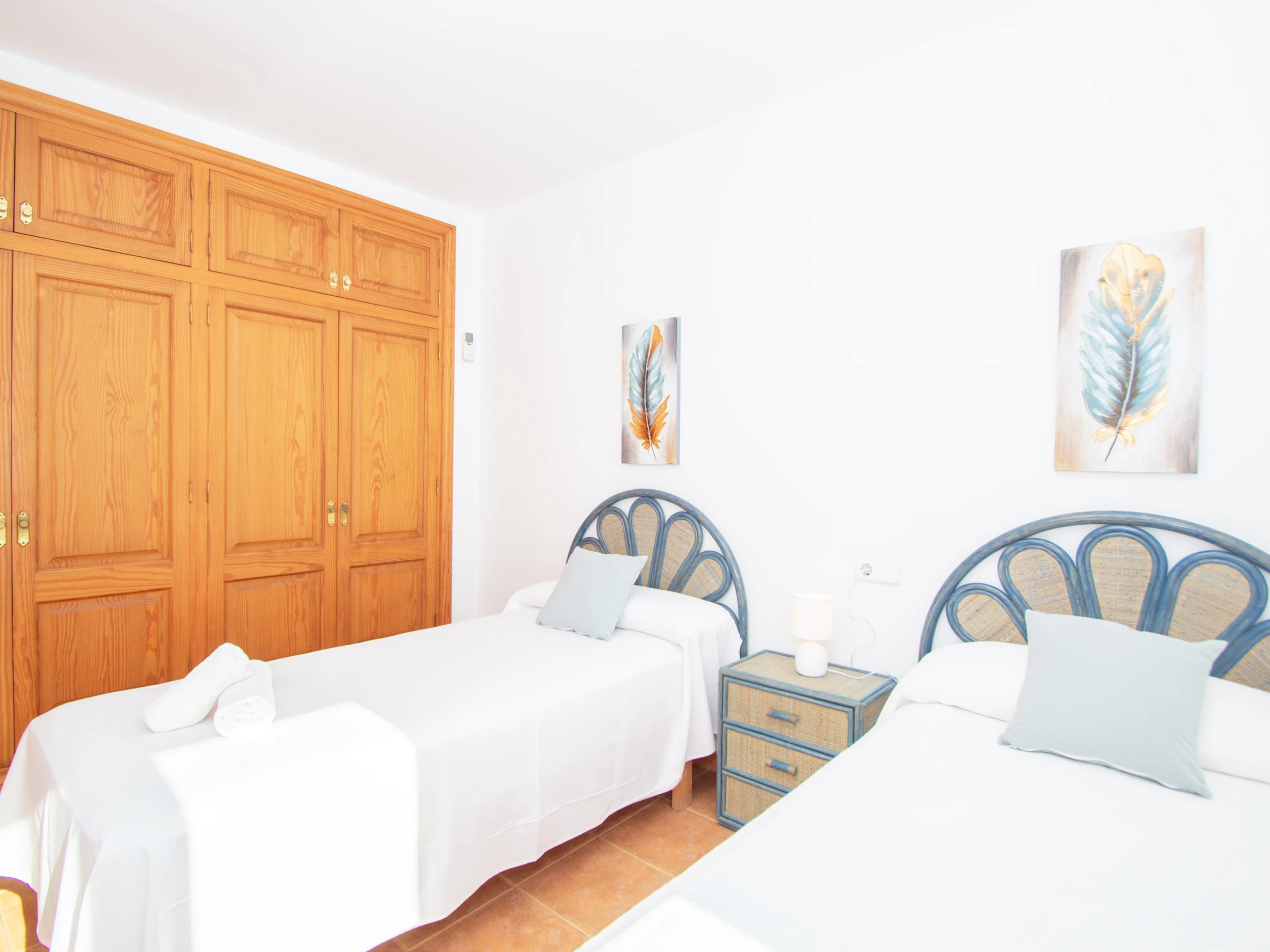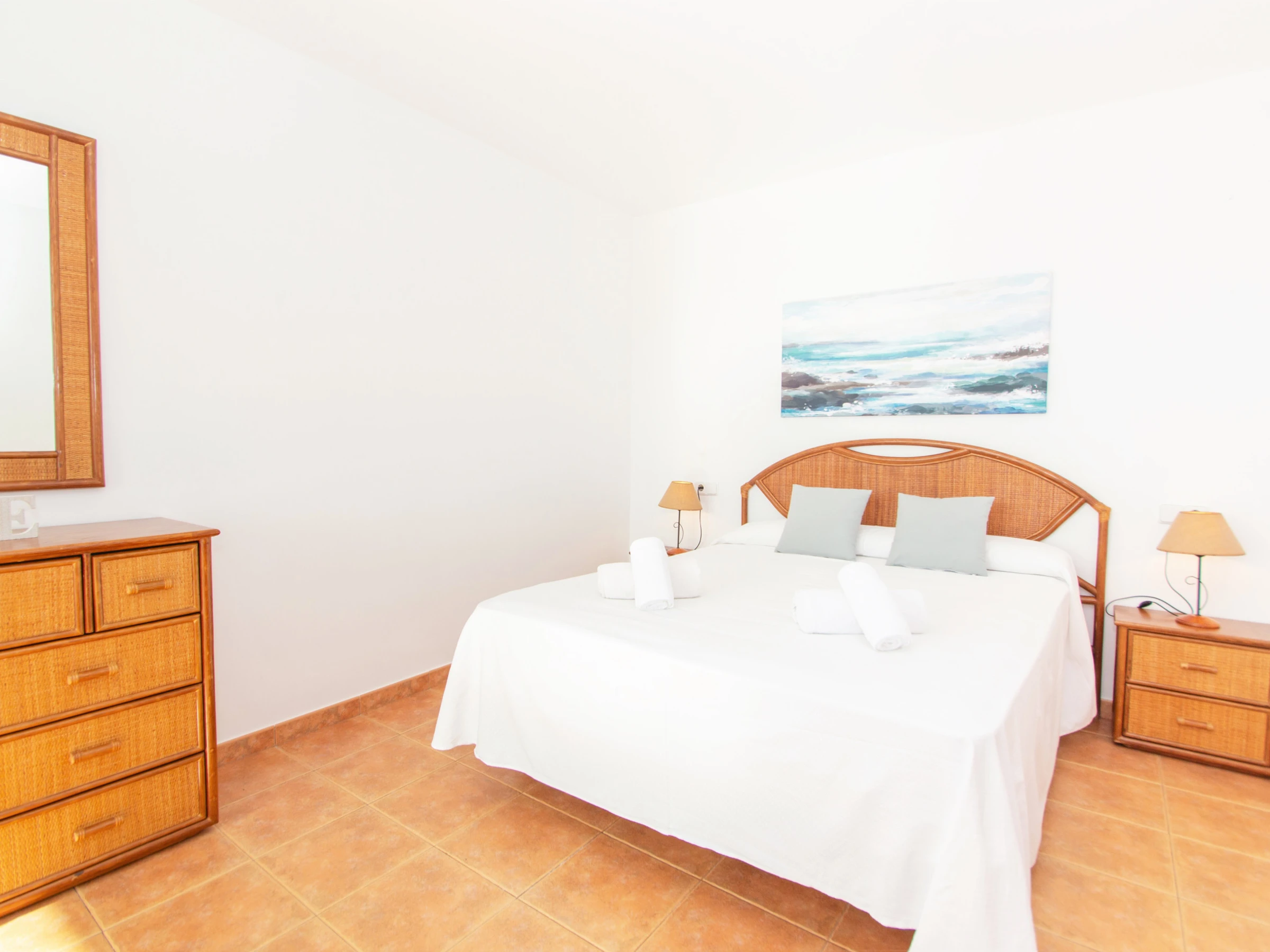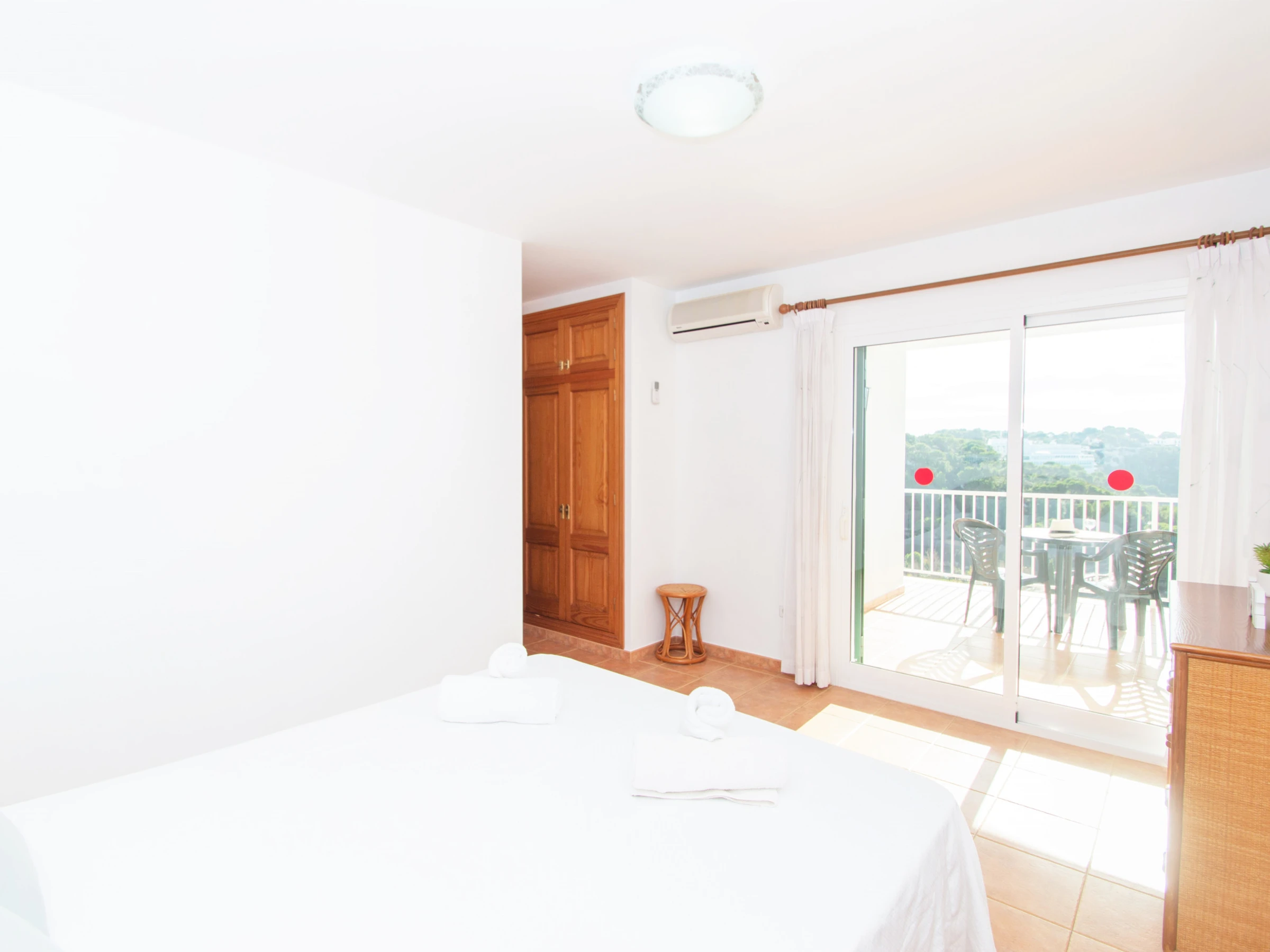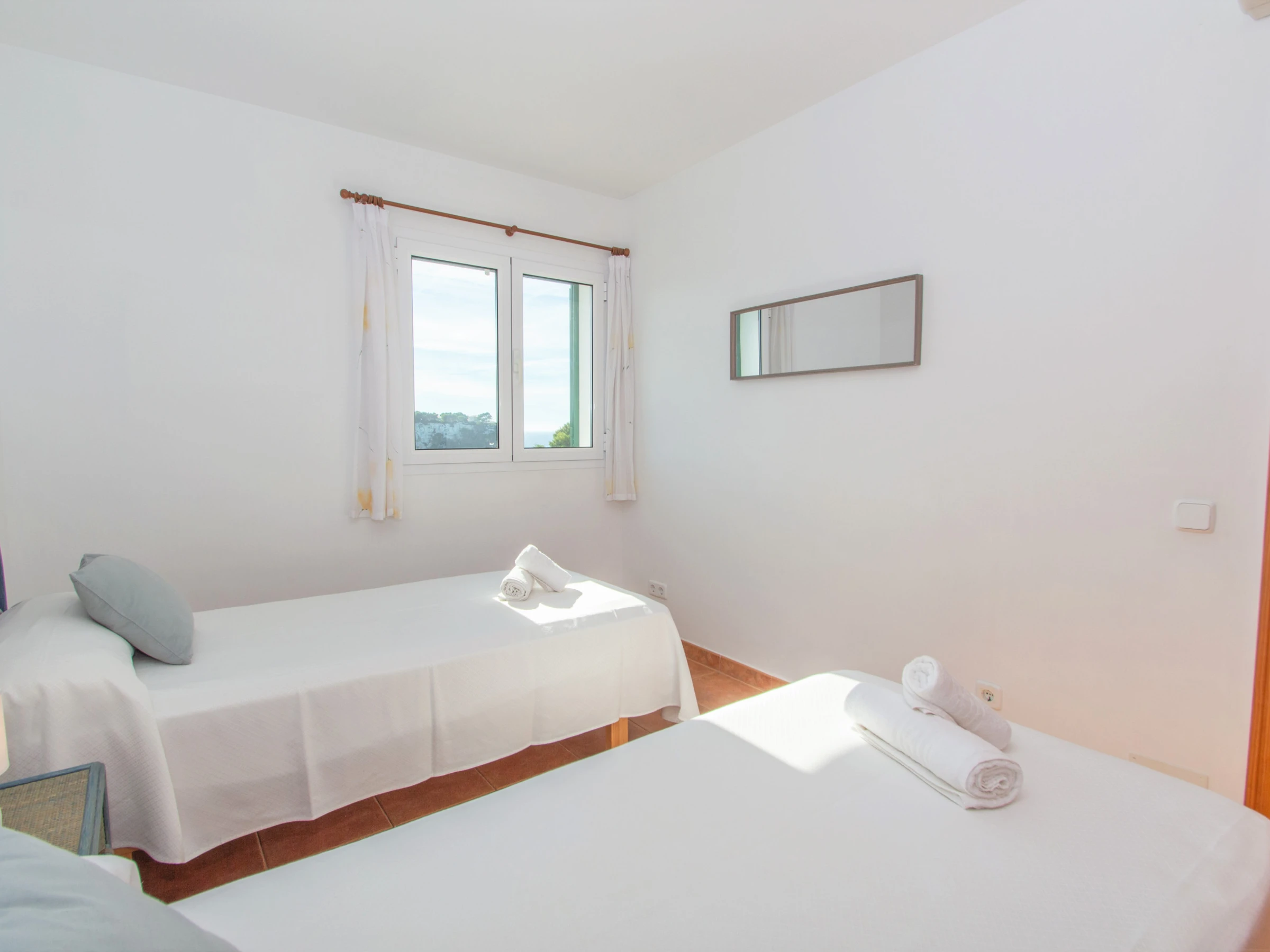 Las demás habitaciones se encuentran en el primer nivel. La primera habitación doble cuenta con dos camas individuales y están equipadas con un buen armario y aire acondicionado. El otro dormitorio está equipado con una cama individual y dispone acceso directo al balcón, que cuenta con unas bonitas vistas a la playa. A continuación, entre las dos habitaciones, encontramos el cuarto de baño total mente equipado con bañera y secador. Por último, el dormitorio principal, consta de una cómoda cama de matrimonio, un gran armario empotrado, aire acondicionado y un baño completo en suite. El baño está equipado con bañera. El dormitorio principal cuenta también con un bonito balcón y de esas maravillosas vistas a la playa de Cala Galdana, desde la cama.