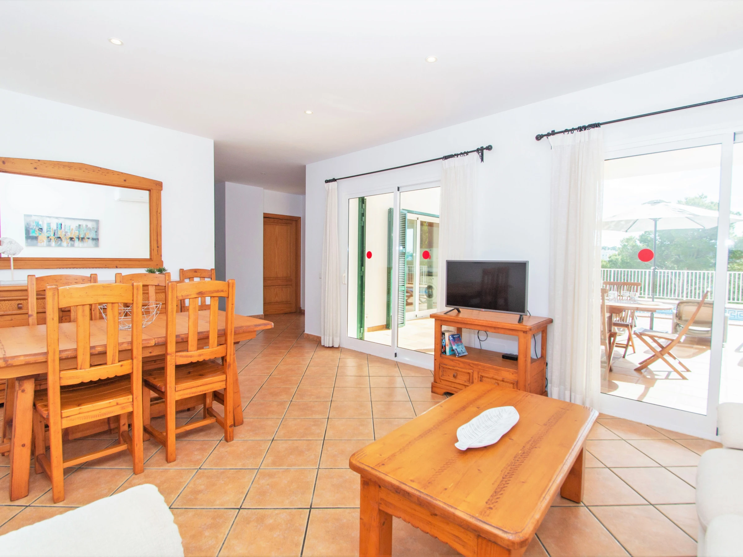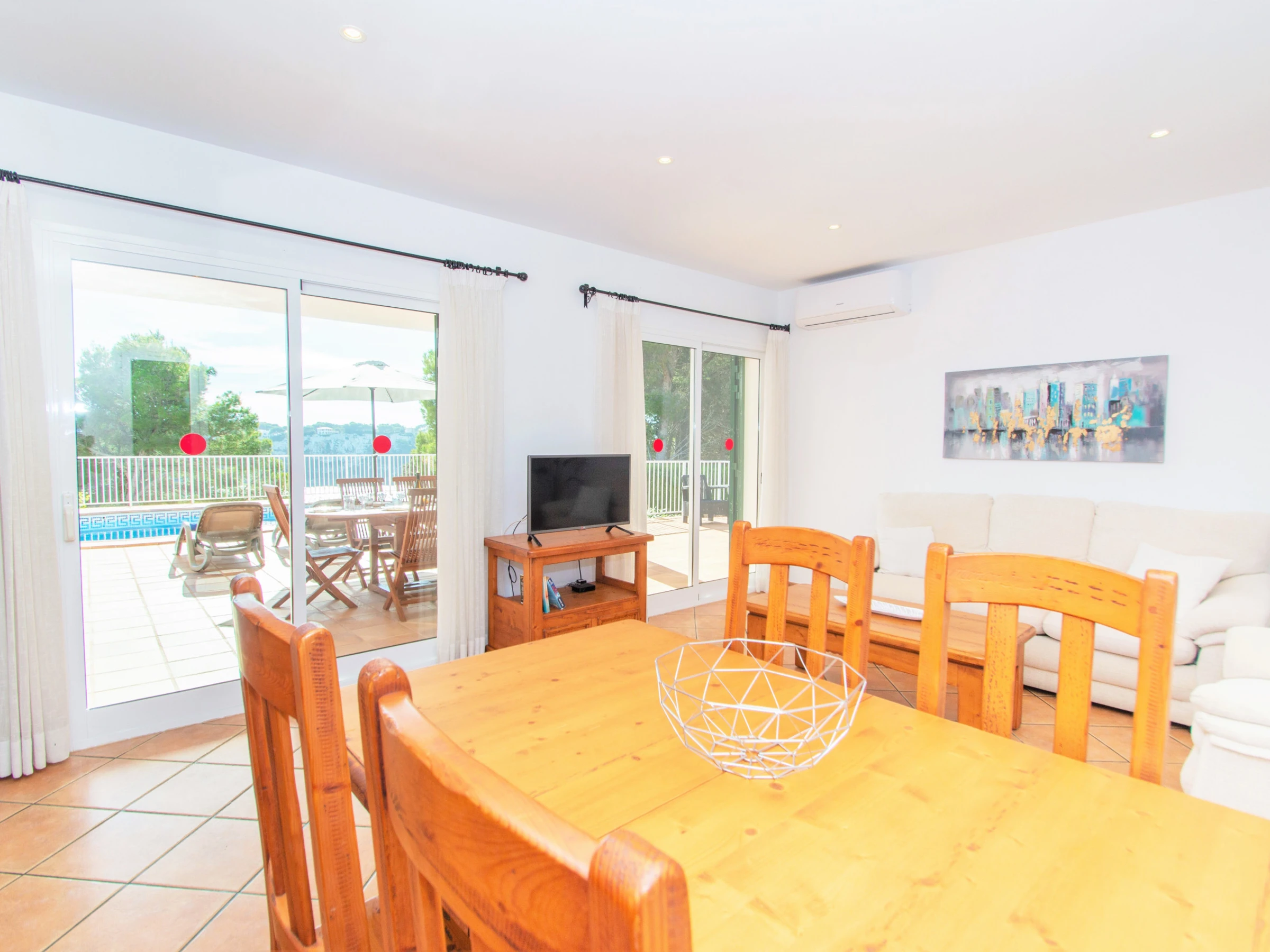 A mano derecha del recibidor, encontramos el acogedor salón-comedor equipado con TV digital de pantalla plana vía satélite, un sofá y un cómodo sillón, una mesa y sillas para comer. Desde el salón tenemos también acceso directo a la zona de la piscina, que ofrece unas vistas muy bonitas a la paya y al río de Cala Galdana. Éste es un buen sitio para relajarse y disfrutar de una copa de vino mientras disfrutas de esas maravillosas vistas de la playa.
