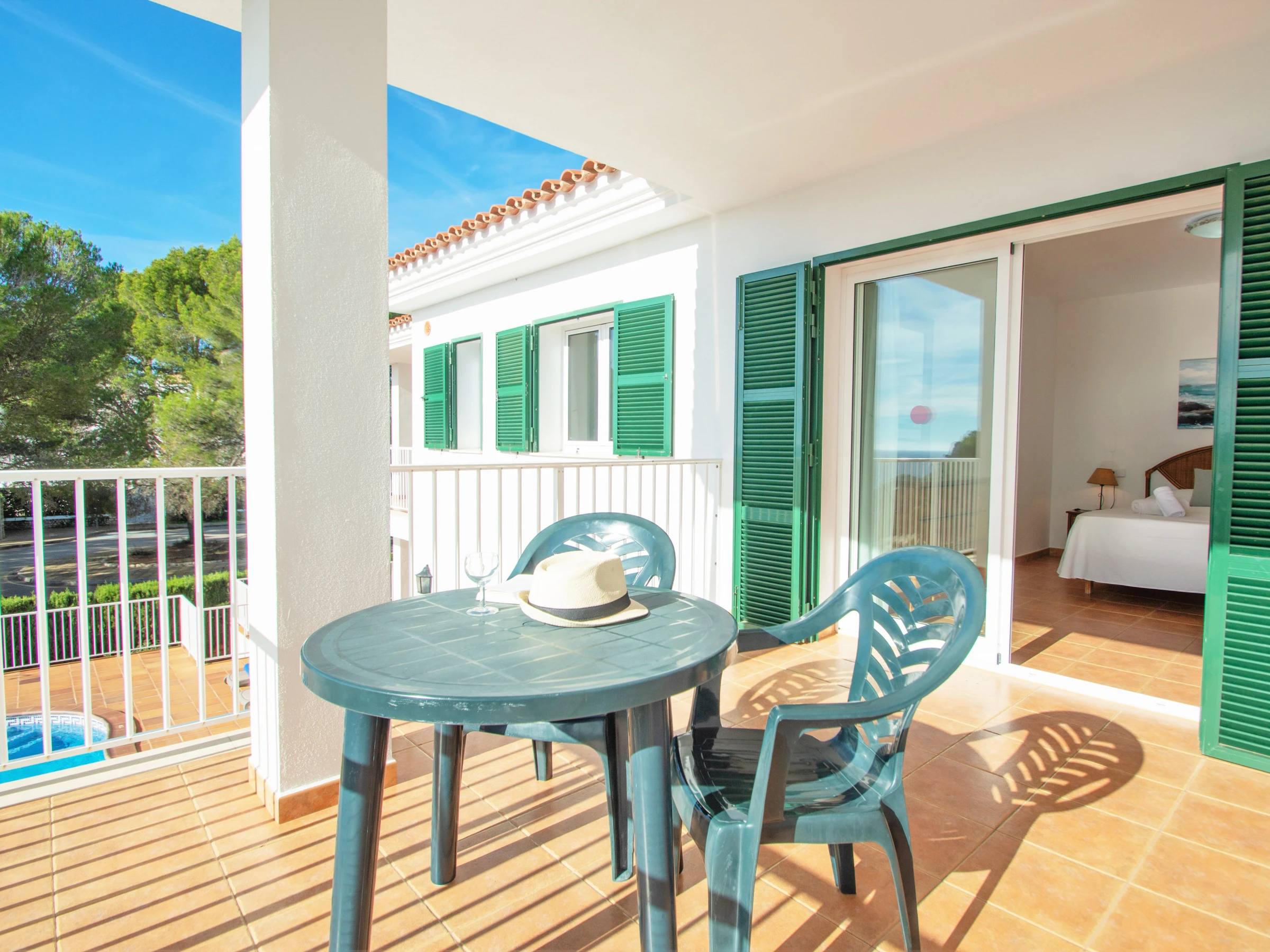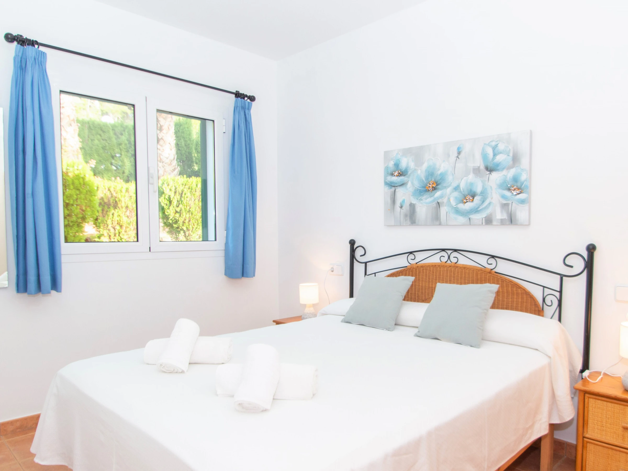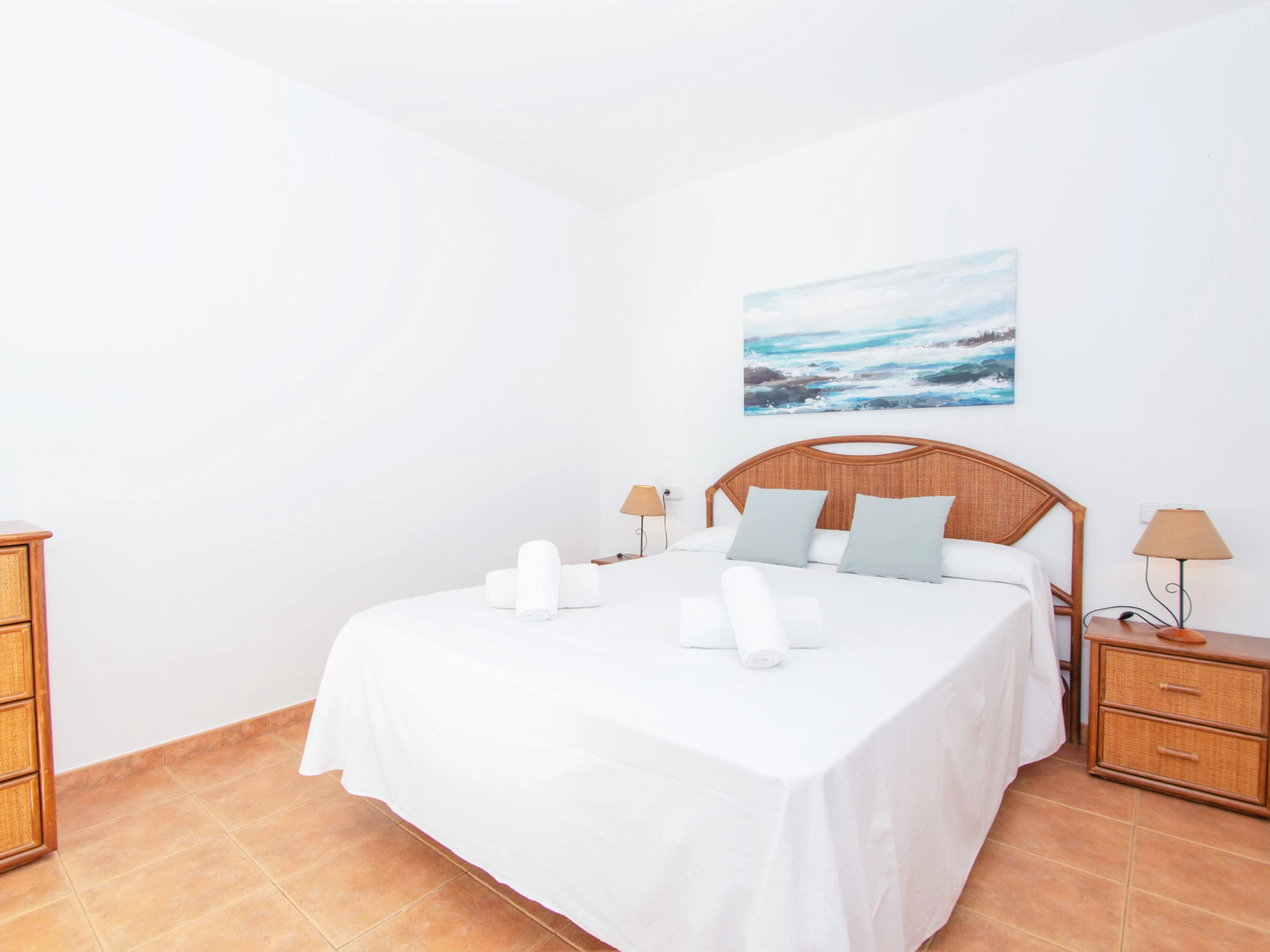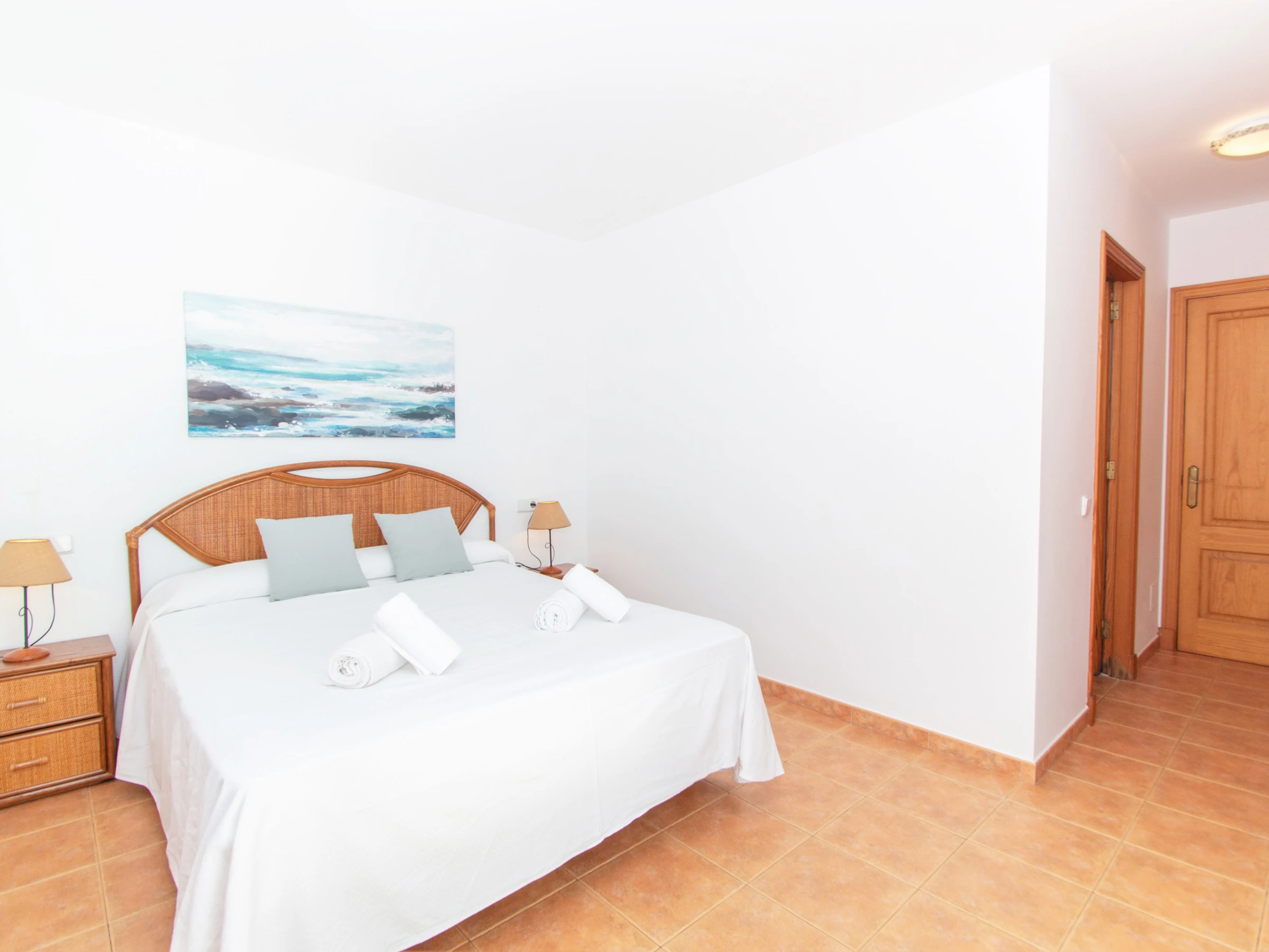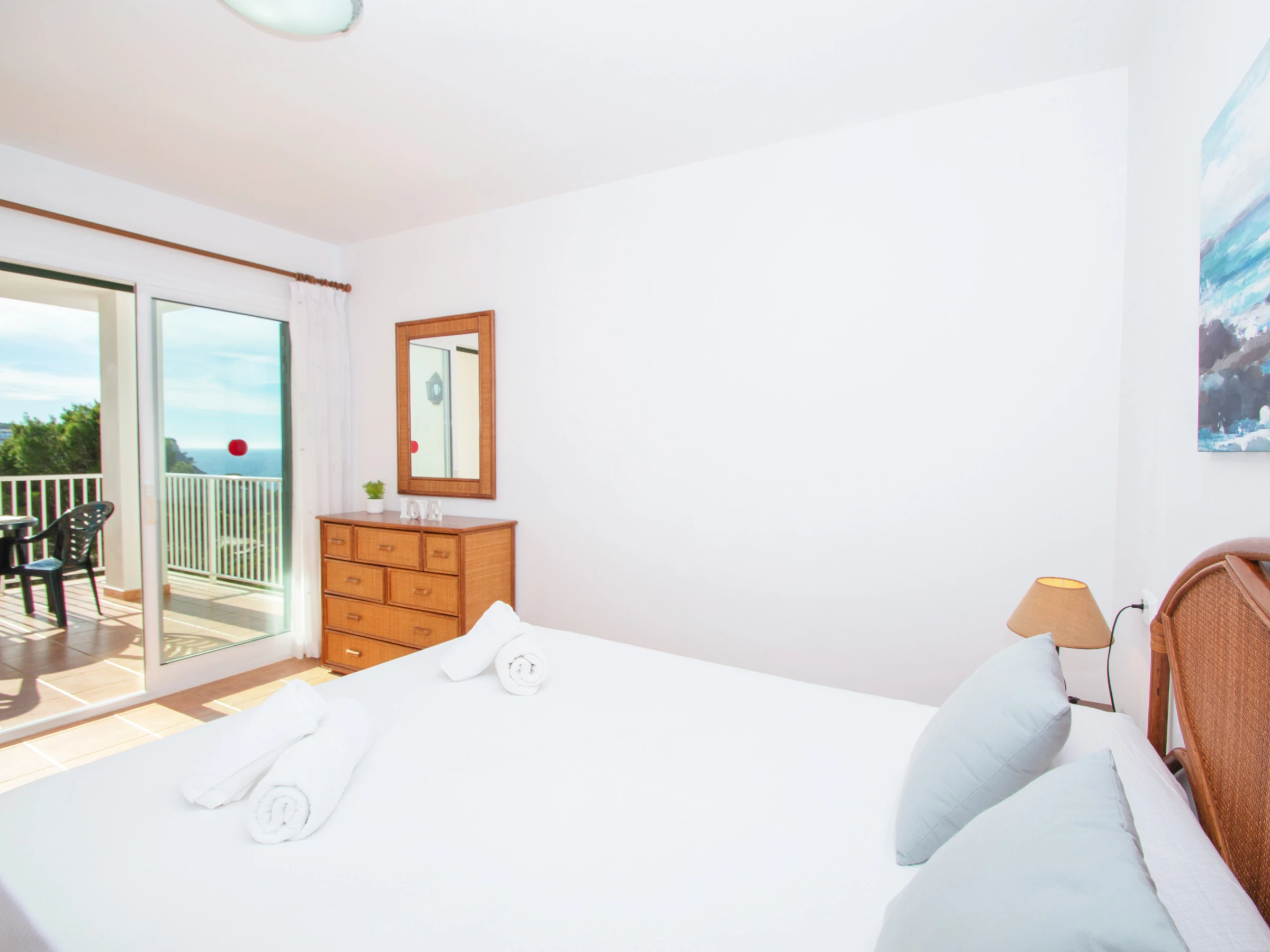 Las demás habitaciones se encuentran en el primer nivel. La primera habitación doble cuenta con dos camas individuales y están equipadas con un buen armario y aire acondicionado. El otro dormitorio está equipado con una cama individual y dispone acceso directo al balcón, que cuenta con unas bonitas vistas a la playa. A continuación, entre las dos habitaciones, encontramos el cuarto de baño total mente equipado con bañera y secador. Por último, el dormitorio principal, consta de una cómoda cama de matrimonio, un gran armario empotrado, aire acondicionado y un baño completo en suite. El baño está equipado con bañera. El dormitorio principal cuenta también con un bonito balcón y de esas maravillosas vistas a la playa de Cala Galdana, desde la cama.