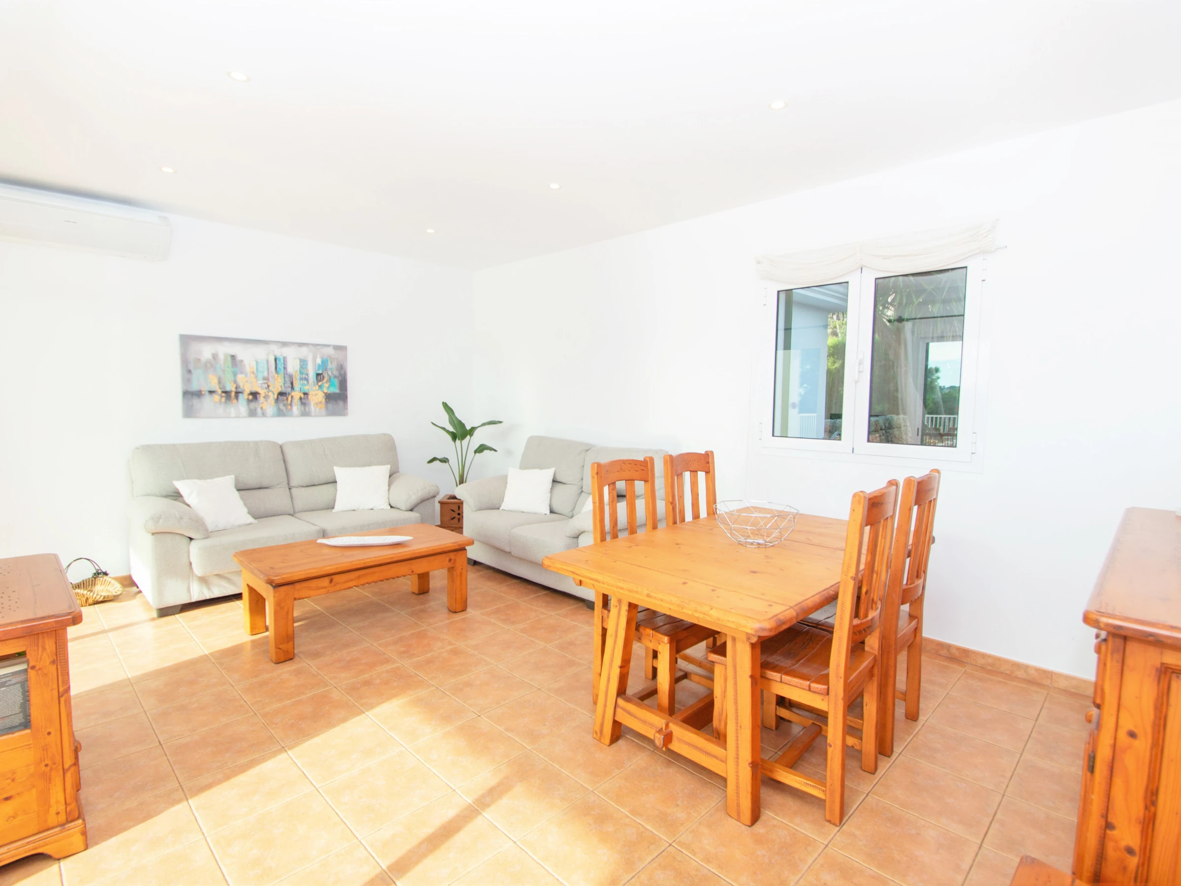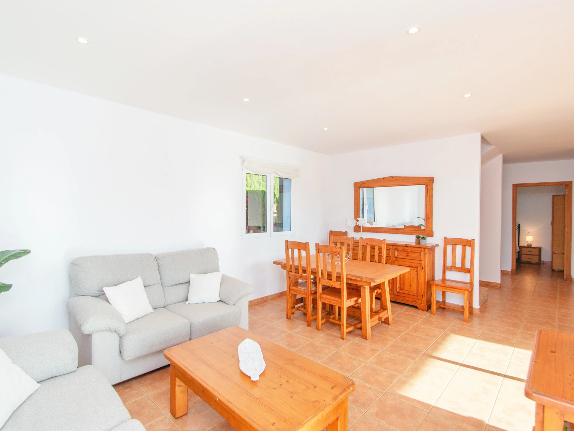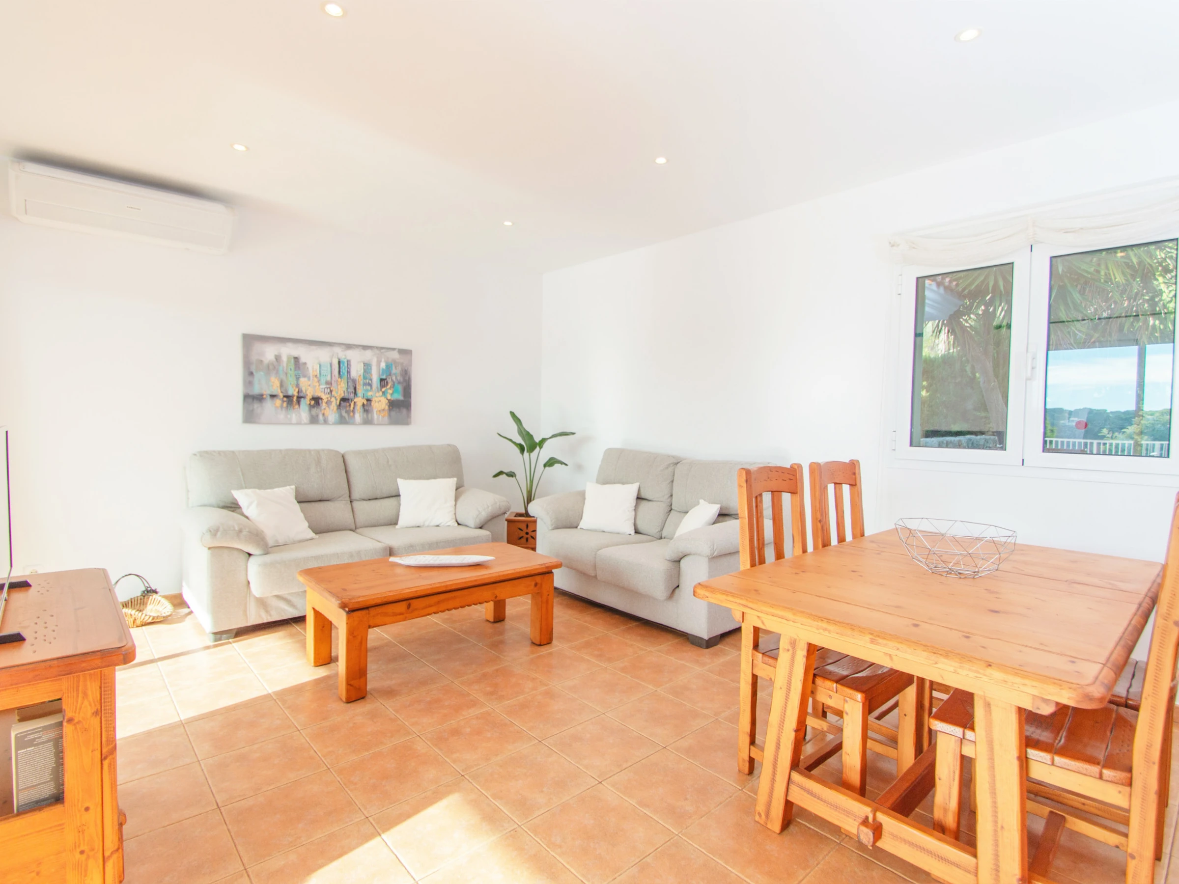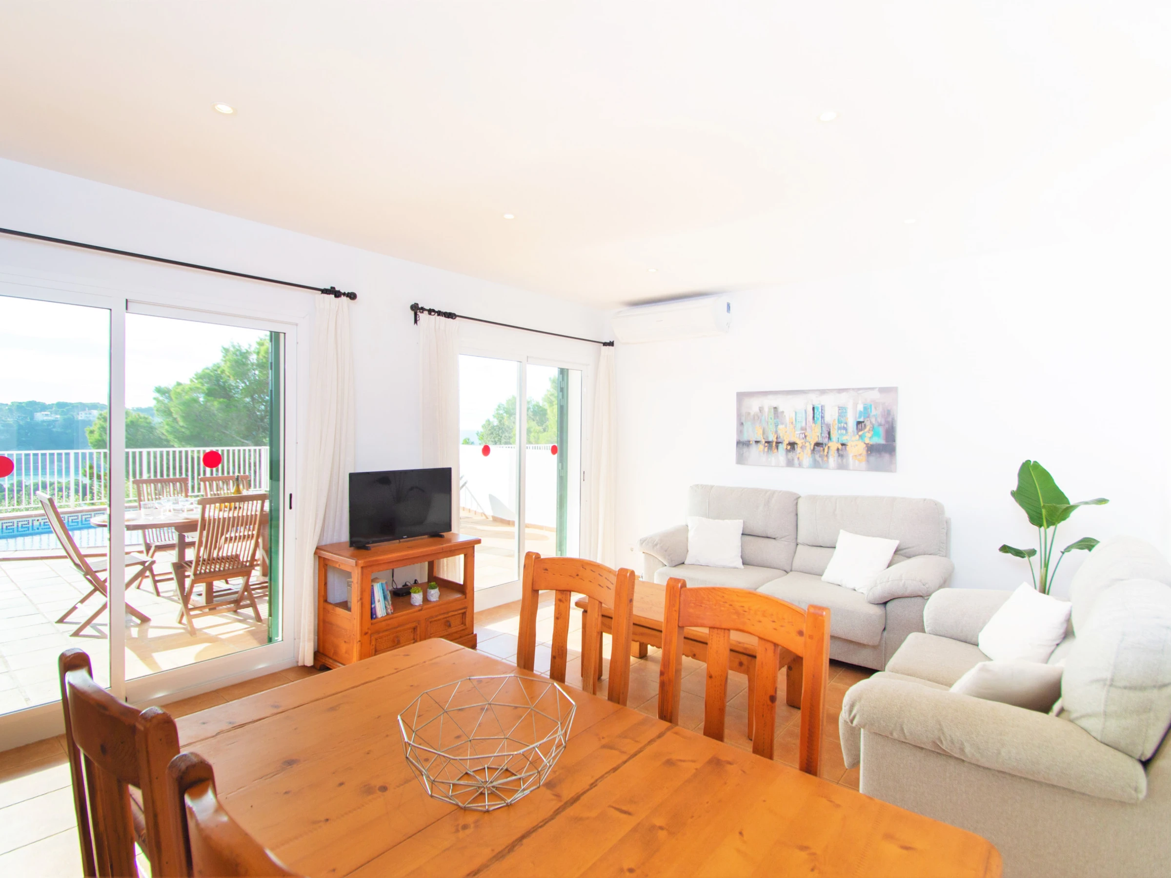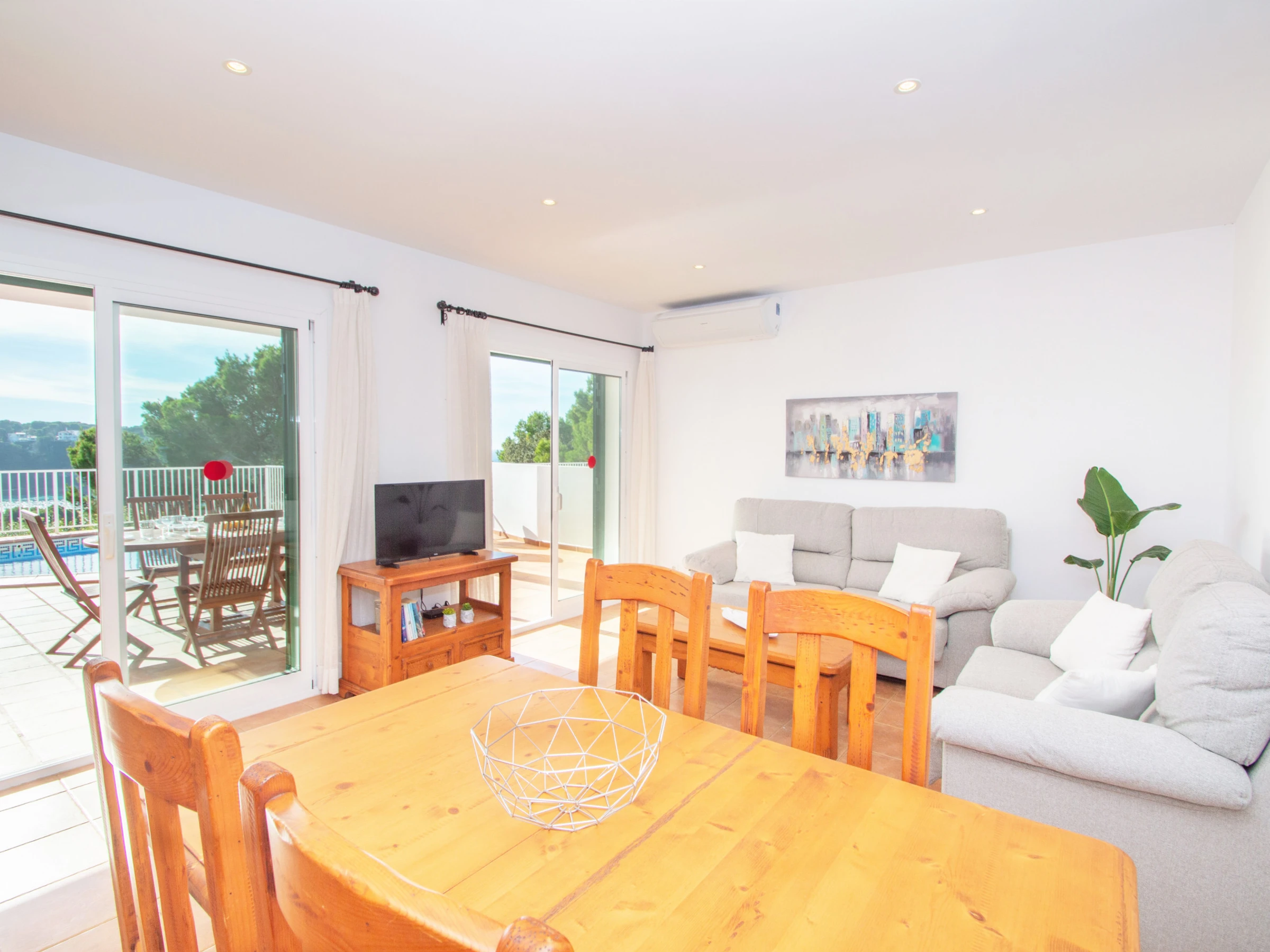 A mano izquierda del recibidor, encontramos el acogedor salón-comedor equipado con TV digital de pantalla plana vía satélite, dos sofás, una mesa y sillas para comer. Desde el salón tenemos también acceso directo a la zona de piscina, que ofrece unas vistas muy bonitas a la paya y el río de Cala Galdana. Éste es un buen sitio para relajarse y disfrutar de una copa de vino mientras disfrutas de esas maravillosas vistas de la playa.