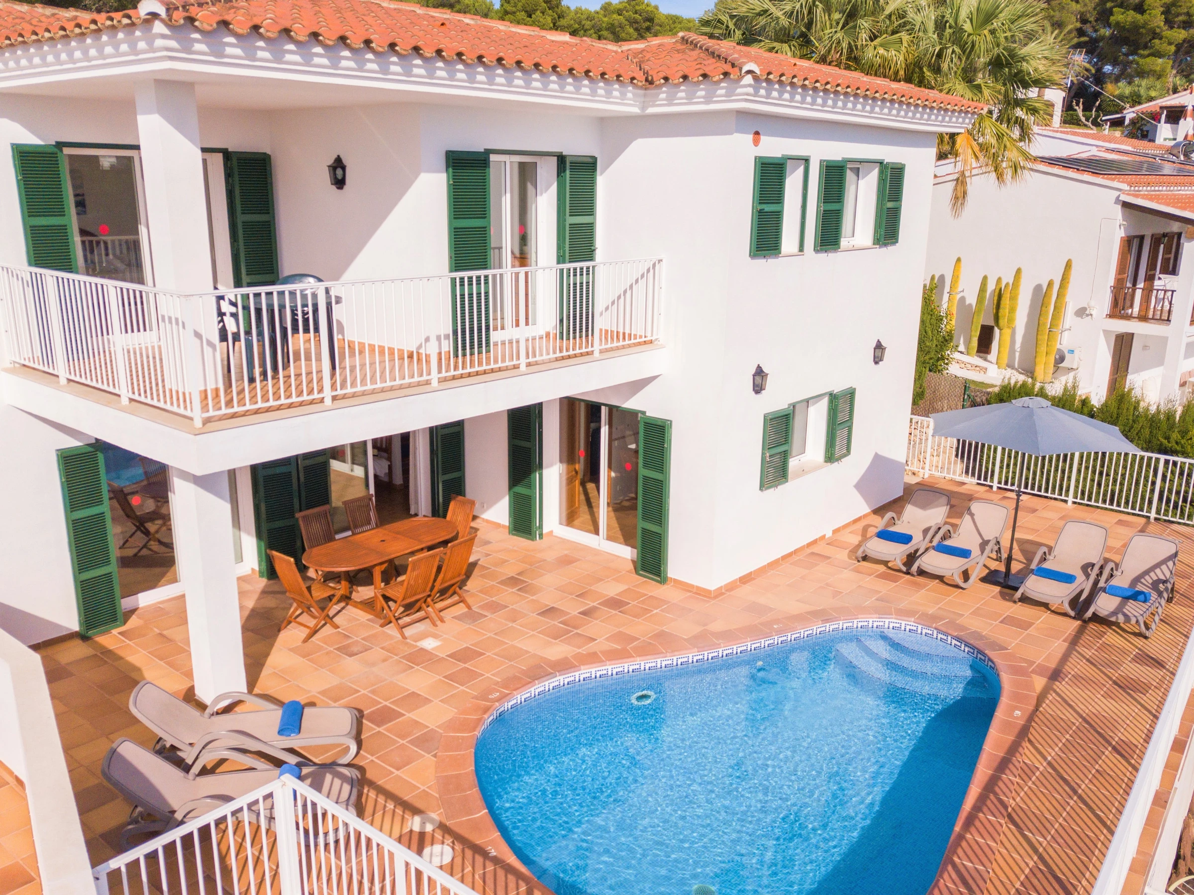 Este alquiler de Villa en Menorca está ubicado en una zona tranquila, segura, familiar, y a tan sólo 500 metros andando de la preciosa playa de Cala Galdana. A unos pocos metros de la villa hay un paso público con escaleras para bajar a la playa y a la zona comercial. Además, esta villa es apta para personas con movilidad reducida.