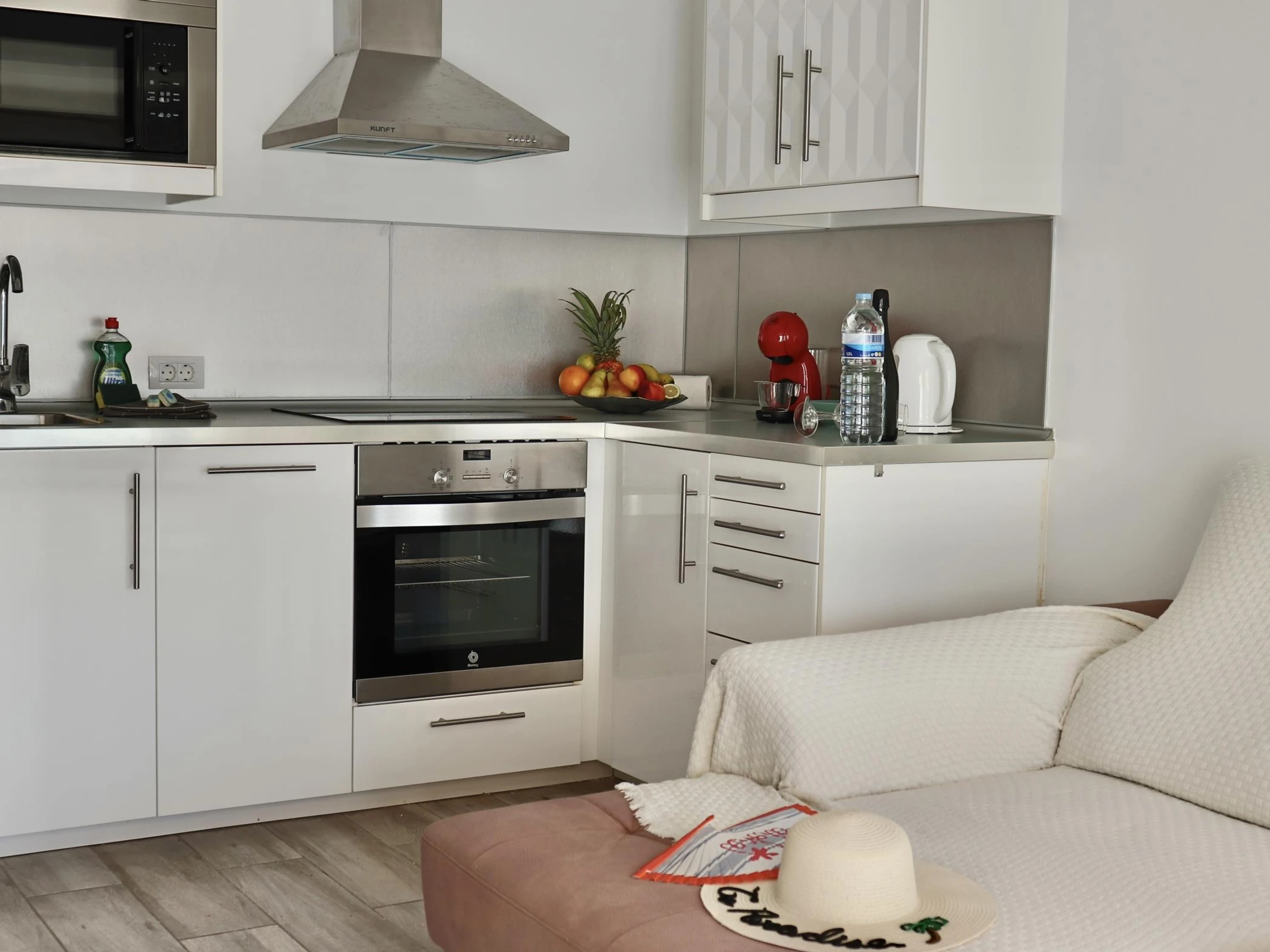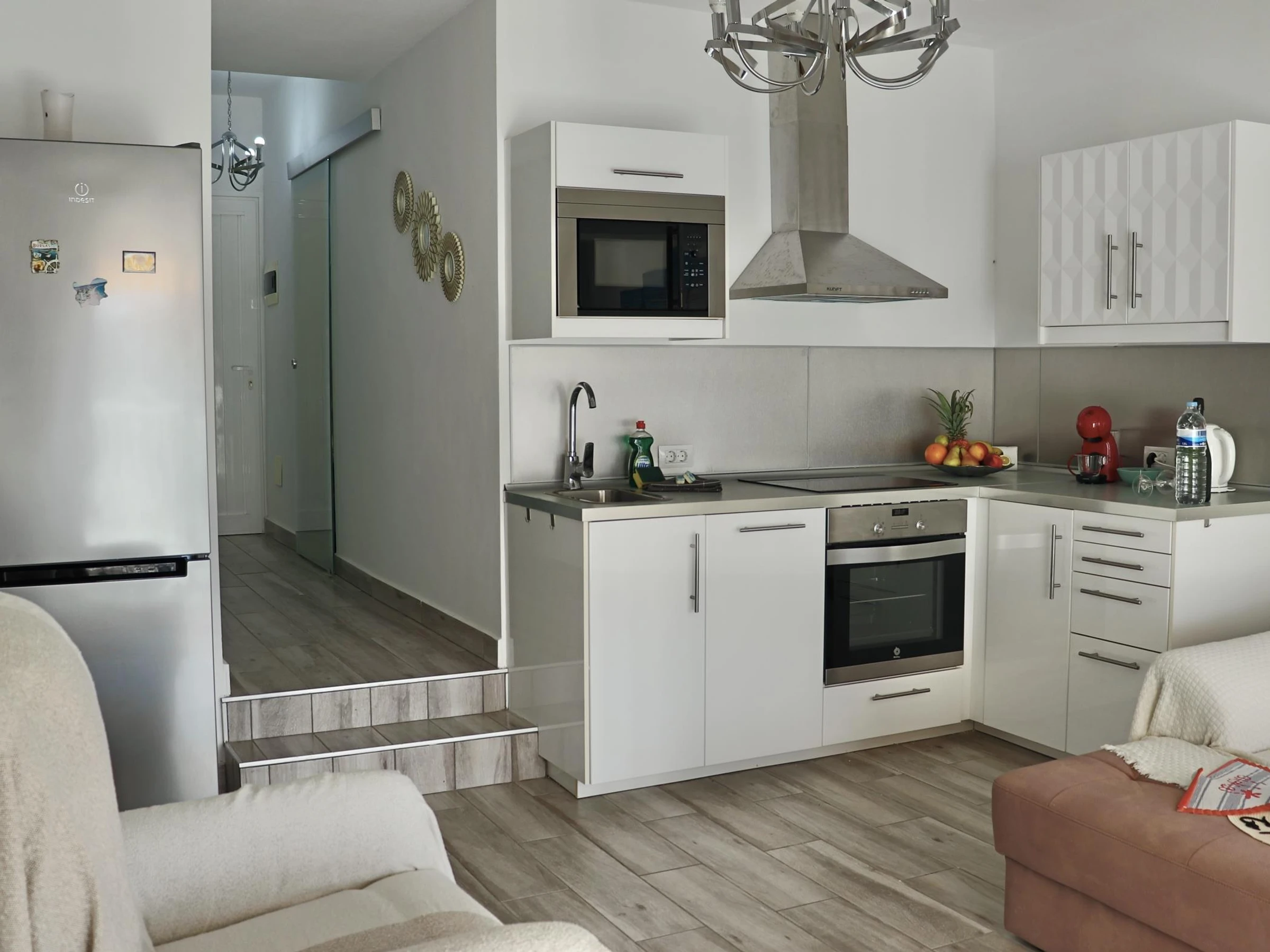 El apartamento cuenta con dos habitaciones bien iluminadas y una decoración elegante que te hará sentir como en casa. Cada habitación está equipada con su propio aire acondicionado, asegurando que tu estancia sea siempre cómoda, sin importar la temperatura exterior. Además, para los amantes de la gastronomía, la cocina está completamente equipada con una cafetera, tetera, horno y microondas, para que puedas preparar tus comidas favoritas y disfrutarlas en la terraza mientras contemplas las vistas al mar.