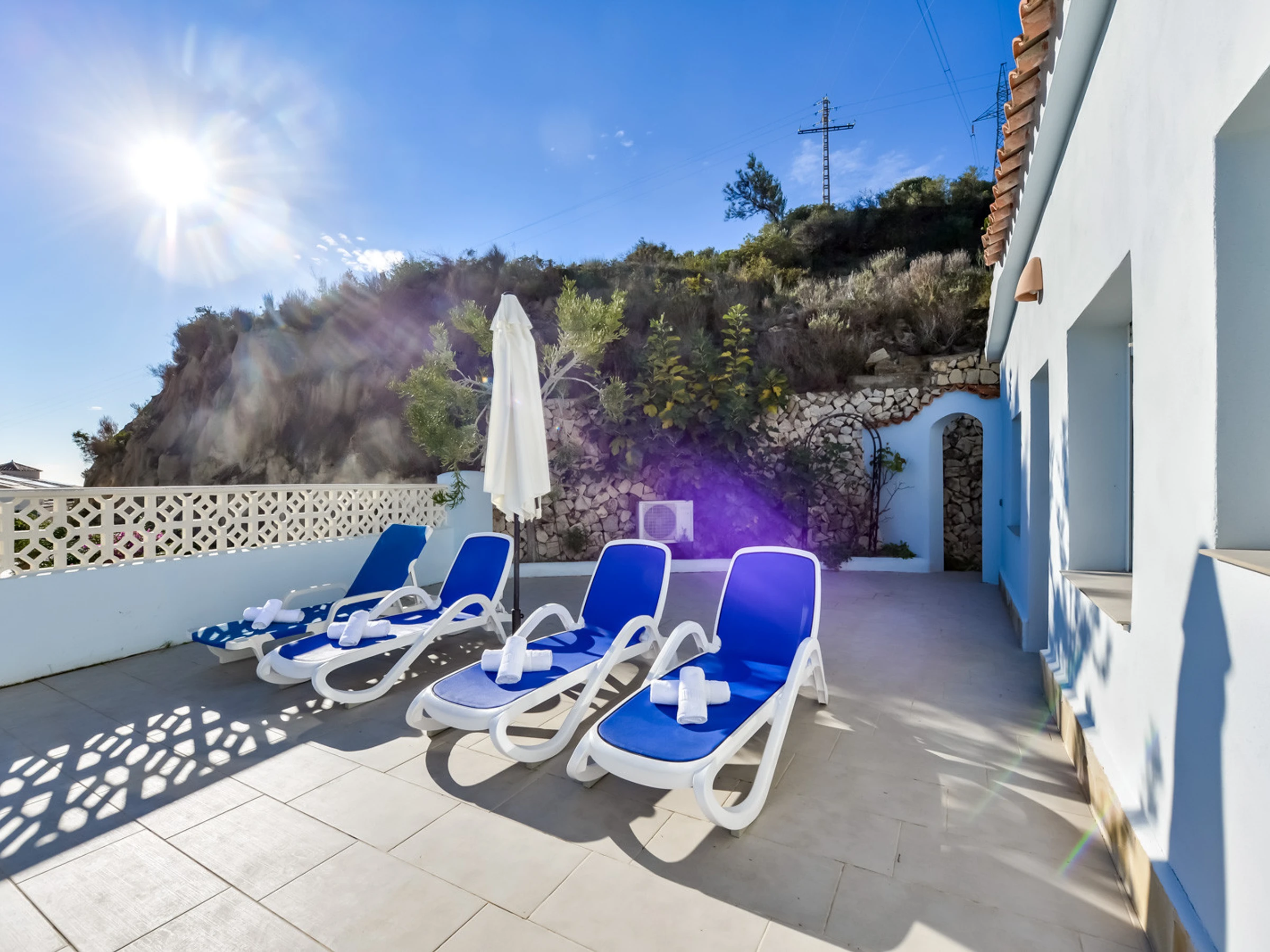 Exterior de la villa: La villa cuenta con una bonita terraza con hamacas para tomar el sol, una barbacoa de obra con zona para comer, una piscina privada con escaleras de obra y unas bonitas vistas al mar. Hay espacio para aparcar 2 vehículos dentro de la parcela pero no esta vallada.