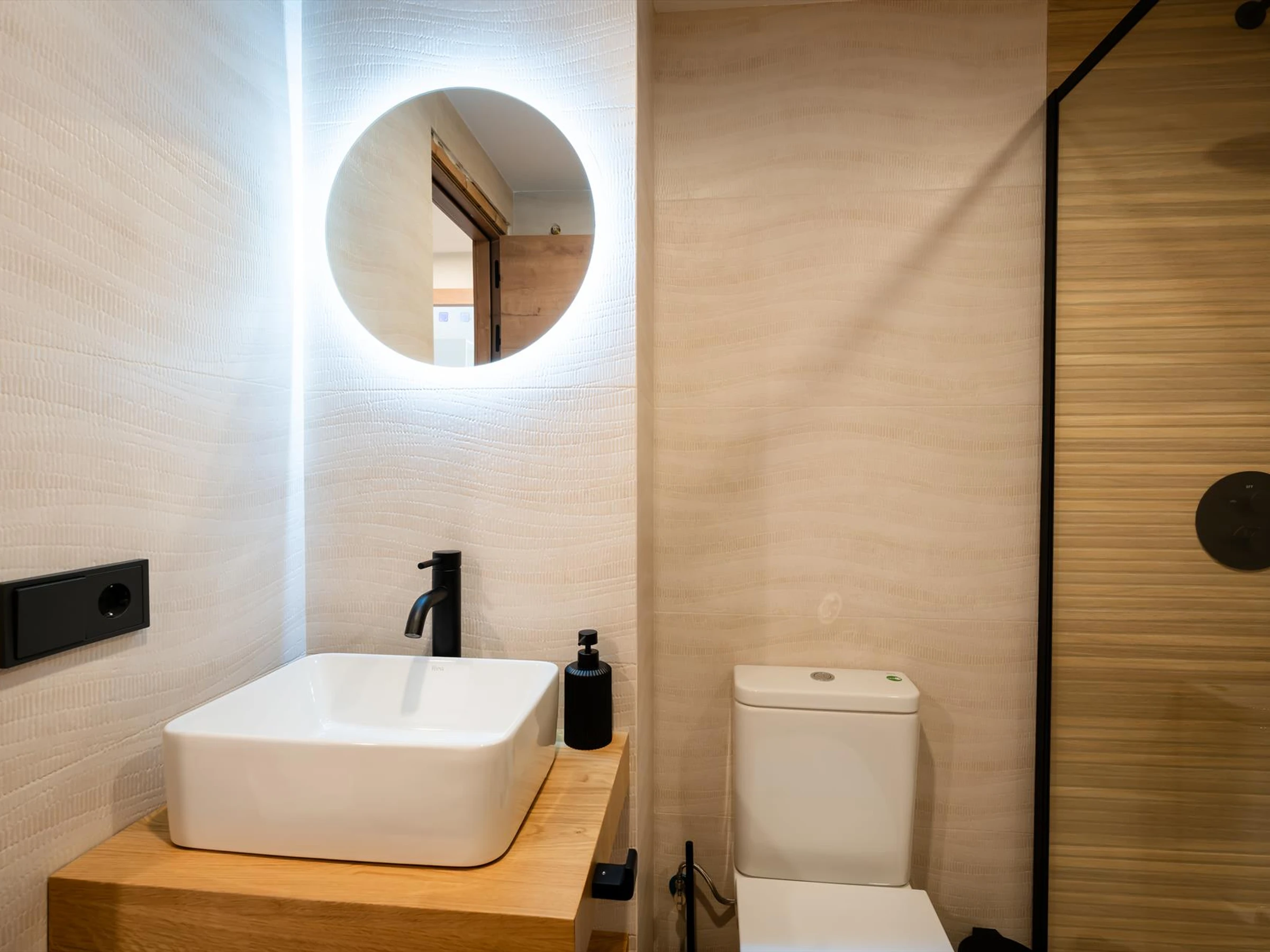 * cuarto de baño con lavabo, ducha, bidet, váter y secador de peloExterior