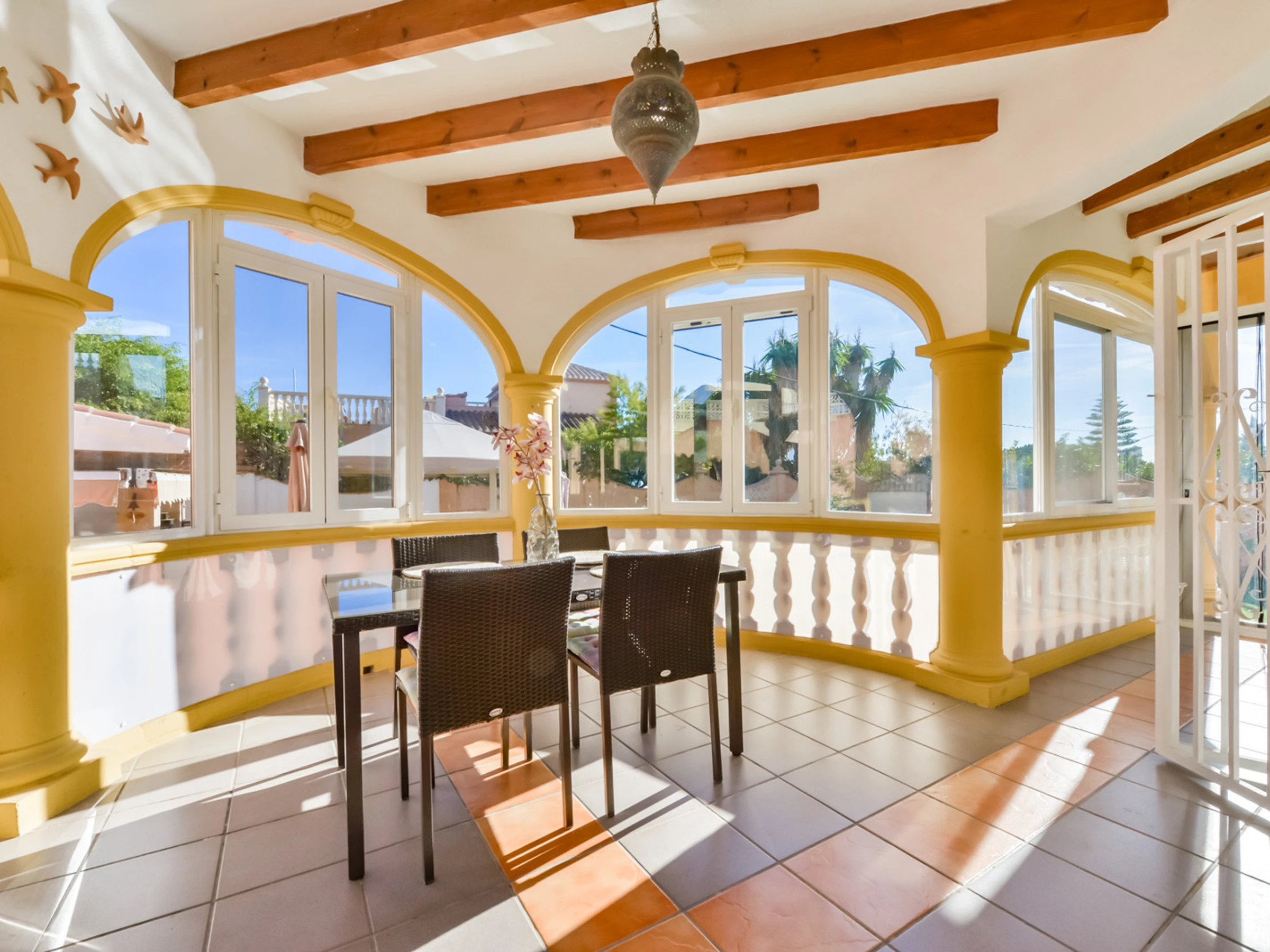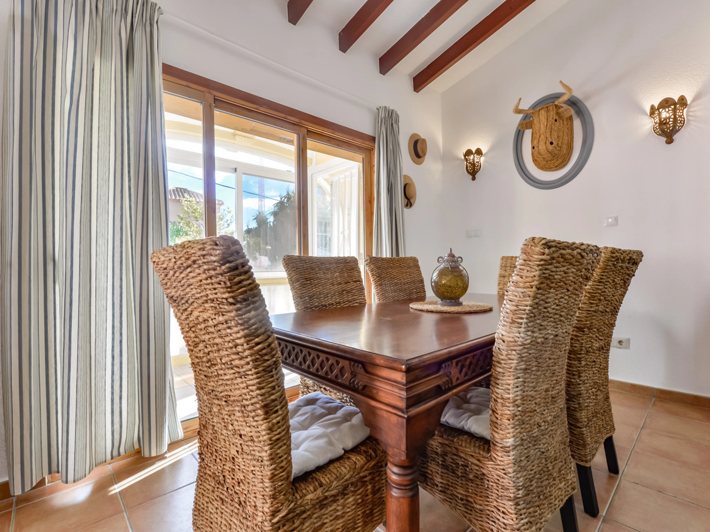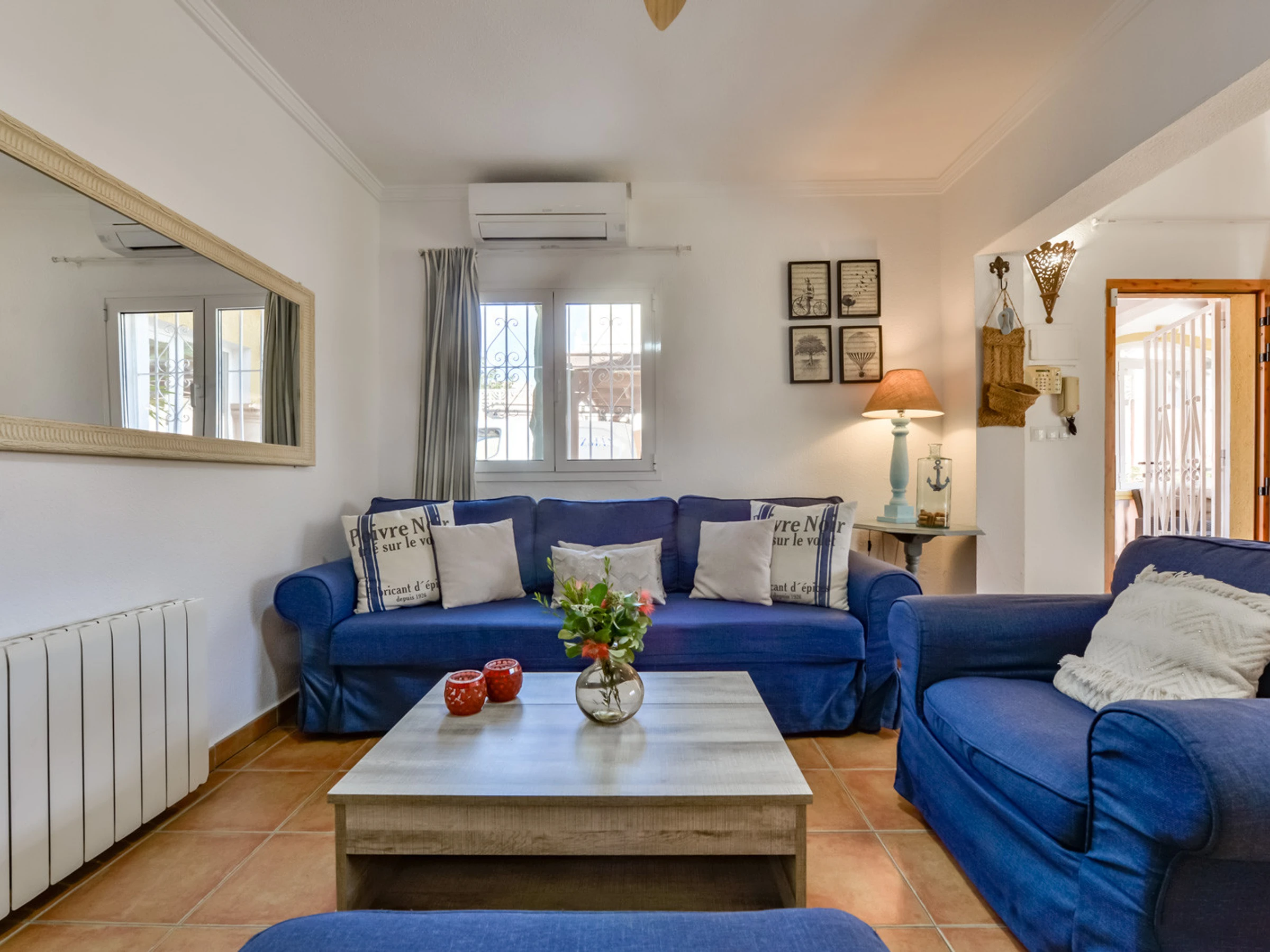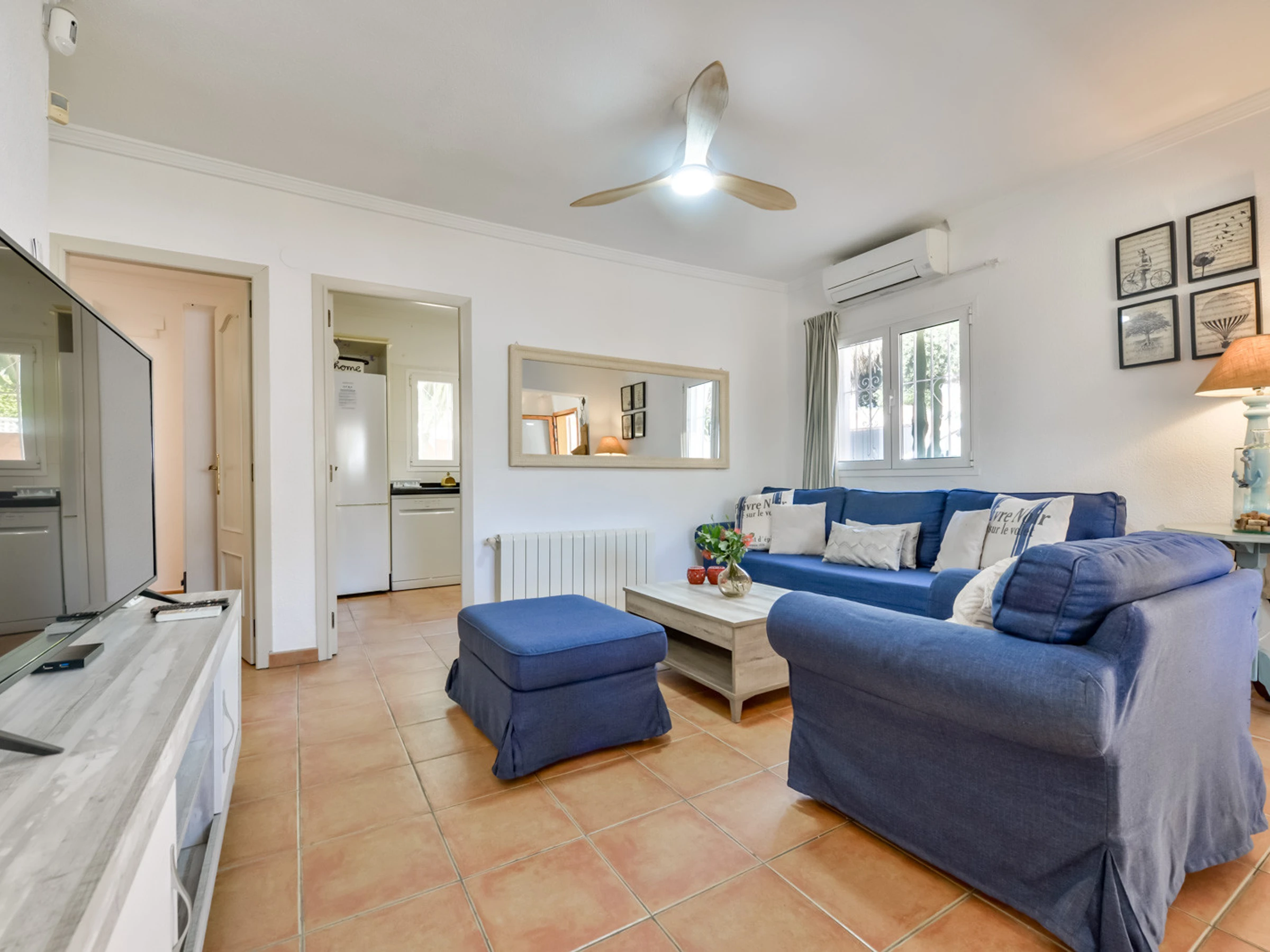Con 120 m² de vivienda distribuidos en una única planta, la villa Thalea es una casa cómoda, perfecta para personas que prefieran tener pocas escaleras. Lo primero que encontramos en una agradable terraza totalmente acristalada con muchísima luz natural perfecta para disfrutar todo el año, con mesa para desayunar o comer. Desde este espacio llagamos al salón comedor con una zona de sofá y smart TV, aire acondicionado, ventilador de techo y una zona para comer o cenar en el interior con unas cómodas sillas para 6 comensales. Desde el salón accedemos a la cocina completamente equipada con lavavajillas, agua filtrada y todo lo necesario para cocinar con todos lo necesario. Una habitación doble con cama de 150 cm con baño en suite con bañera, ventilador de techo y aire acondicionado. Un segundo dormitorio con cama de 180cm, aire acondicionado y ventilador de techo. Un baño completo con bañera situado en el pasillo y el tercer dormitorio con una litera y ventilador de techo.