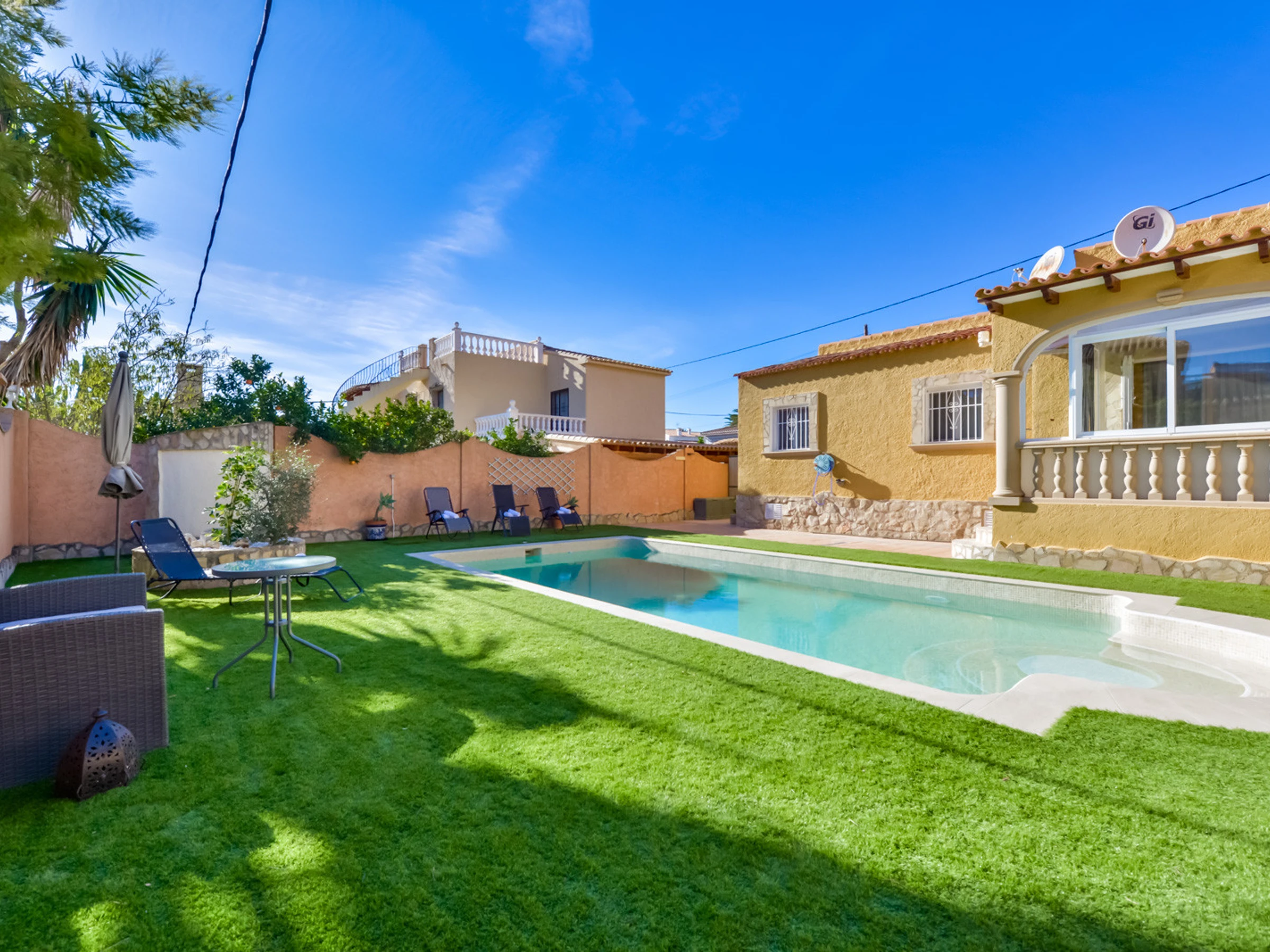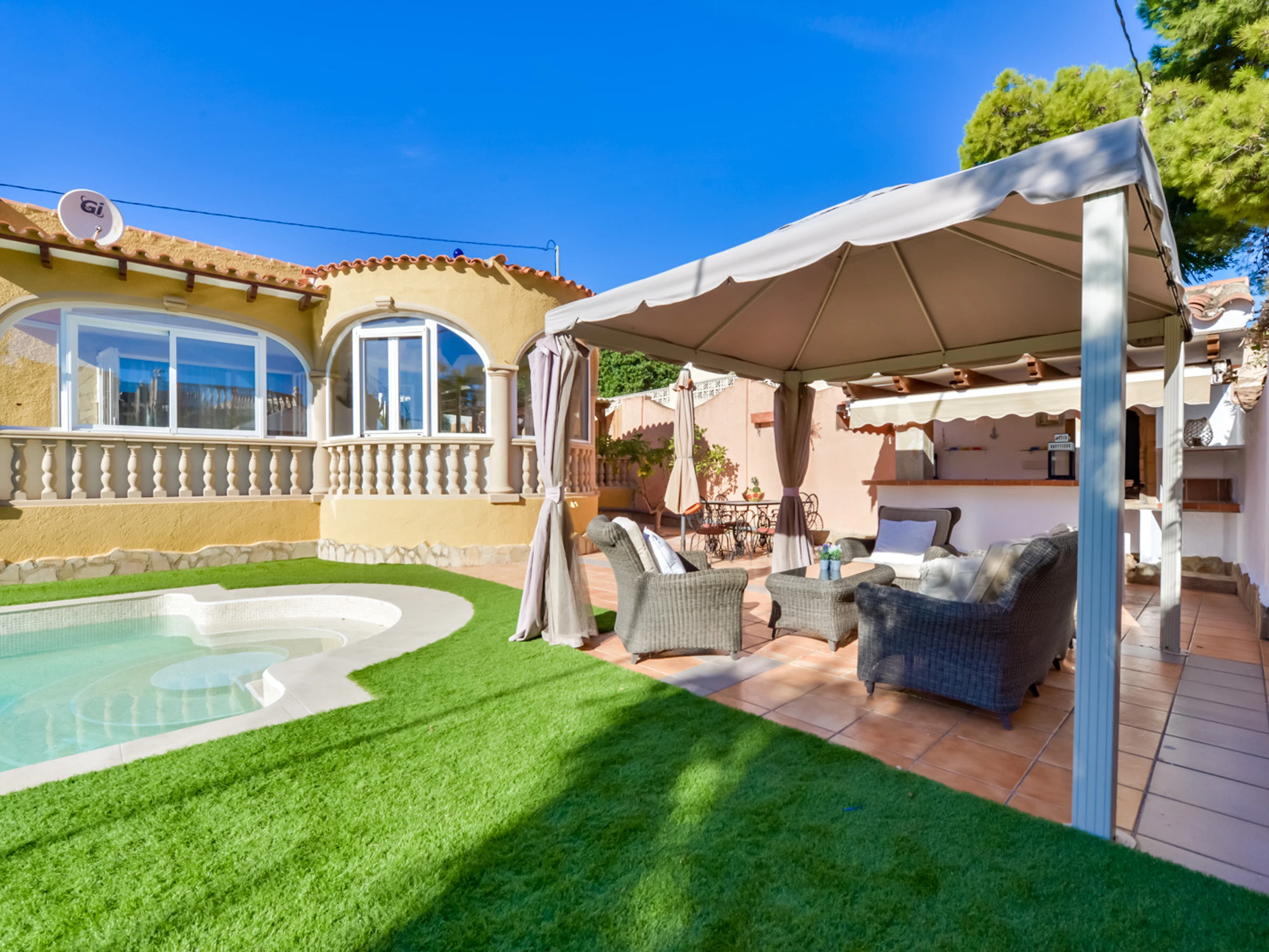 En la parte delantera de la villa encontramos la piscina, con escaleras de obra para acceder a su interior, una zona de césped artificial con tumbonas para tomar el sol, ducha exterior y una agradable pérgola con sofás de jardín para relajarse junto a la piscina, una cocina de verano con BBC de obra y fregadero.