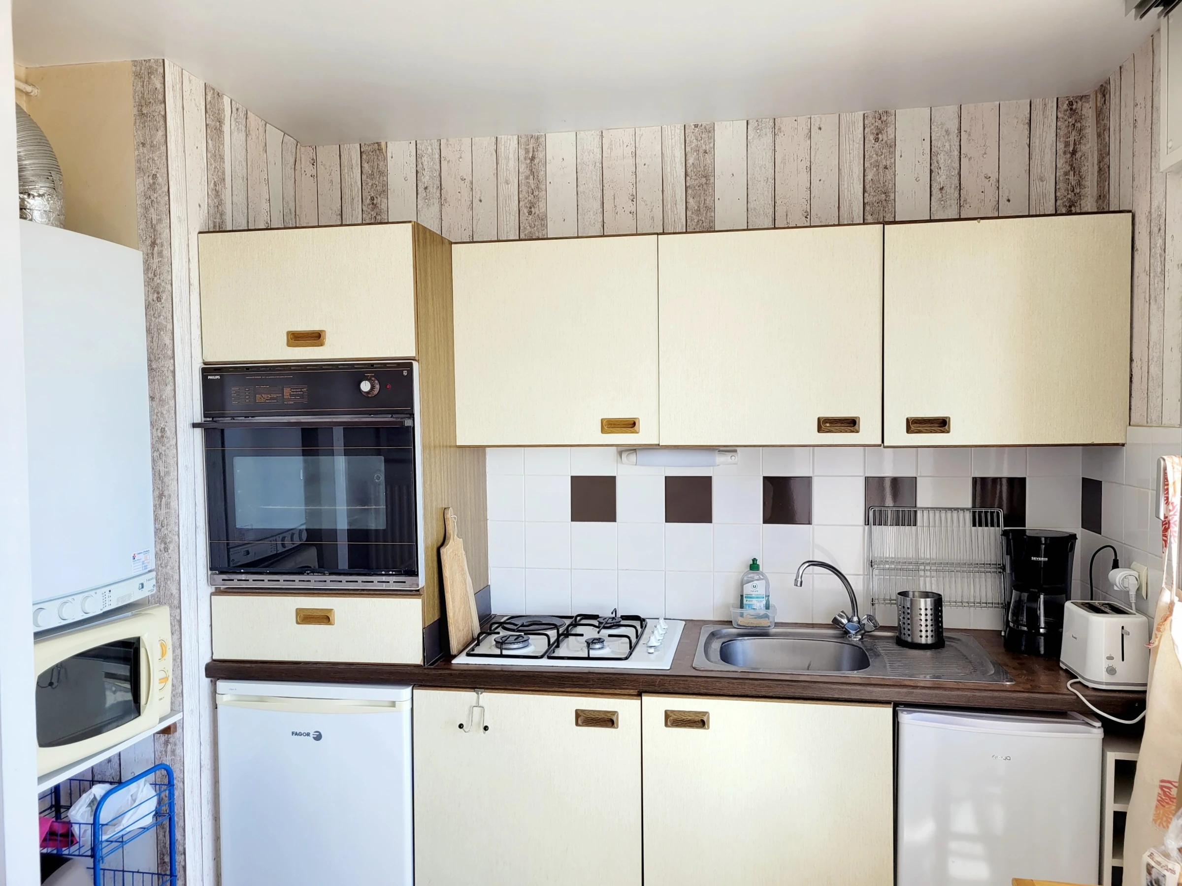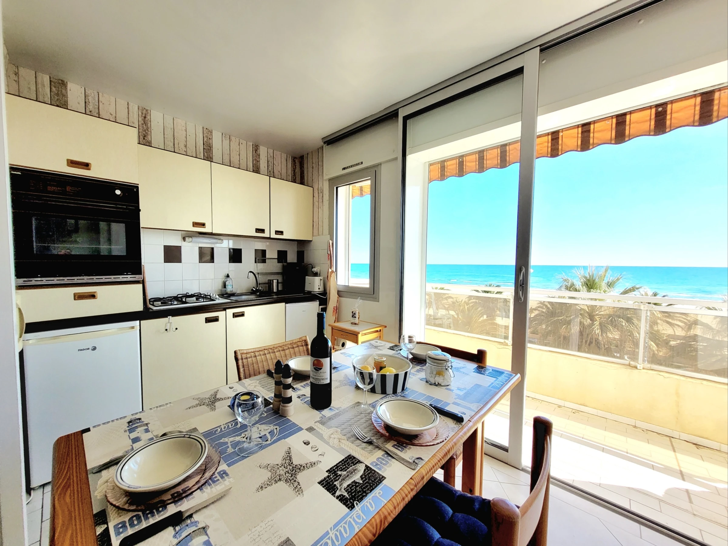 Precioso salón amplio y luminoso (clic-clac 140), zona de cocina equipada con un gran ventanal, preciosa apertura a la terraza y espléndidas vistas al mar. Dormitorio (2 camas individuales), baño y aseo independiente.