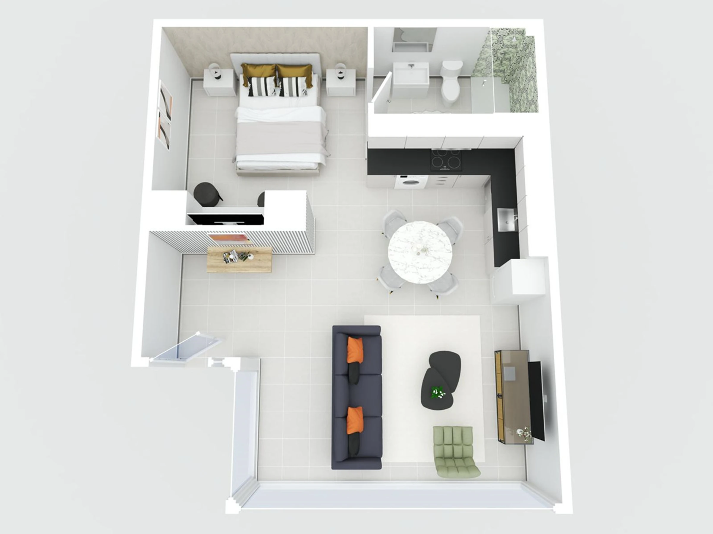 La zona de descanso dispone de una cómoda cama de matrimonio y una pequeña televisión, proporcionando un ambiente perfecto para relajarse. El cuarto de baño, amplio y funcional, está equipado con una ducha moderna.