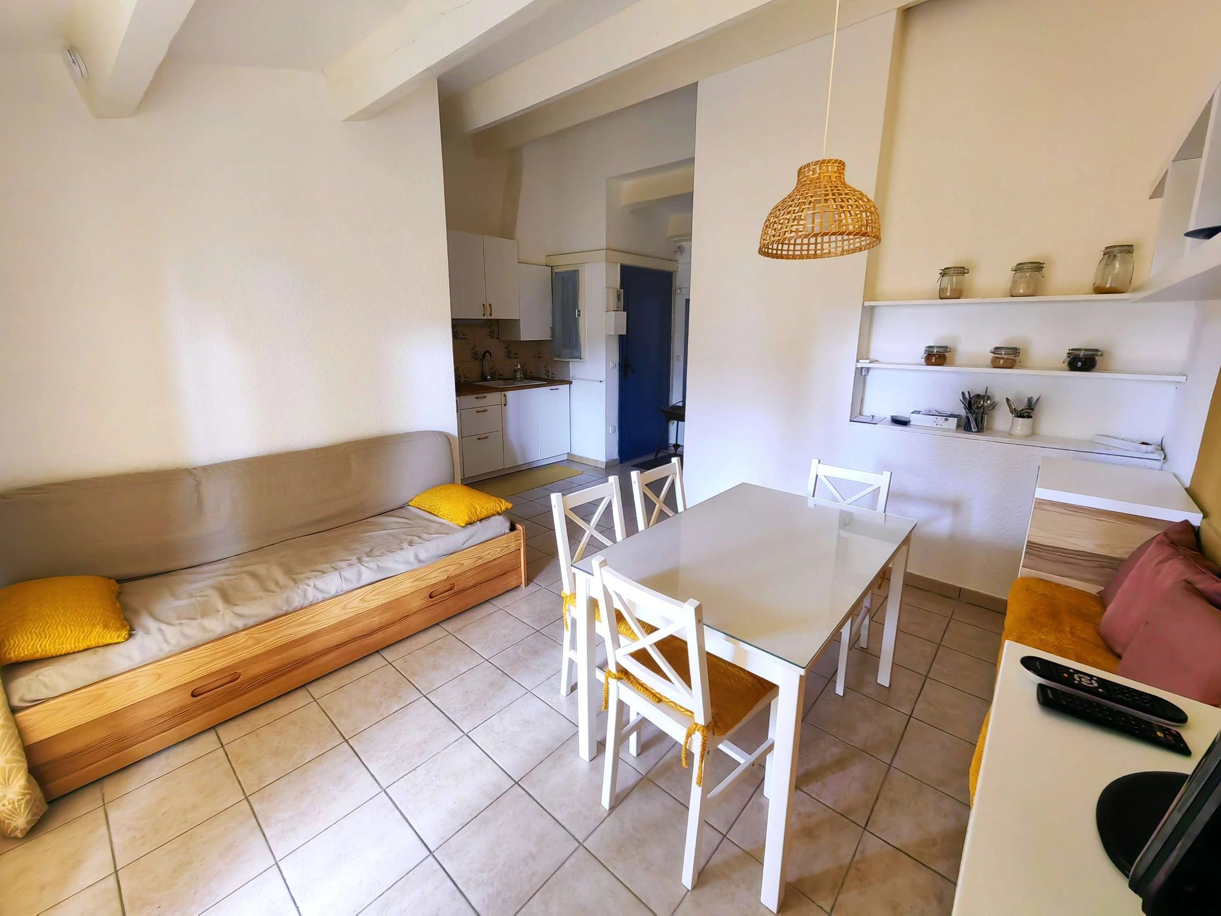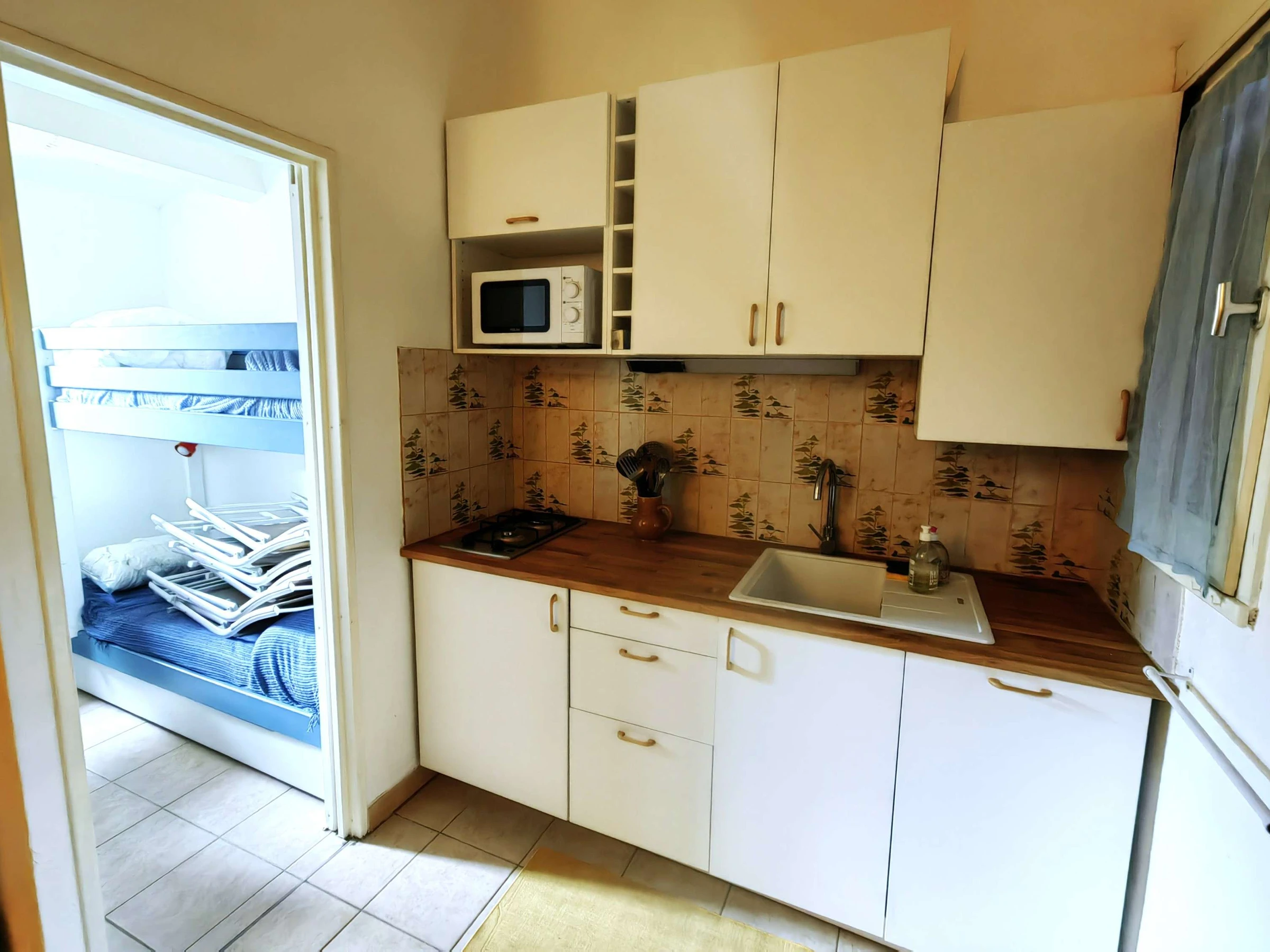 Esta villa completamente renovada y climatizada (2025), le ofrece un amplio salón con sofá (nuevo y cómodo), TV, comedor: mesa y sillas, cocina abierta y equipada (2 quemadores eléctricos, microondas, lavavajillas, refrigerador, cafetera eléctrica, tostadora).