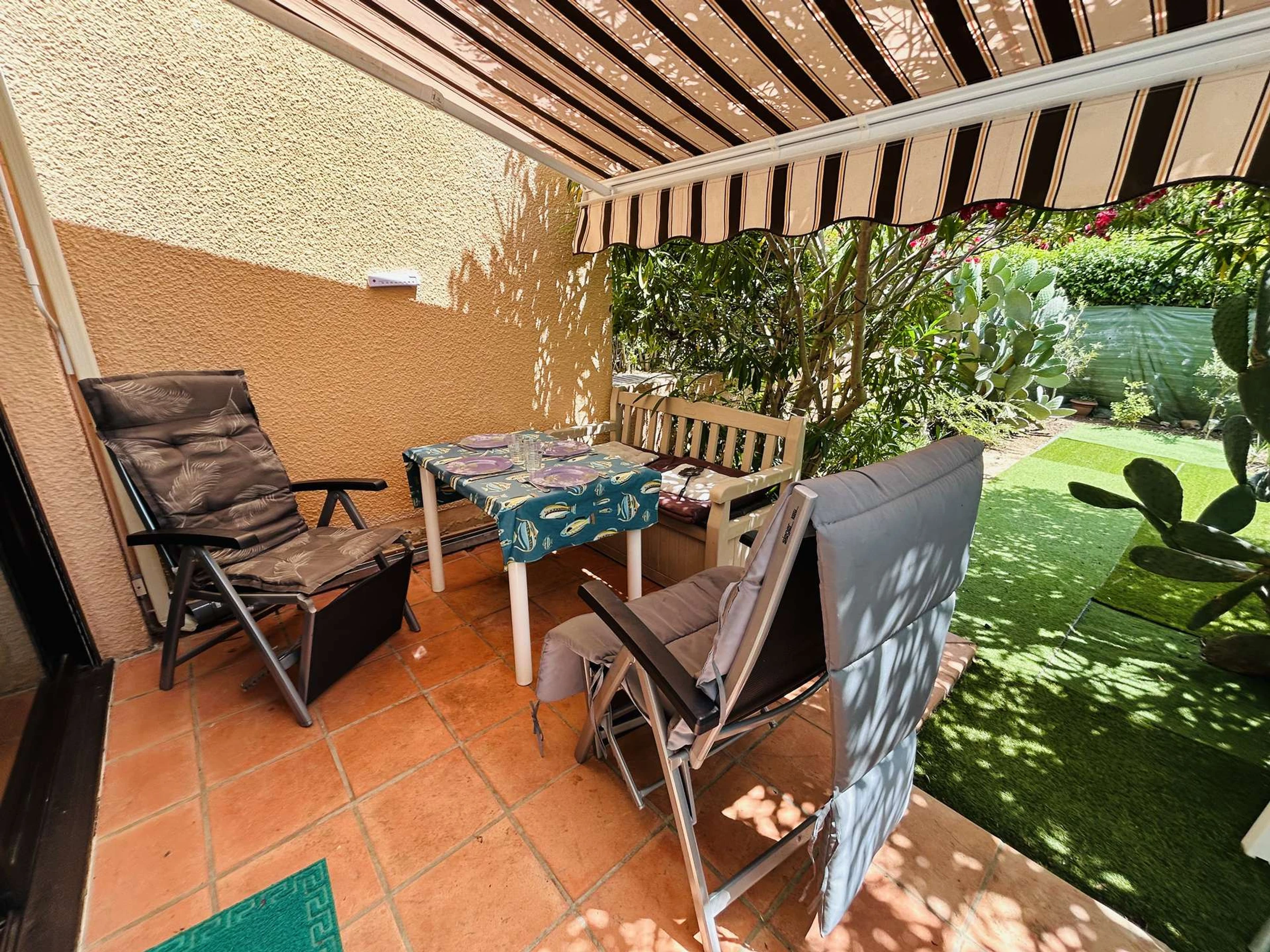 Las ventajas de este alojamiento junto al mar: una agradable y espaciosa terraza y aparcamiento privado dentro de la residencia.