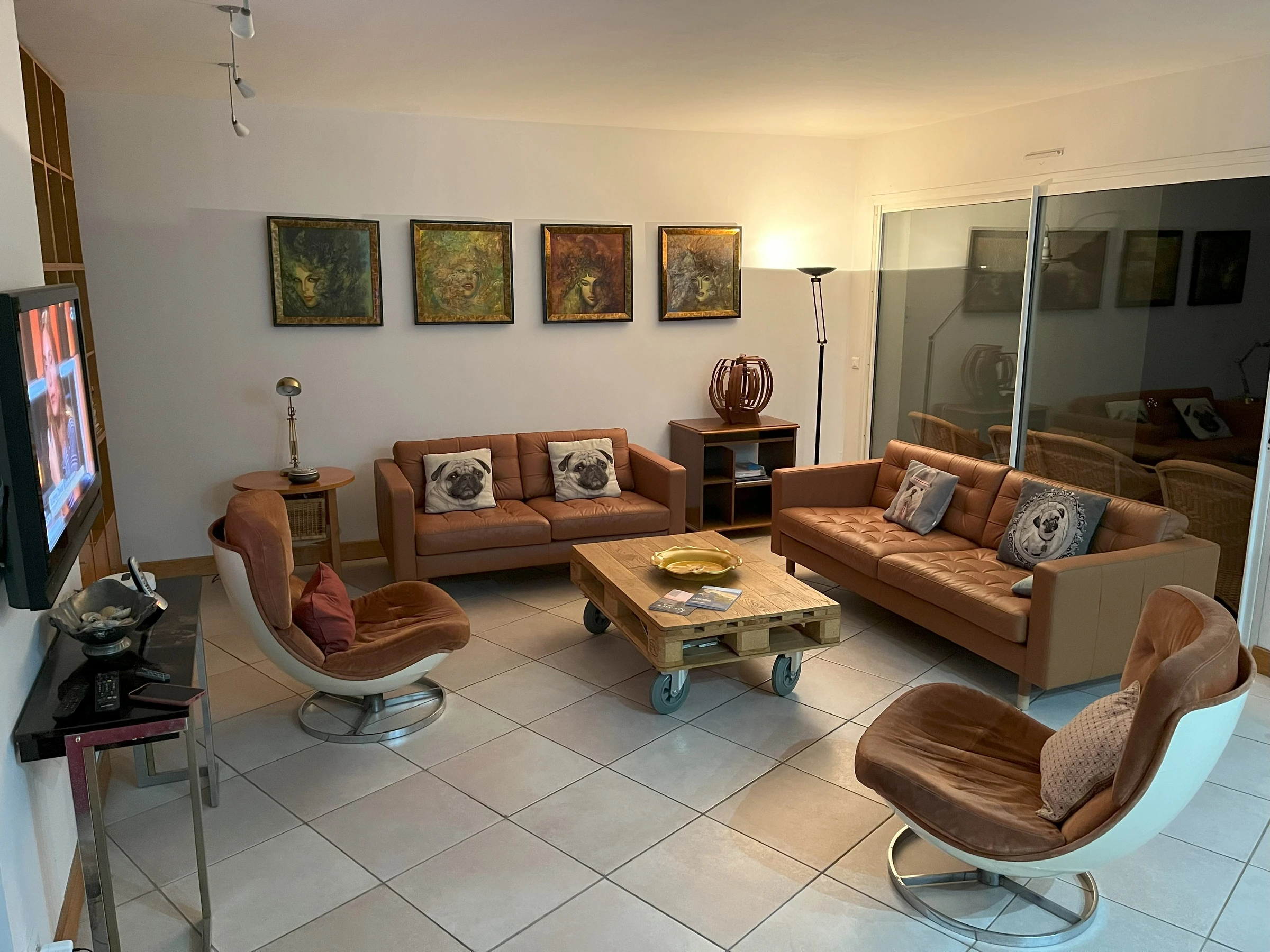 En la planta baja, descubrirá un quinto dormitorio con una cama de 160 cm que da a un amplio y luminoso salón y a su comedor. La cocina, totalmente equipada (cafetera Nespresso), se encuentra contigua y da a la terraza exterior.