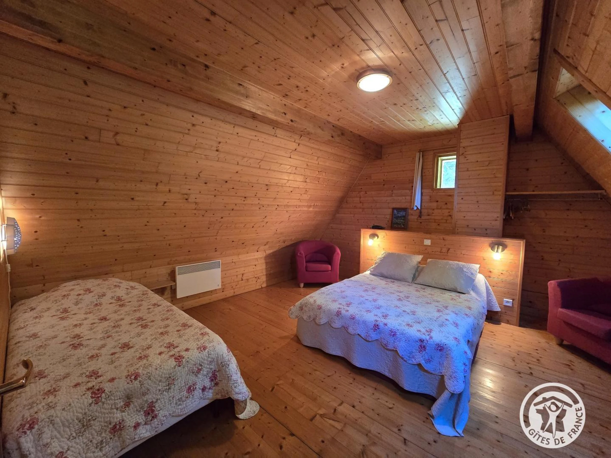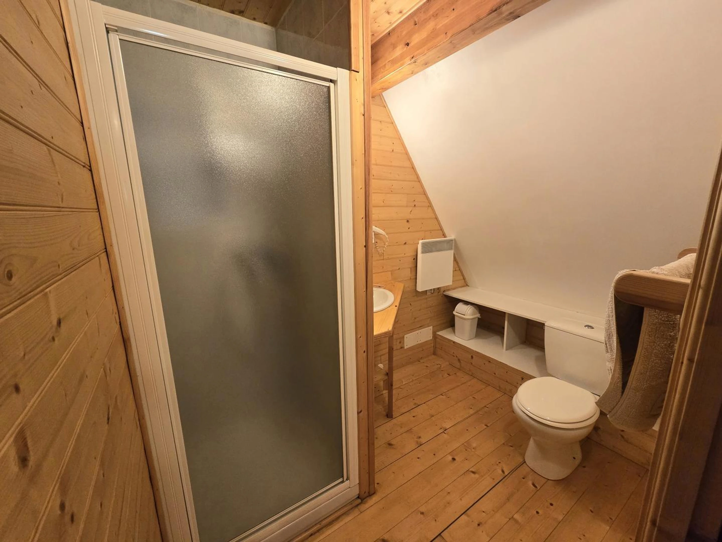La zona de noche de la planta superior consta de un dormitorio con una cama doble (140x190 cm) y una cama individual (90x190 cm), y un baño con ducha e inodoro.